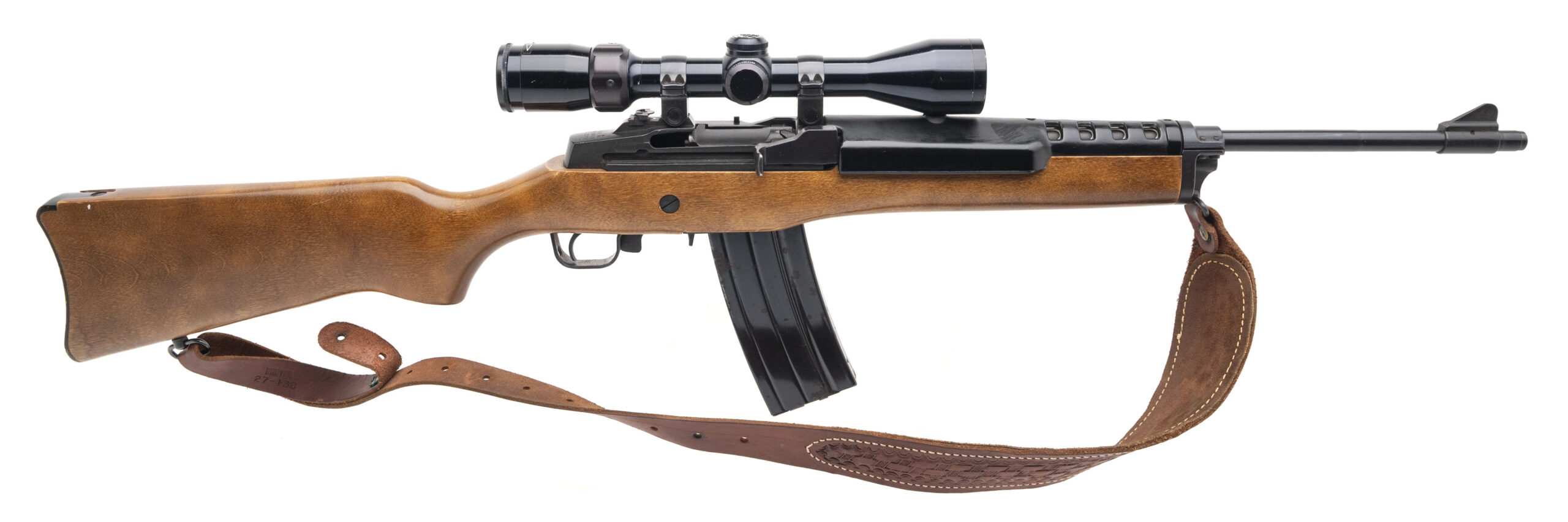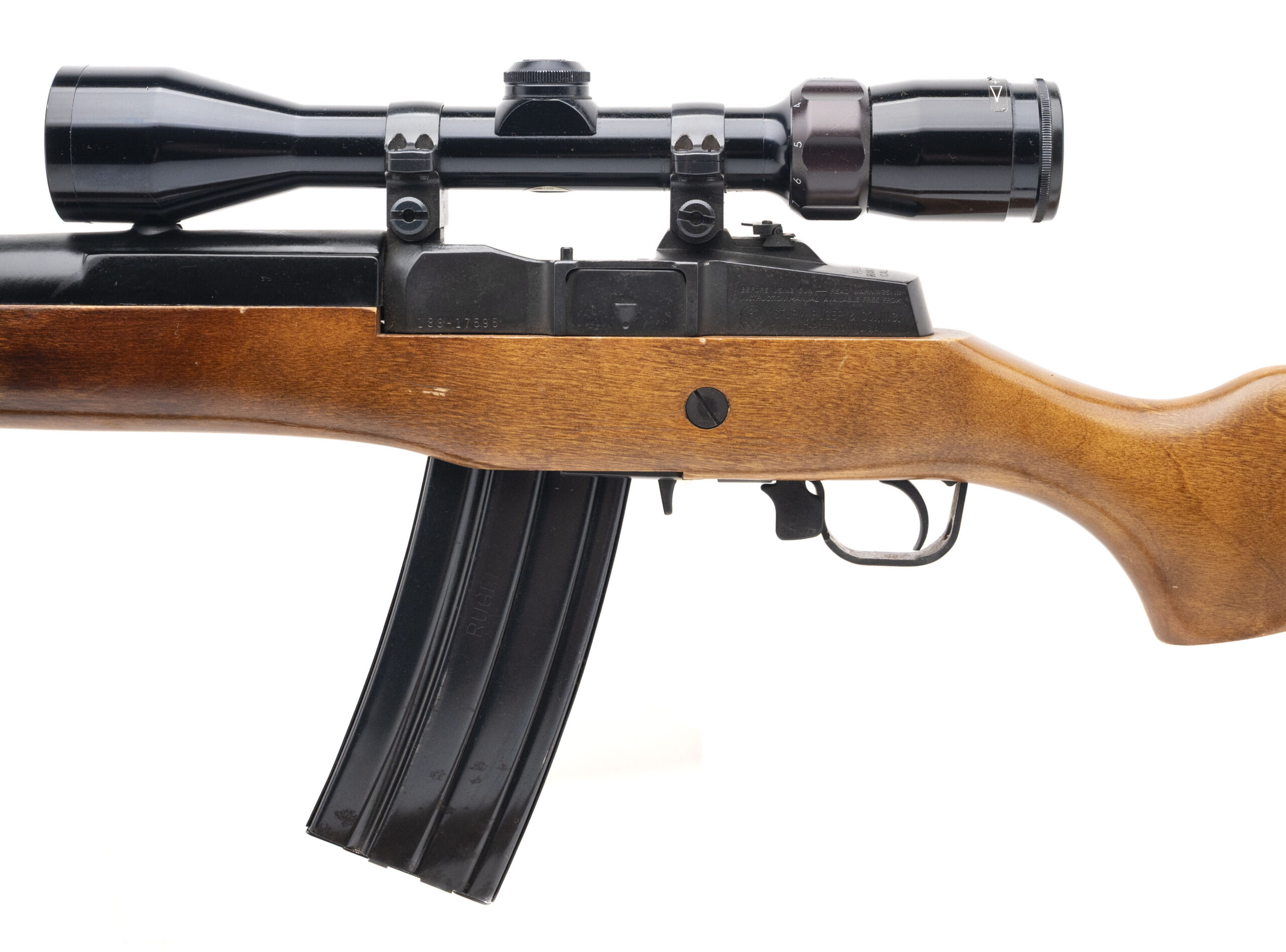 SN:188-17595. Made in 1991, .223 REM. with an 18.5" barrel. Bore is excellent. Semi-auto rifle with a bushnell scope and cobra rifle basket weave sling, blued finish, and wood stock. Finish shows minor handling marks. Overall condition very good.(DALLAS LOCATION)