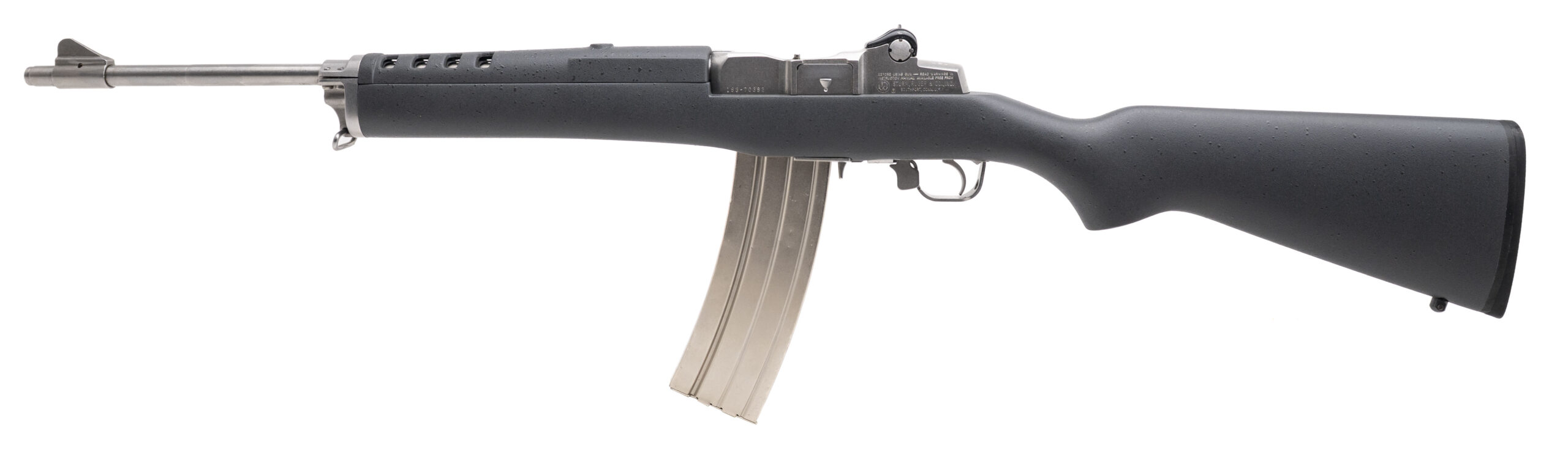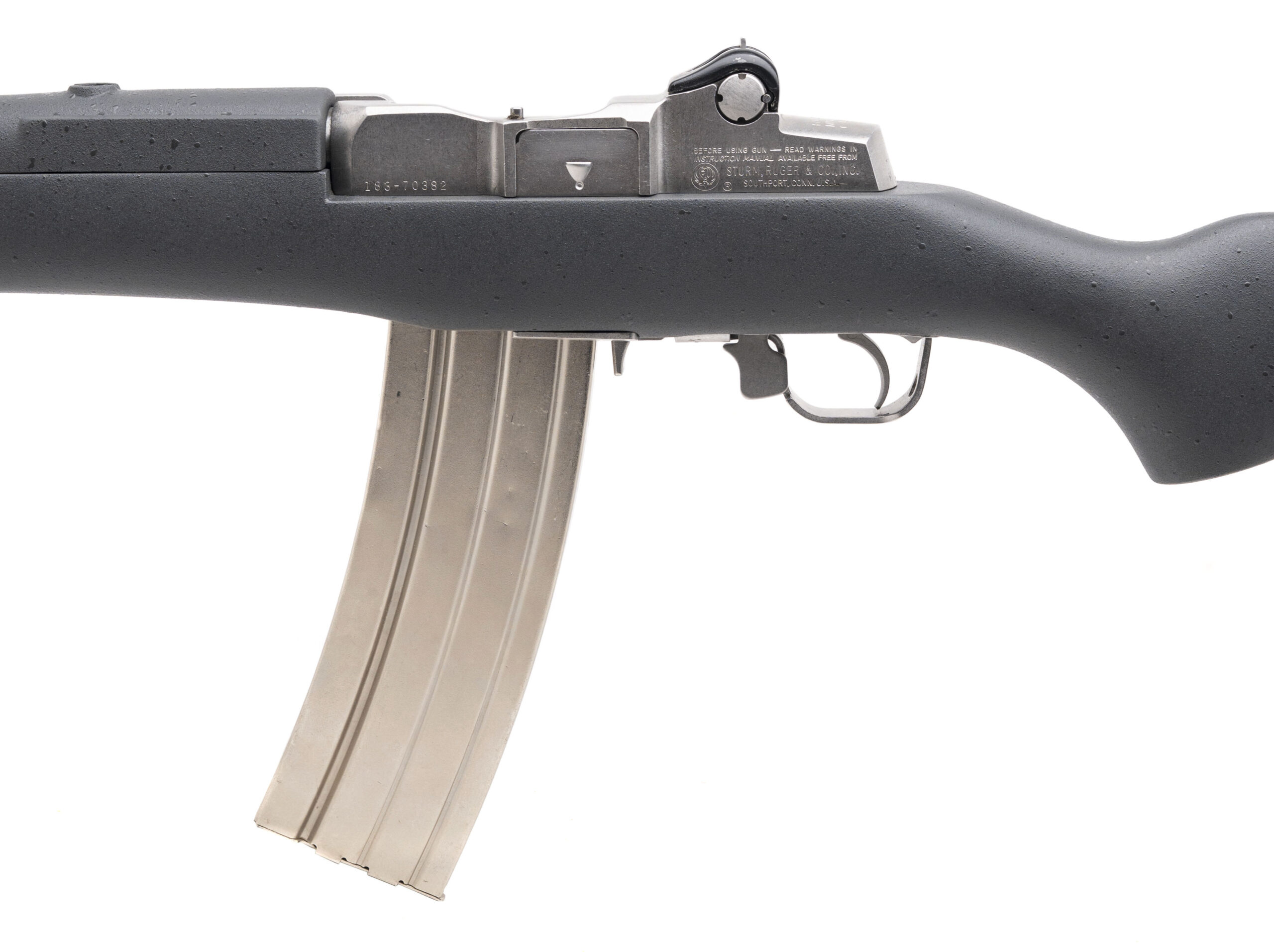 SN: 183-70382. Made in 1983, .223 REM. with an 18.5" barrel. Bore is very good. Semi-auto rifle with a bladed front sight, aperture rear sight, satin stainless steel finish, and gray synthetic stock. Finish shows minor handling marks. Overall condition is near excellent.