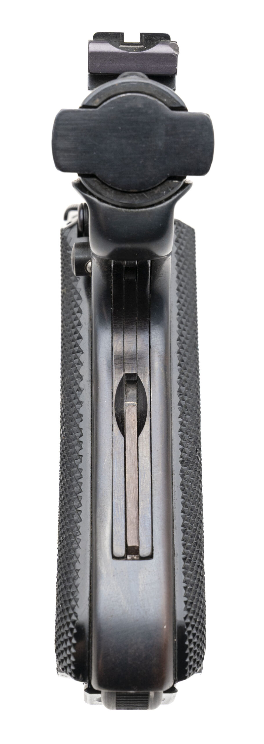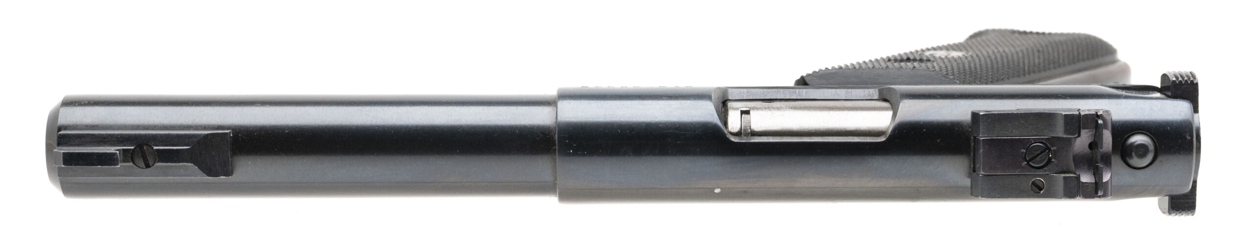 SN: 212-28327. Made in 1986, .22LR with a 5.5" barrel. Bore is very good. Semi-auto rimfire target pistol with an adjustable rear sight, blued finish, and checkered polymer grips. Rear sight has a small dent, and finish shows minor marks throughout. Overall condition is very good.