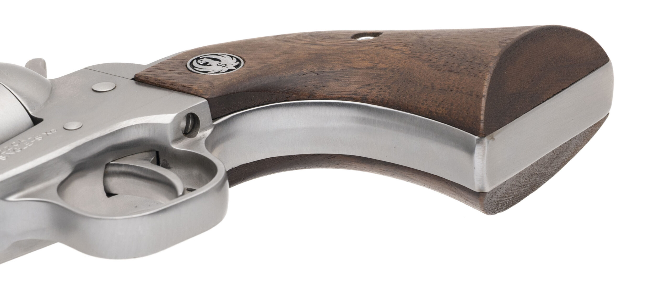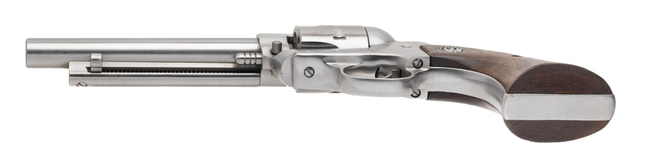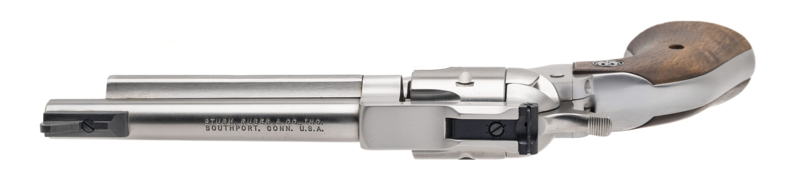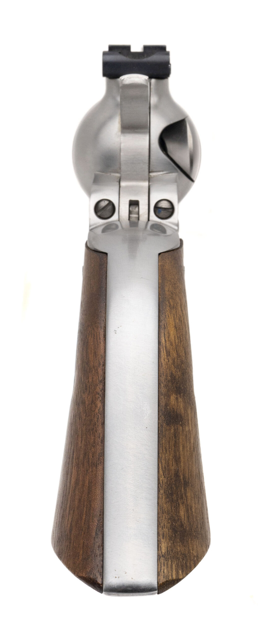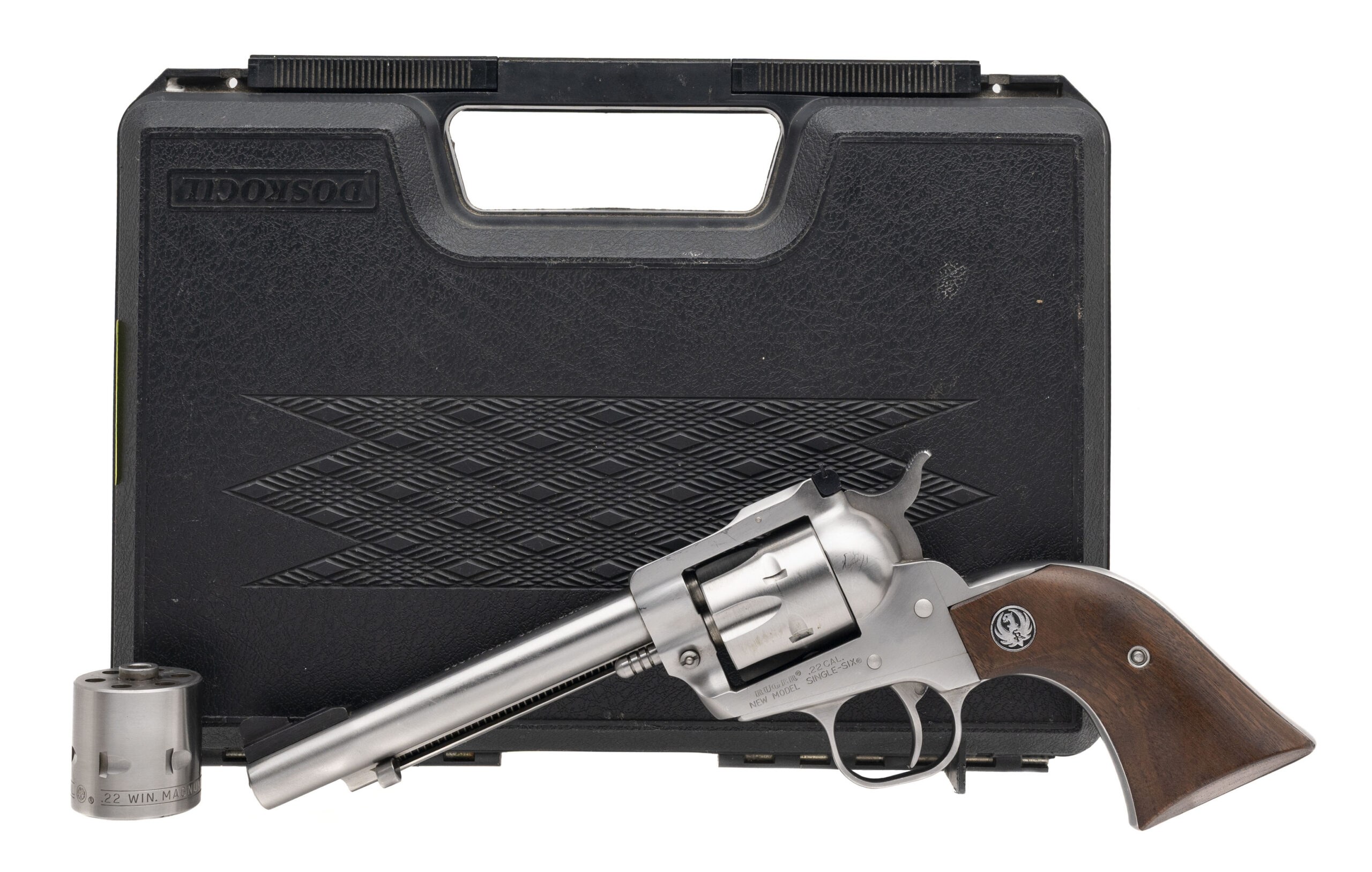 SN: 65-39542. Made in 1977, .22LR with a 5.5" barrel. Bore is excellent. Stainless steel frame single-action only rimfire revolver with an adjustable rear sight, 6rd cylinder, and wood medallion grips. Metal shows moderate handling marks throughout. Overall condition is very good. Includes an additional stainless steel 6rd .22 WMR cylinder which shows light handling marks, and a Doskocil pistol case.