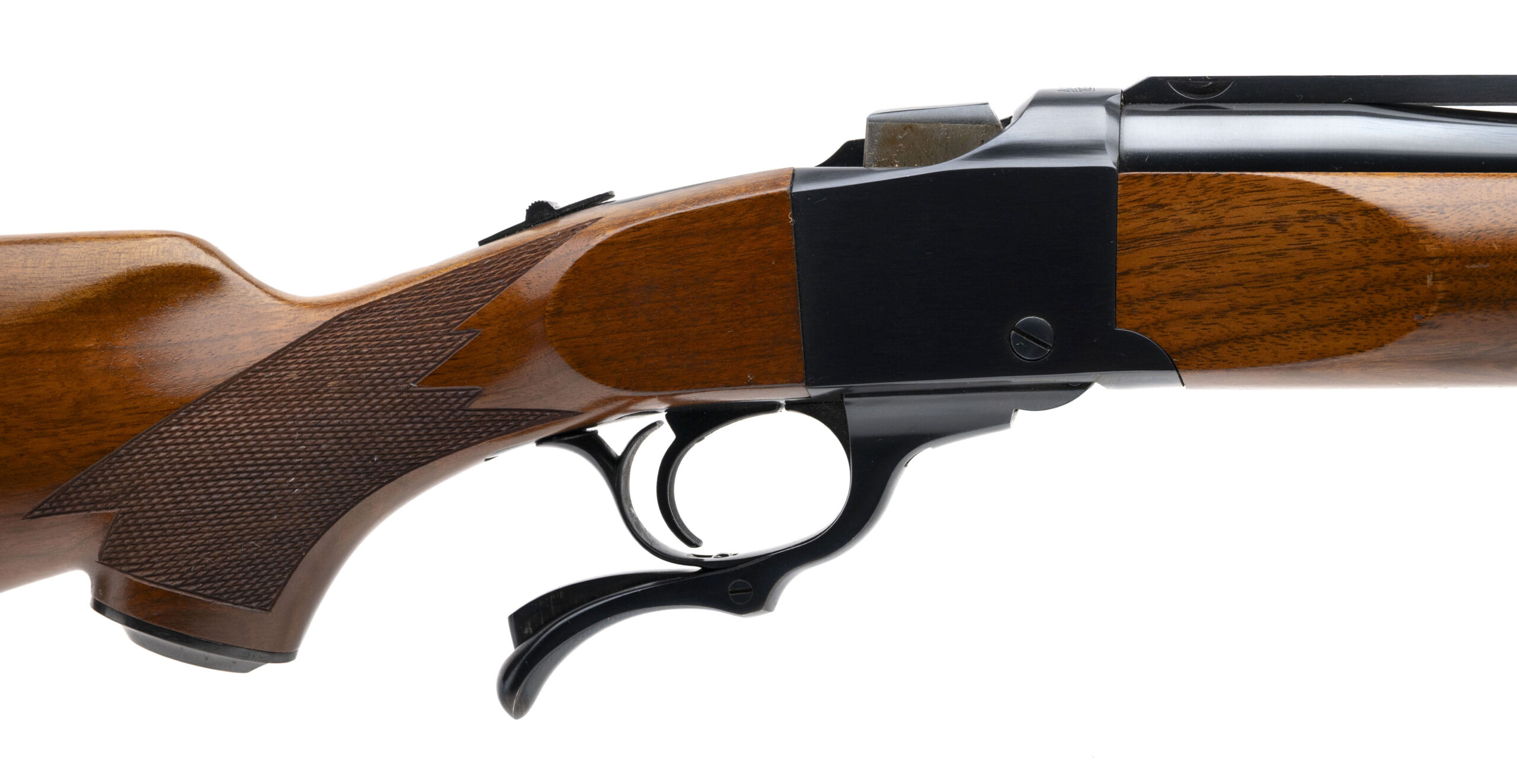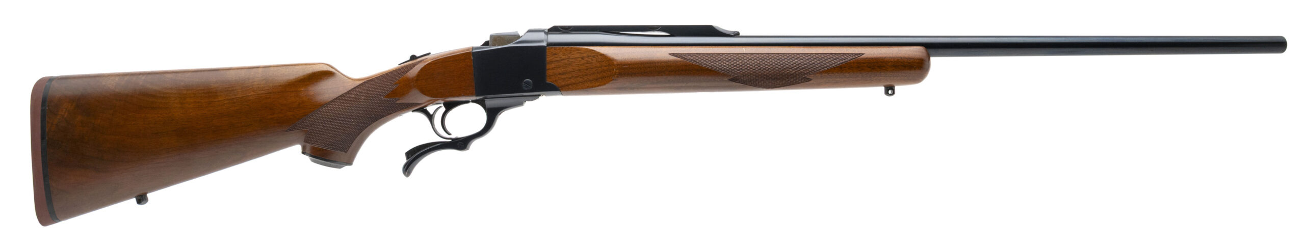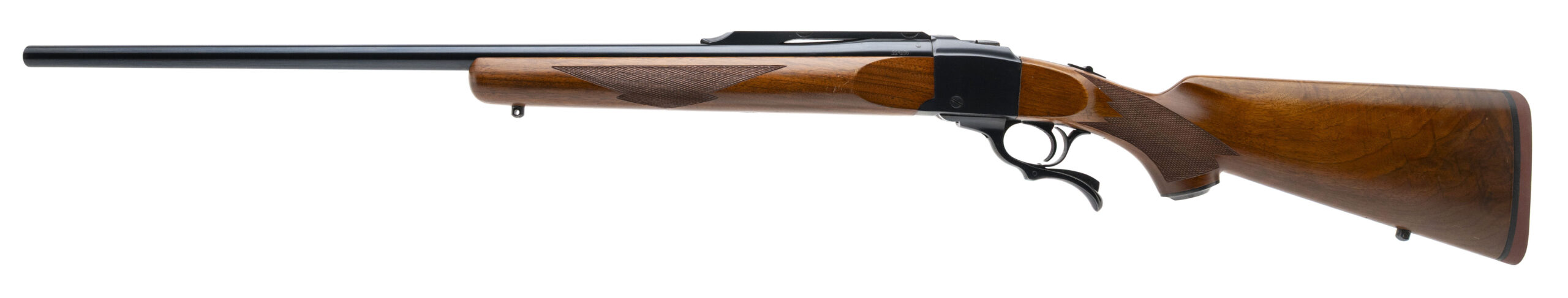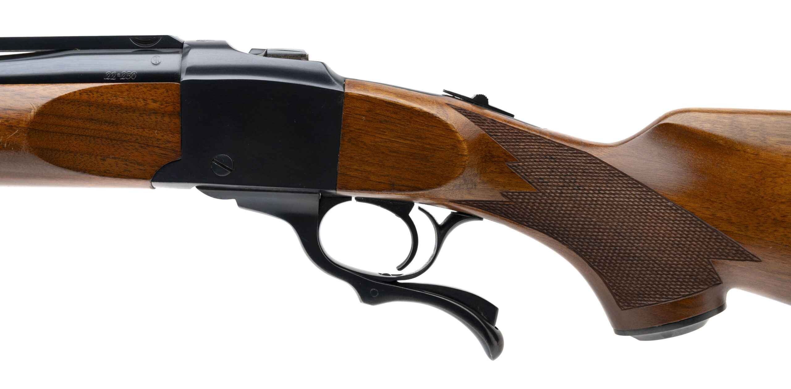 SN: 132-64349 made in 1983. Single shot rifle chambered in 22-250 with a 26" round barrel and quarter rib with integral scope mounts. Checkered walnut furniture with pistol grip cap and original Ruger red rubber recoil pad. Some light handling marks but overall in very good condition with an excellent bore.