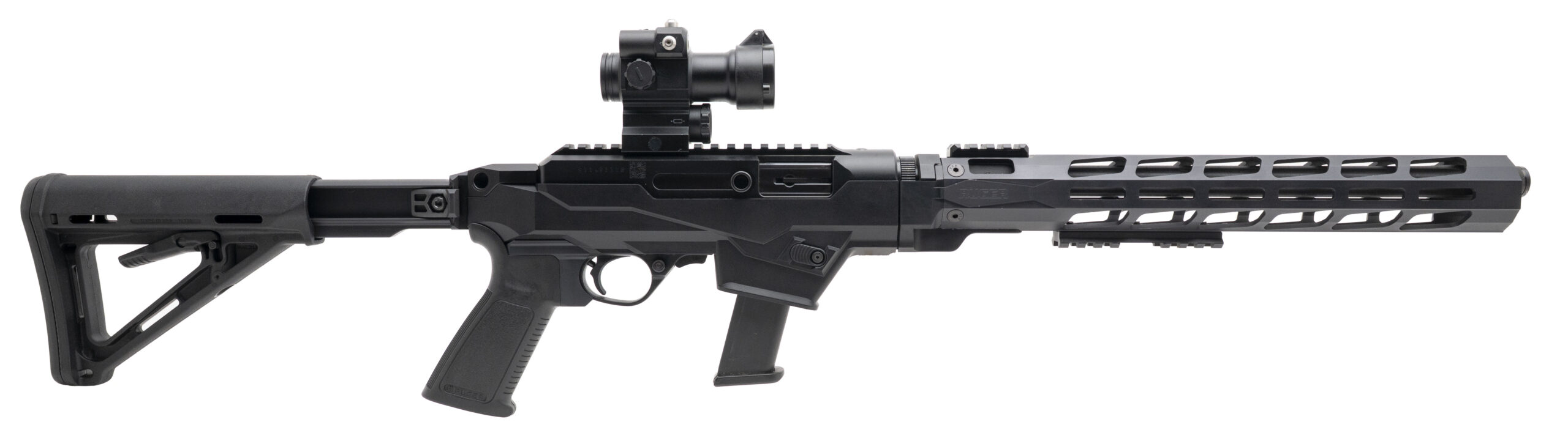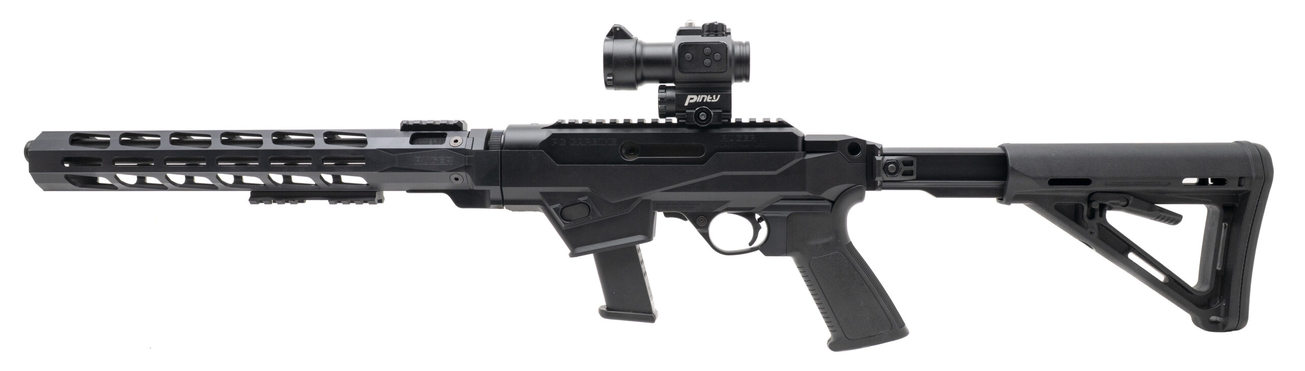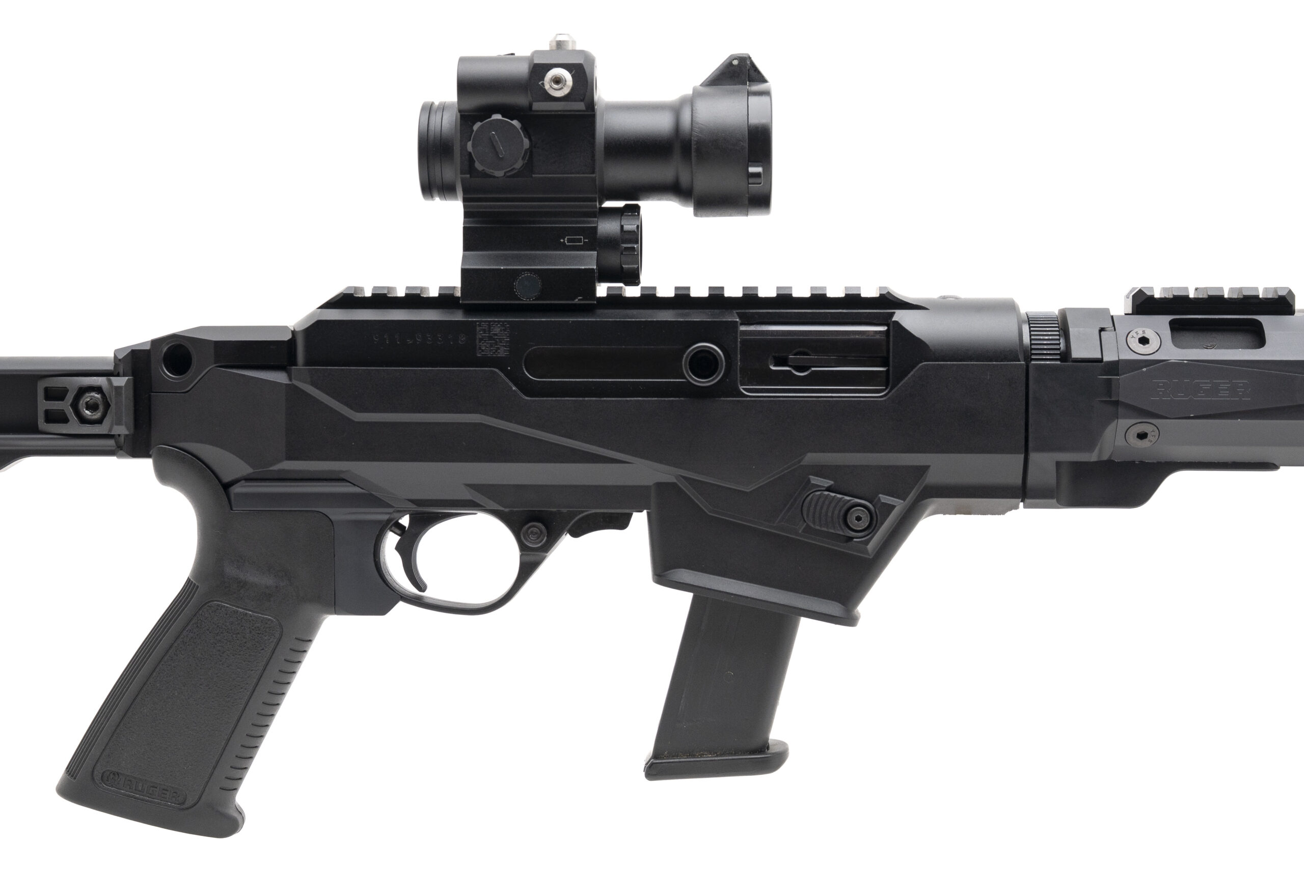 SN: 911-93318. Modern production, 9mm with a 16" fluted/threaded barrel. Semi-auto tactical carbine with a Pinty red dot optic and 6 position collapsible stock. Overall condition is very good.