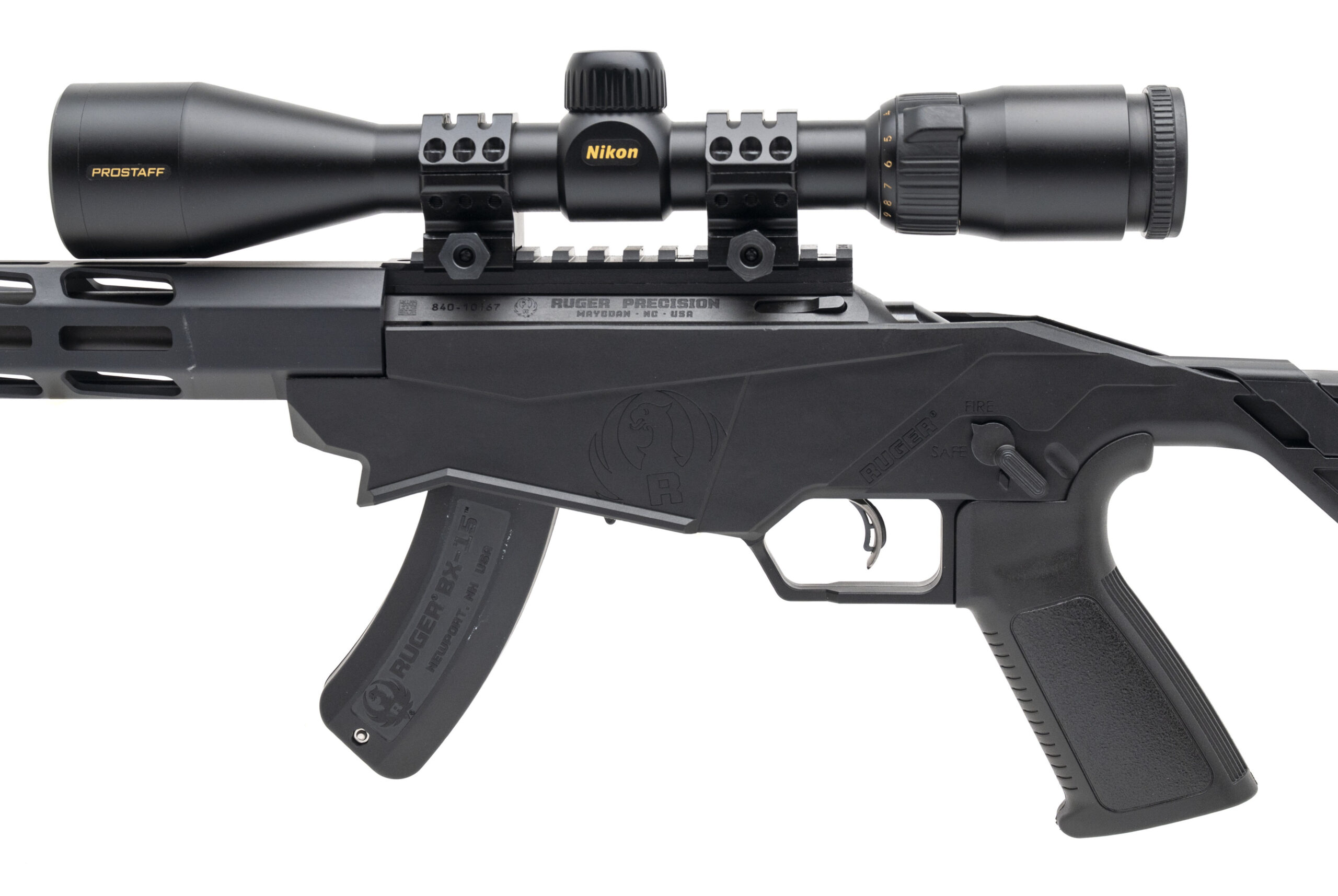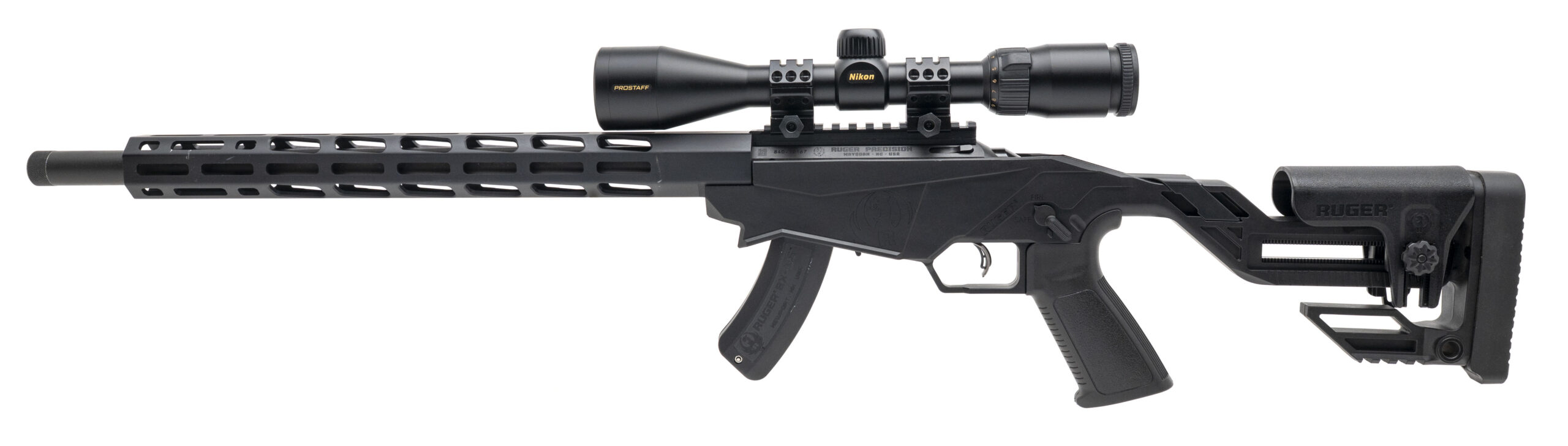 SN: 840-10167. Modern production, .22LR with a 18" heavy threaded barrel. Bolt action rimfire precision rifle with a Nikon Prostaff PR31 3-9x40mm scope. Overall condition is near excellent.