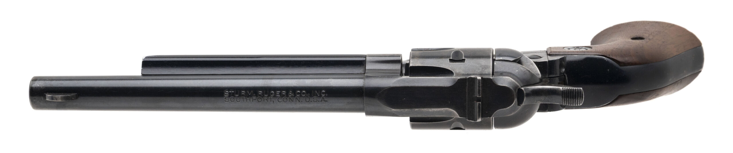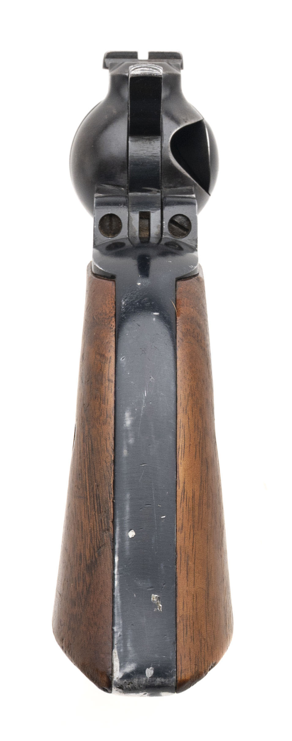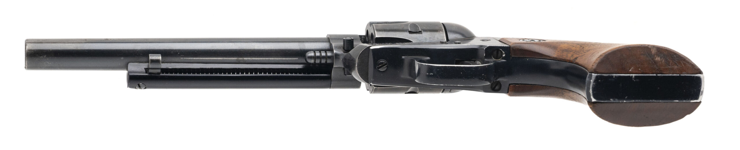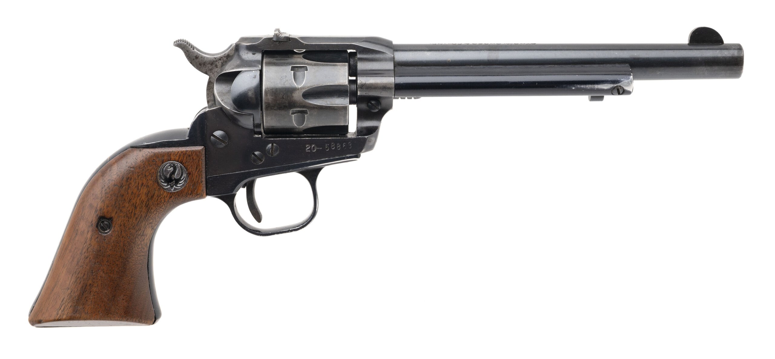 SN: 20-58863. 1970 production, .22 with a 6.5" barrel. Bore is very good. Old model 3-screw single action only rimfire revolver with wood grips. Metal shows wear with most of the blue finish present. Very good condition overall.