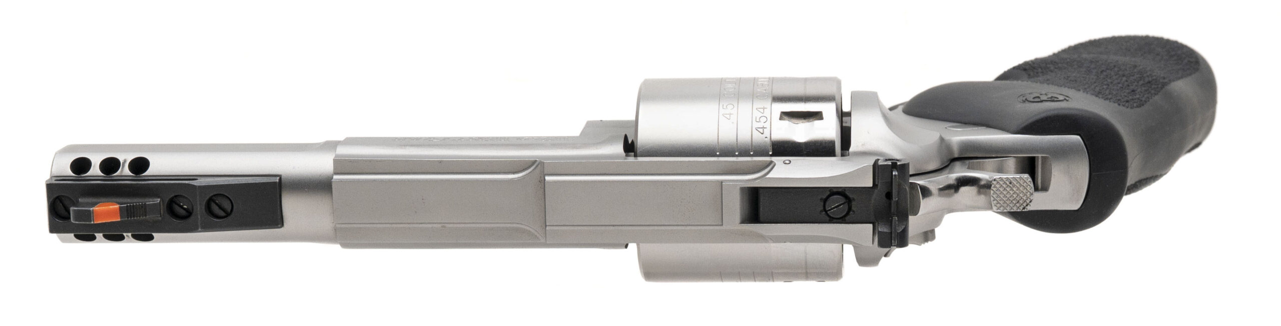 SN: 552-92251. Modern production .454 Casull with a 5" barrel. Custom conversion dangerous game gun hand-built and tuned by Wild West Guns. Has a cut down ported barrel, special polishing and tuned action. An impressive survival gun, in excellent condition.
