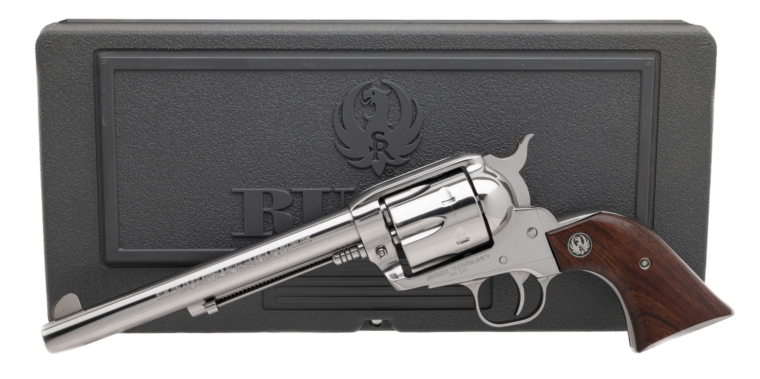 SN: 56-70514. Made in 1997, .45 Cal. with a 7.5" barrel. Bore is excellent. Stainless steel frame single-action only revolver with a bladed front sight, 6rd cylinder, and medallion wood grips. Metal shows minor handling marks throughout. Overall condition is very good. Includes original case.