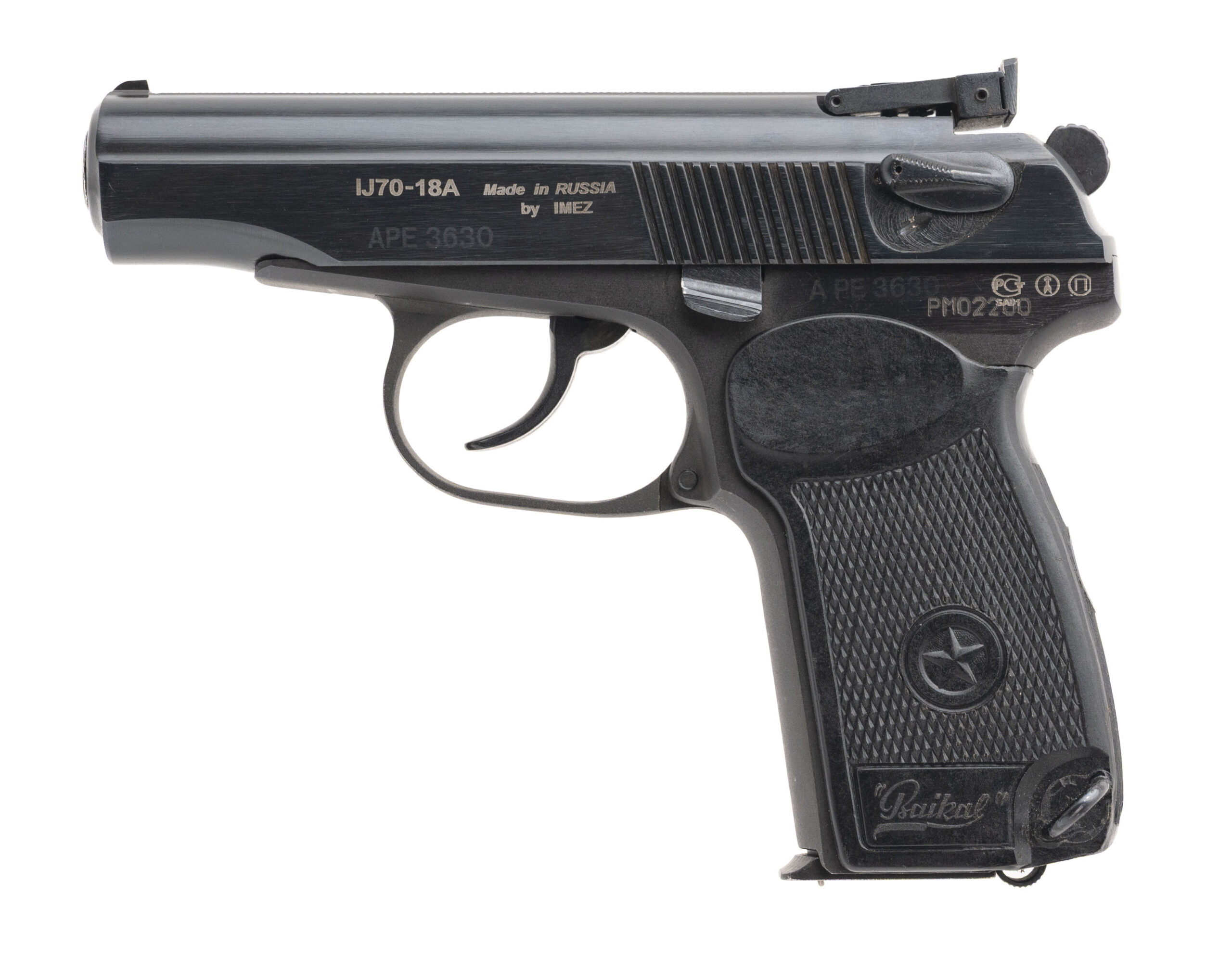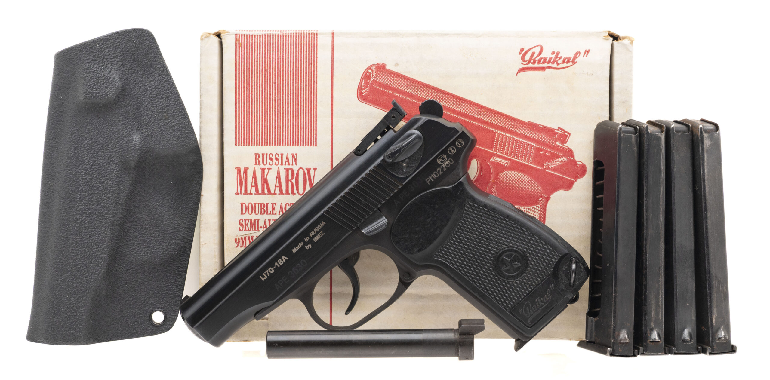 Serial number PM02200 (importer assigned). Made in July 1994 at the Izhevsk Mechanical Plant (IMEZ) as an IJ70-18A with a 3.8-inch barrel that has a bright chromed bore with strong visible rifling. As this is a commercial Makarov that was imported during the 1990s, it is marked "Made in Russia" on the slide, & it is equipped with an adjustable rear sight assembly. Overall condition is excellent with original blued finish on the slide but the finish on the barrel is thinning. The frame has a dull phosphate over the bluing that has been scrubbed away in the area of the serial number & production proof marks. Comes with five surplus 8-round magazines, cleaning rod/tool, a spare barrel chambered for the .380 ACP cartridge, original factory box with instruction manual, a Kydex clip holster & a plastic wrap around grip marked "Baikal."