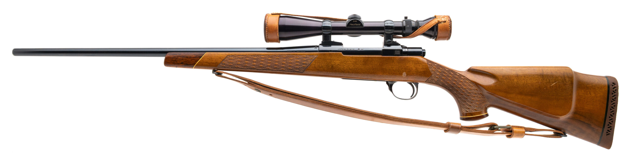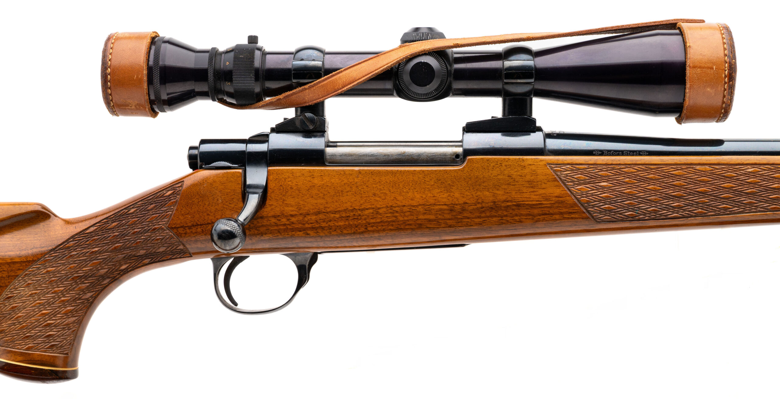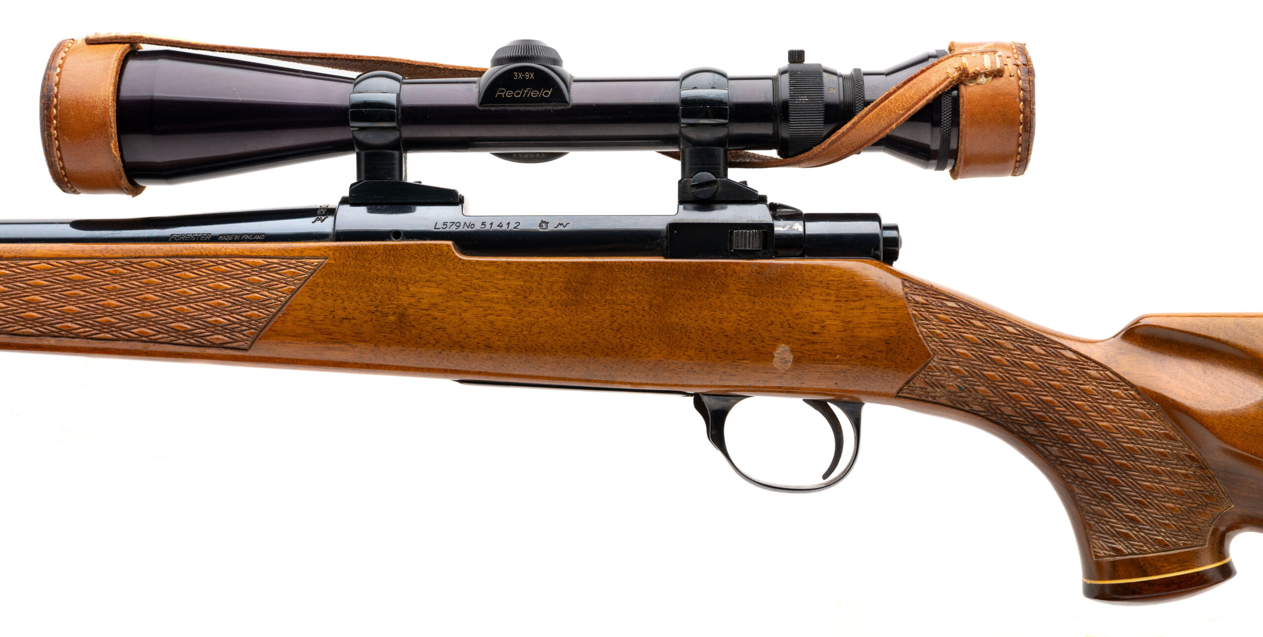 SN: 51412 made in Finland circa 1960's. Bolt action hunting rifle chambered in 243 with a 23" round "Bofors Steel" barrel, Redfield 3-9 scope, side safety and hinged floor plate engraved bottom metal in a deluxe checkered walnut stock with skip line checkering, forend tip, grip cap and original Sako recoil pad. Some light handling marks on the stock with a small blemish on the left side near the trigger, metal finish is in very good condition and bore is excellent. Comes with leather sling and scope caps