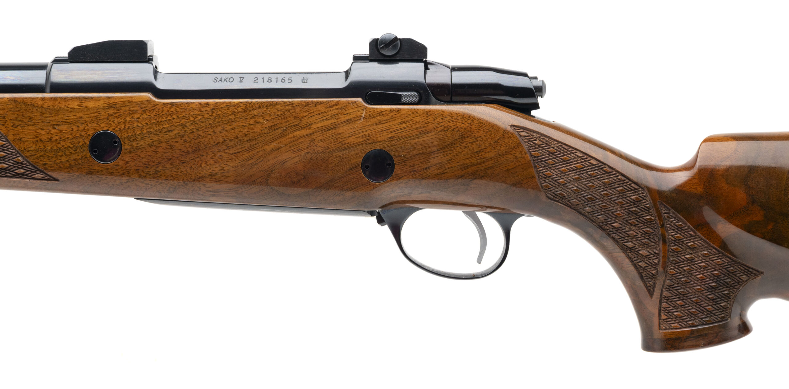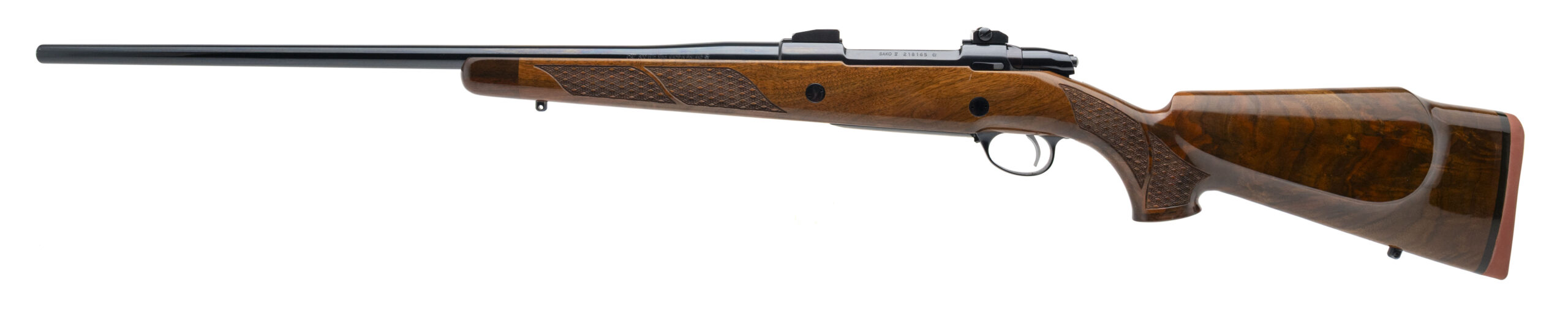 SN: 218165 made in Finland circa 1990's. Deluxe bolt action hunting rifle chambered in 300 Win Mag with a 24" round barrel with scope ring bases installed, engraved bottom metal and high polish blued finish in a high gloss checkered walnut monte-carlo stock. Stock features 2 cross bolt recoil lugs, skip line checkering, right hand palm swell, rosewood forend tip and grip cap with Sako medallion inlaid and original Sako red rubber recoil pad. Some light handling marks but overall in very good condition with an excellent bore.
