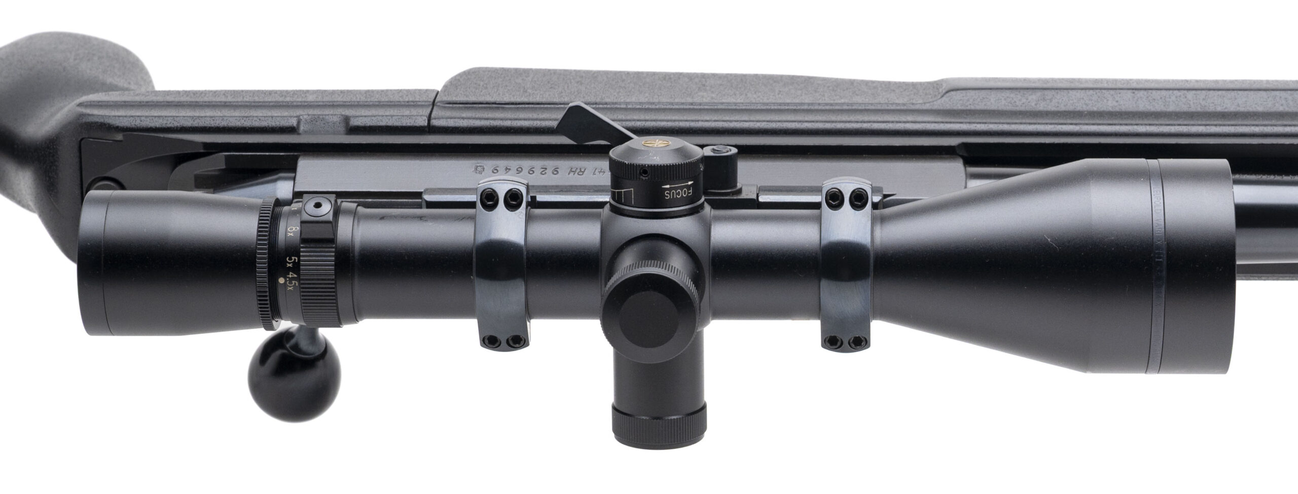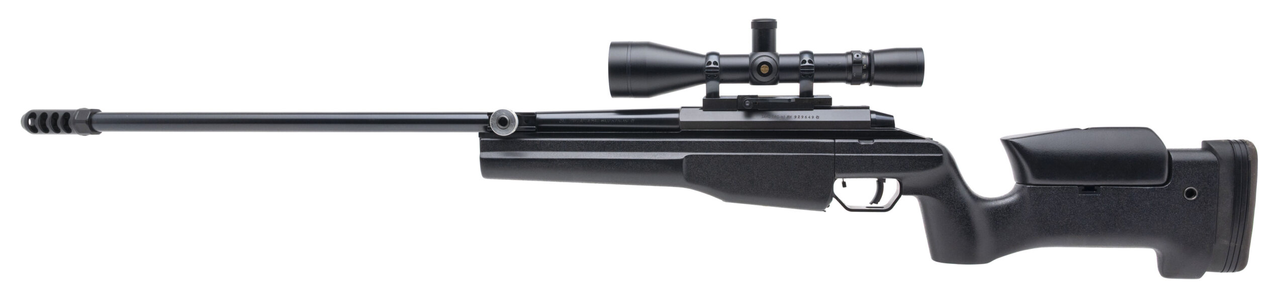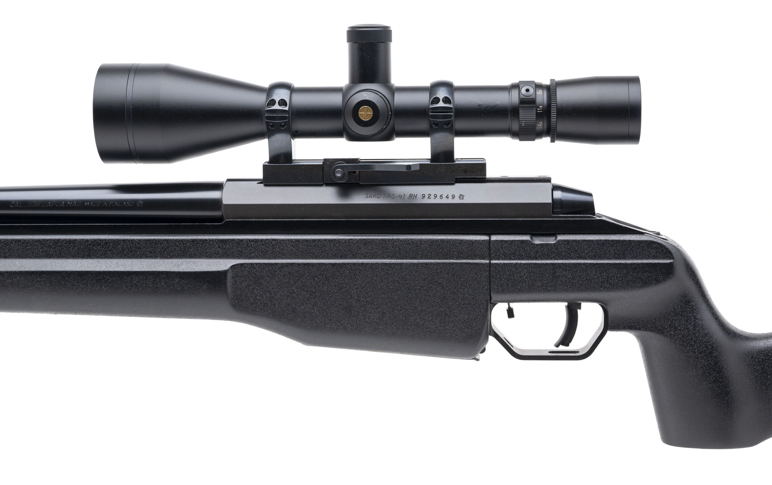 SN: 929646. 1990s vintage, .338 Lapua MAG. with a 26" barrel w/4 chamber muzzle brake. Bore is excellent. Finnish made bolt-action precision rifle with a Leupold Vari-X III 4.5-14x50mm scope, blued finish, and black composite stock w/cheek rest. Finish shows minor handling marks. Overall condition is very good.