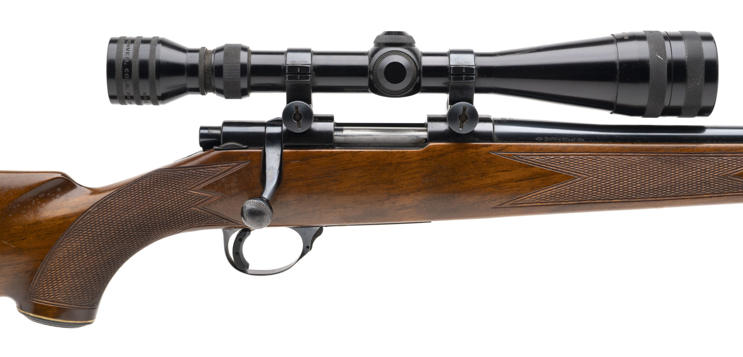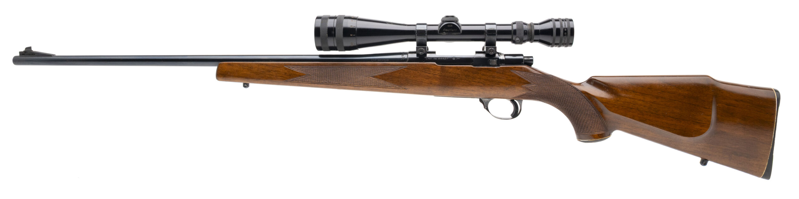 SN: 88827 made circa 1960’s in Finland. 222 Remington bolt action hunting rifle with a 24” round barrel with ramped front sight, side safety, hinged bottom metal and added trigger shoe with a classic Redfield 4-12 scope. Checkered walnut stock with white line grip cap and original butt plate. Some light handling marks, overall in very good condition.