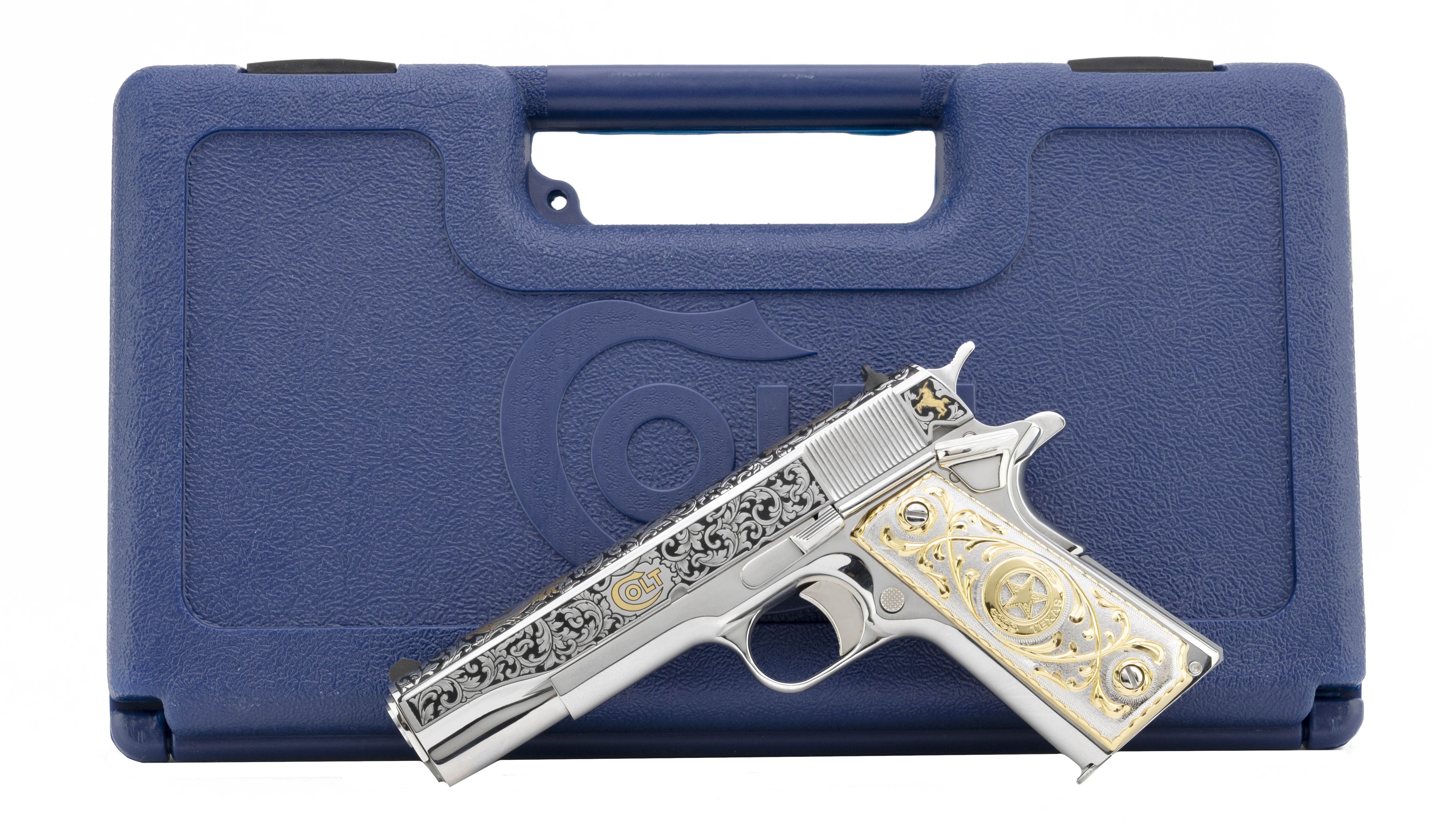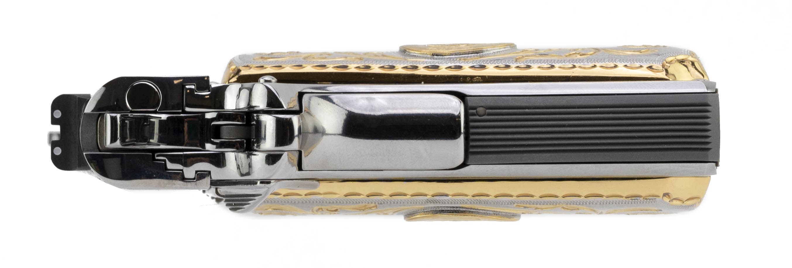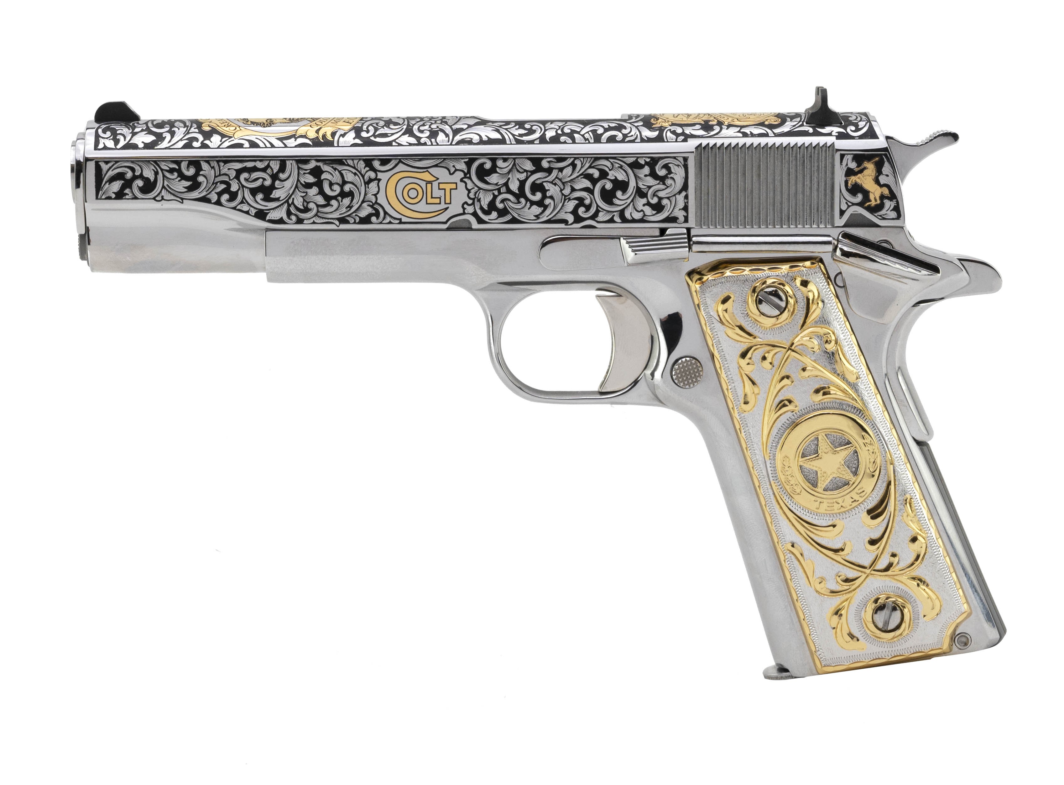 Beautiful engraved high polished stainless 5" 1911. Has Gold decorations and fancy Texas silver and gold plated grips. An outstanding barbecue gun! 1 of 500 limited edition.