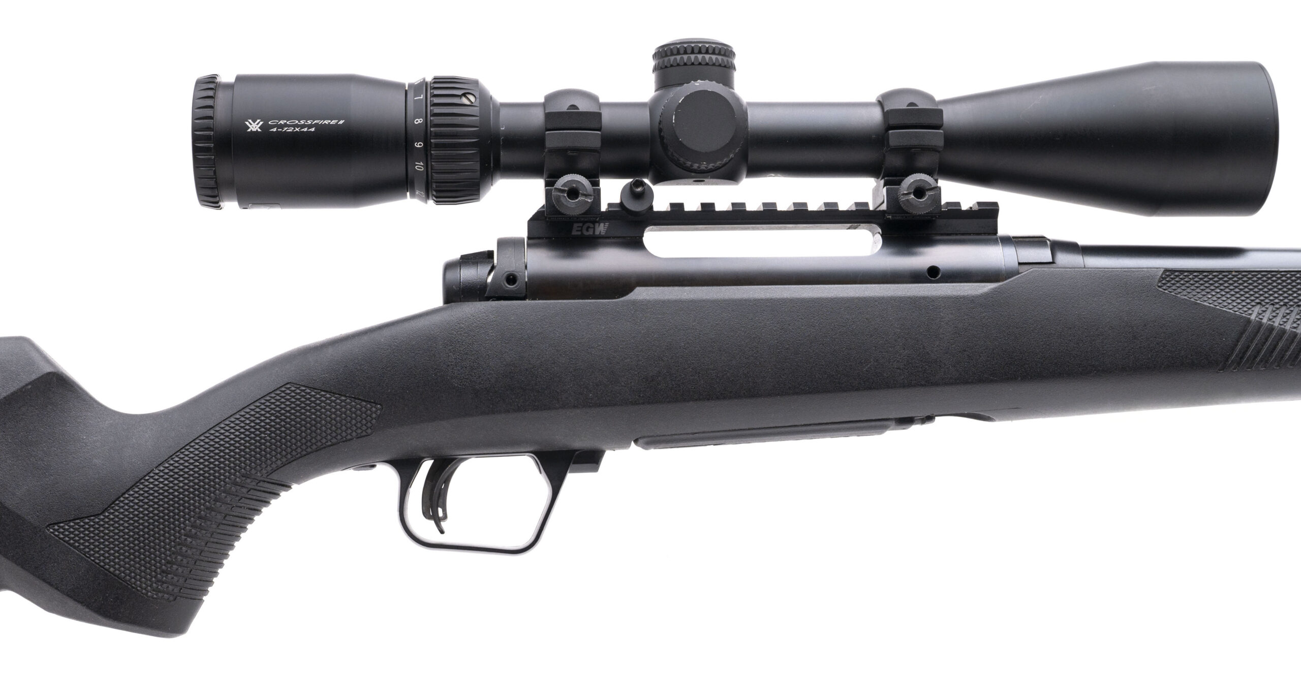 SN: P297169 modern production left hand bolt action hunting rifle chambered in 308 with a 20" round barrel, picatinny scope mount with a Vortex Crossfire II 4-12 scope, bubble level, accu-trigger, tang safety and detachable magazine in a synthetic stock. Some wear and handling marks on the stock, metal finish is very good and bore is excellent.