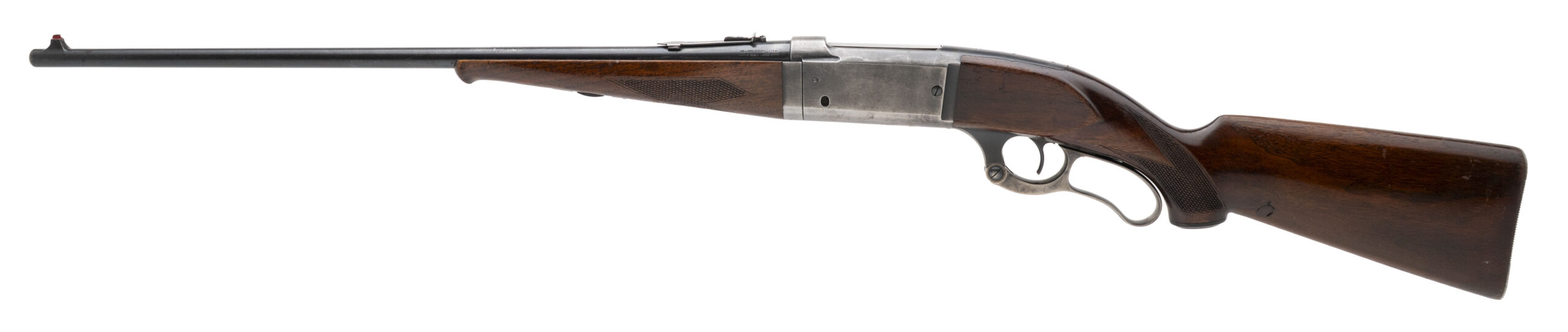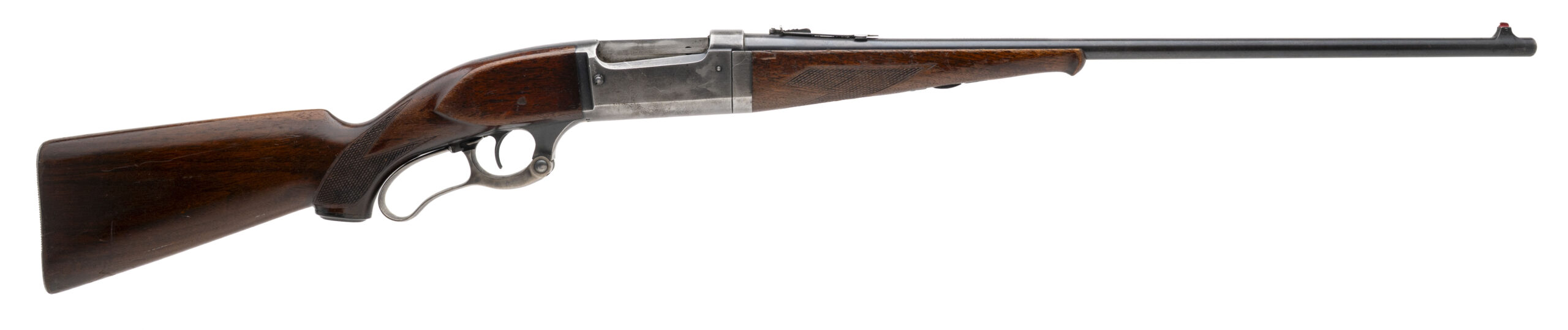 SN: 249228. Made in 1923. Lever action takedown rifle chambered in .300 Savage with a 24" barrel, cocking indicator and round counter on the left side of the receiver. Checkered walnut stock and forearm with original metal butt plate. Overall in good condition with moderate wear and handling marks. Bore has some light frosting but strong defined rifling.