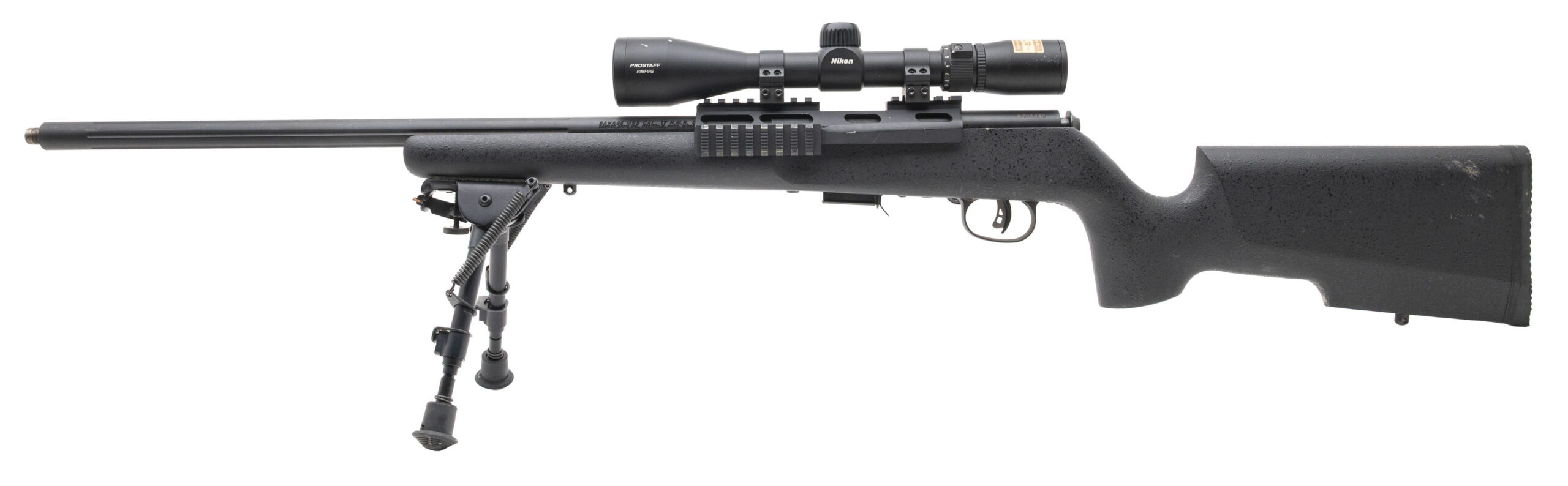 SN: K205448 modern production bolt action rifle chambered in 17 HMR with a 22" fluted threaded barrel, picatinny scope and accessory mount, Nikon Prostaff Rimfire 3-9 scope, Harris bipod, Accu-trigger and detachable magazine in a tactical target style black textured stock. Some light handling marks and edge wear, overall in good condition with an excellent bore.