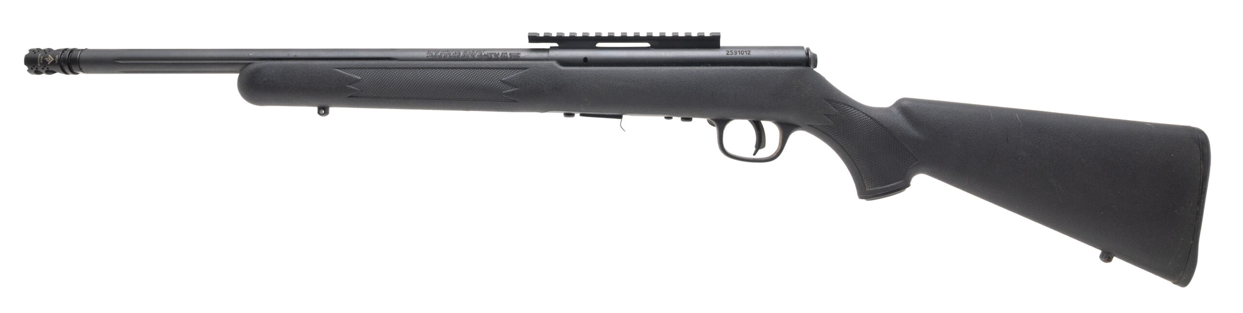 SN: 2591012. Modern production .22LR with an 16" Fluted Barrel and 2 Port Compensator. Bore is bright with excellent rifling. Bolt-Action rifle with top picatinny rail. Finish is in excellent condition. Synthetic stock is in excellent condition. Overall condition is excellent.