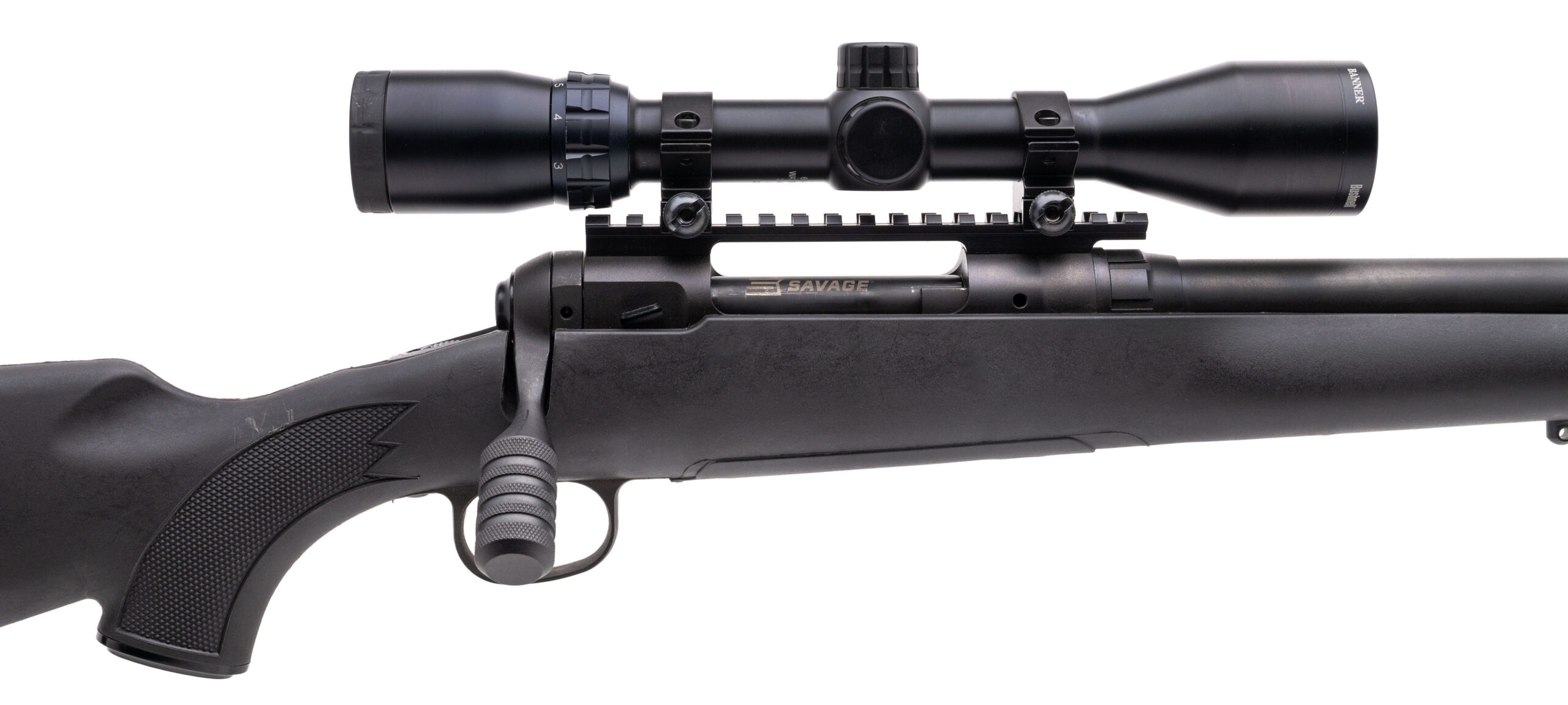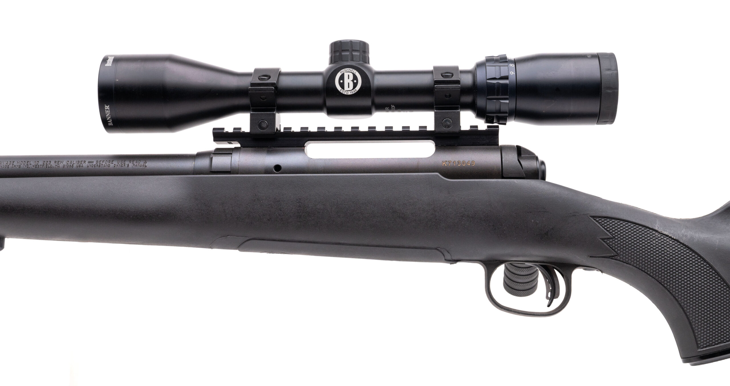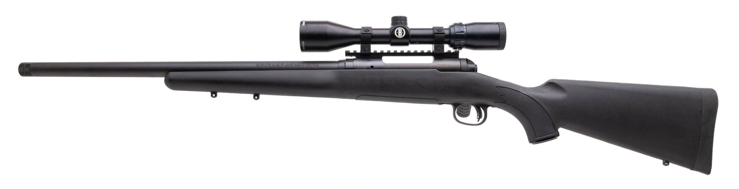 SN: K713049 modern production 223 bolt action rifle with a 20" heavy profile threaded barrel, accu-trigger, tactical bolt handle and Bushnell Banner 3-9 scope in a synthetic stock. Overall in very good condition with an excellent bore.