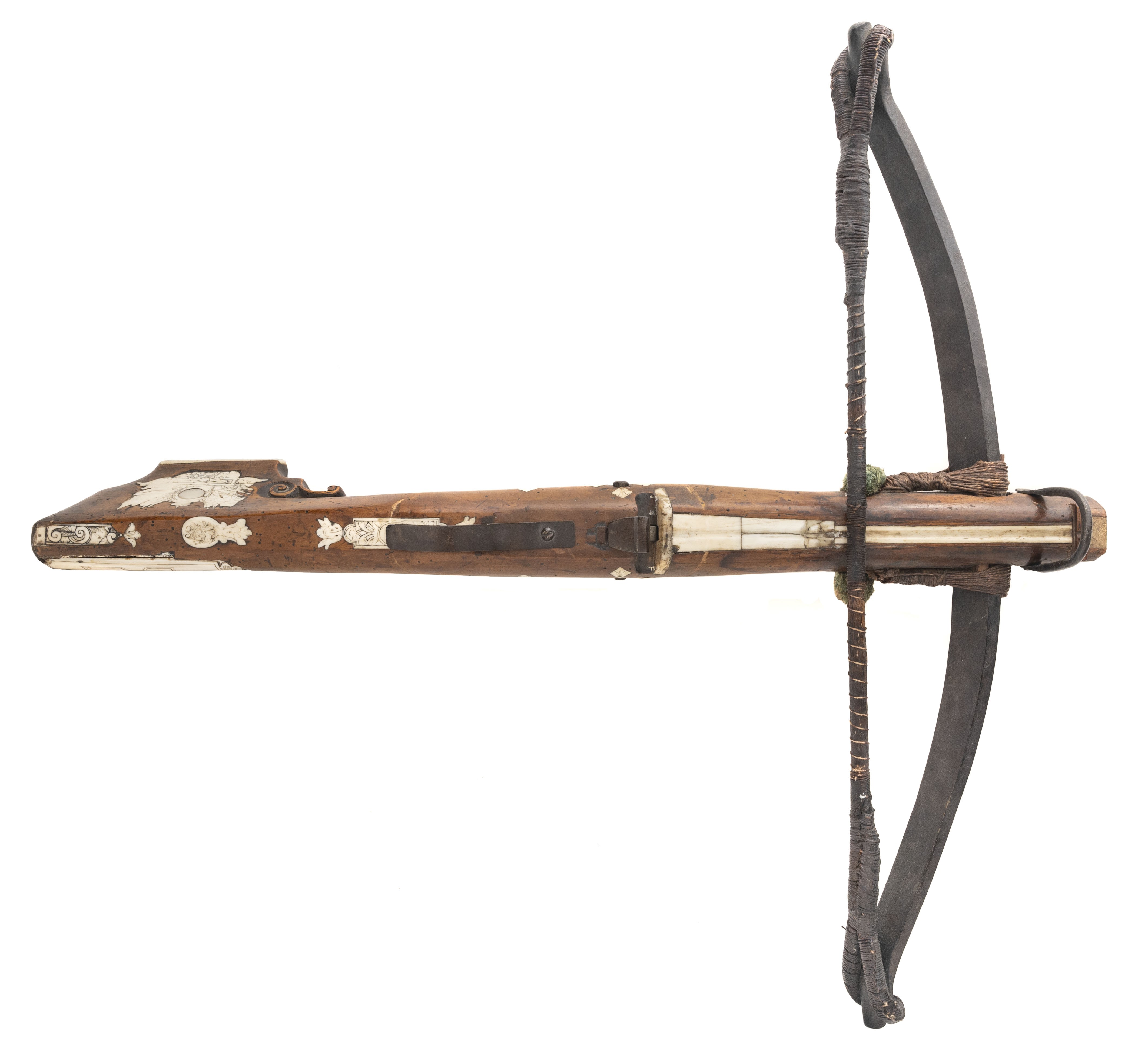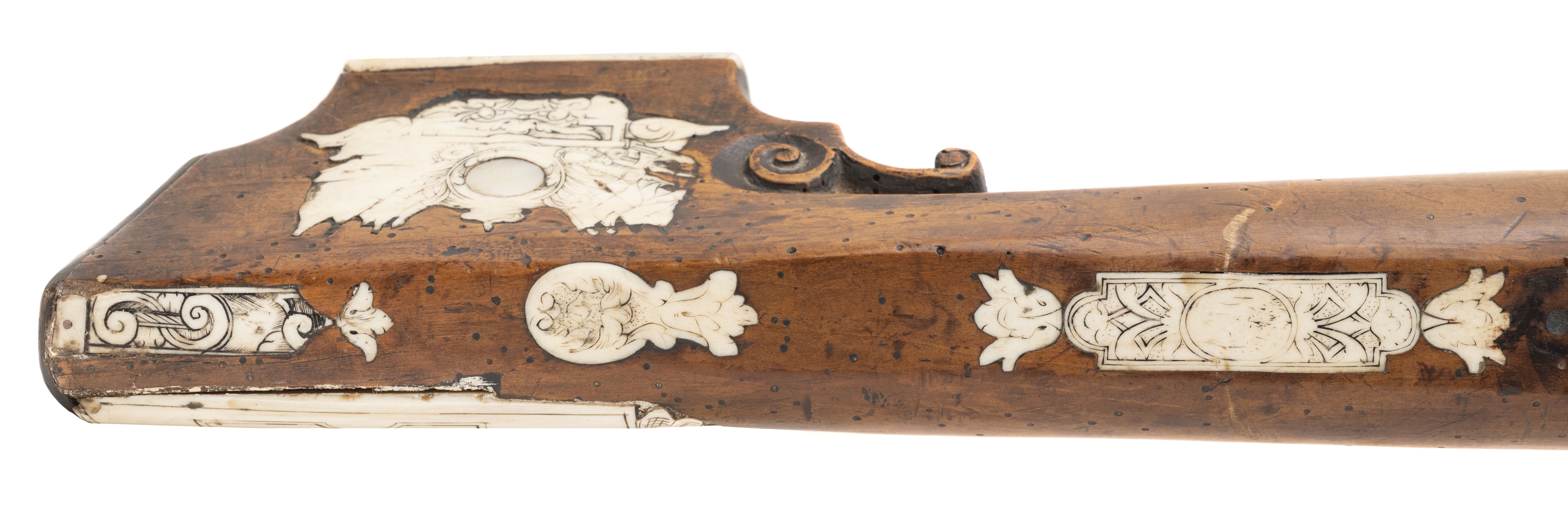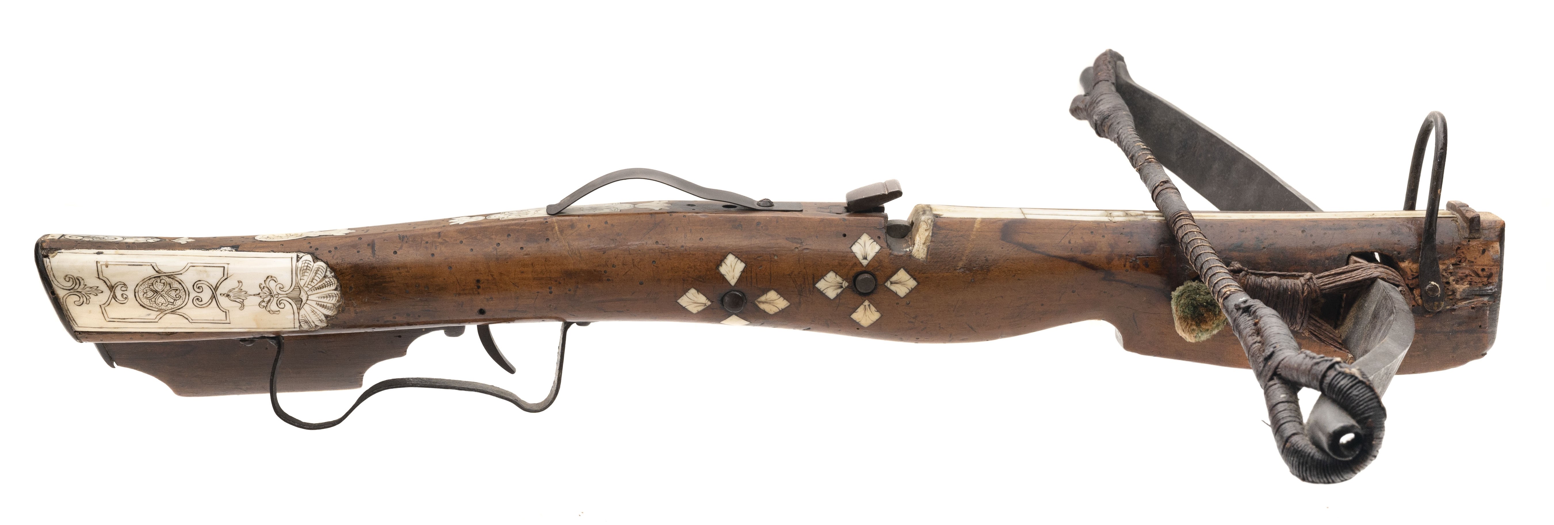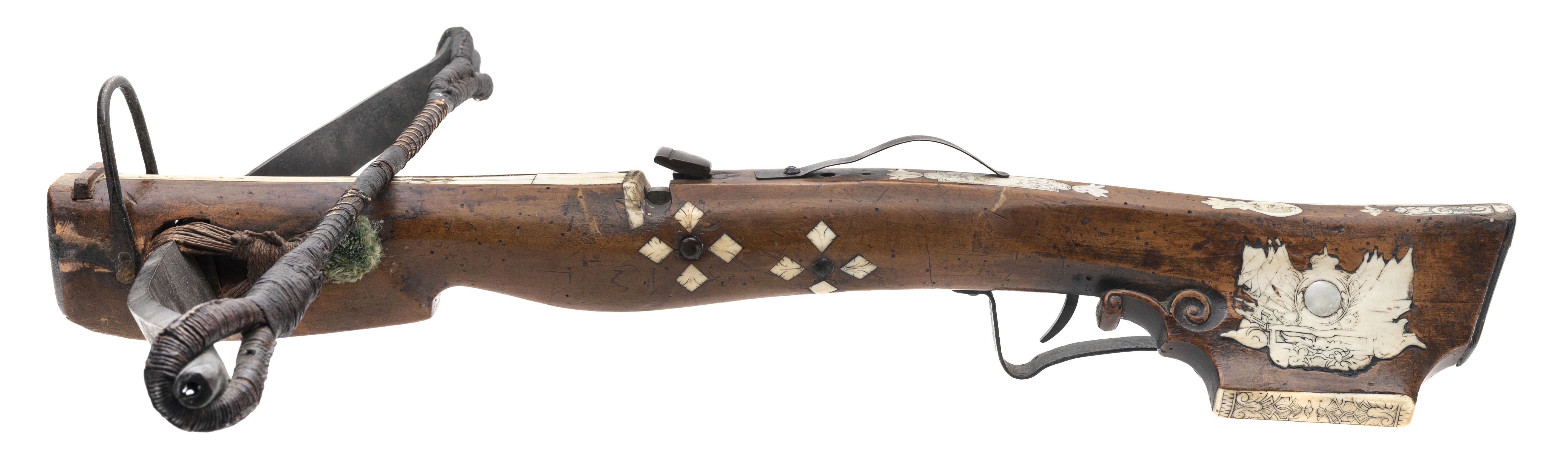 Circa 1690 – 1700. Very fine German crossbow with nicely scrimshawed bone inlays. The bow is 24” wide and 28” long.