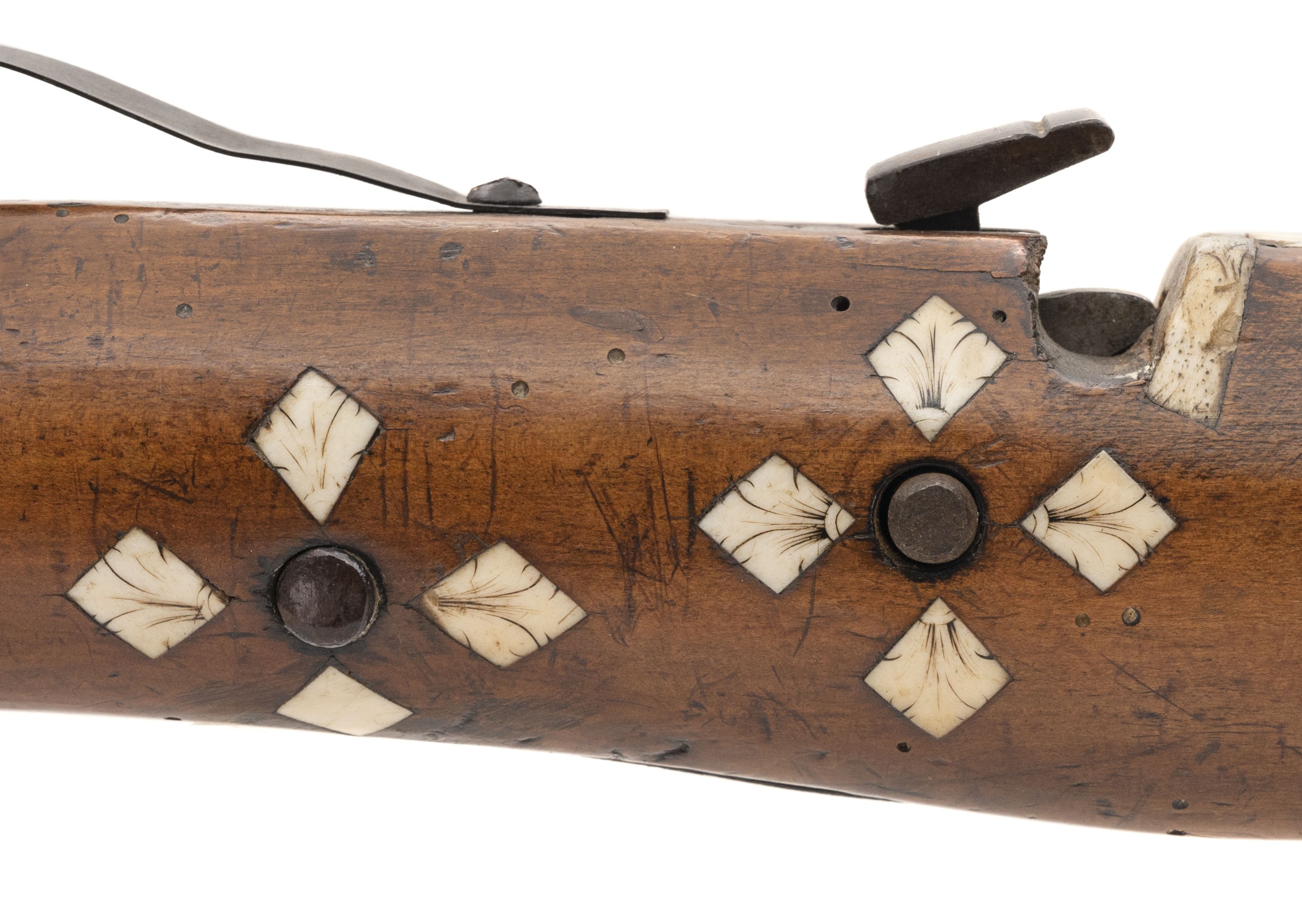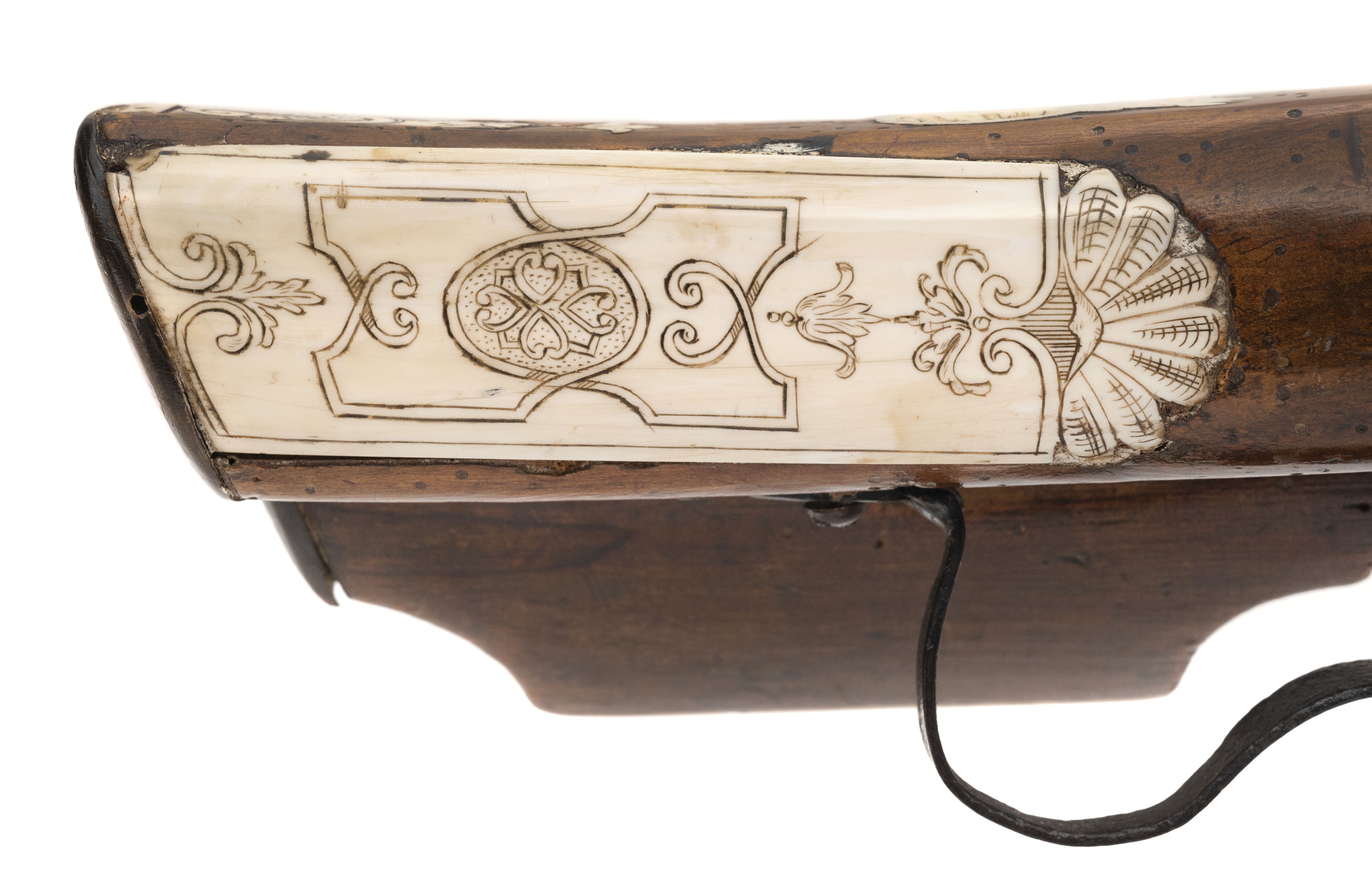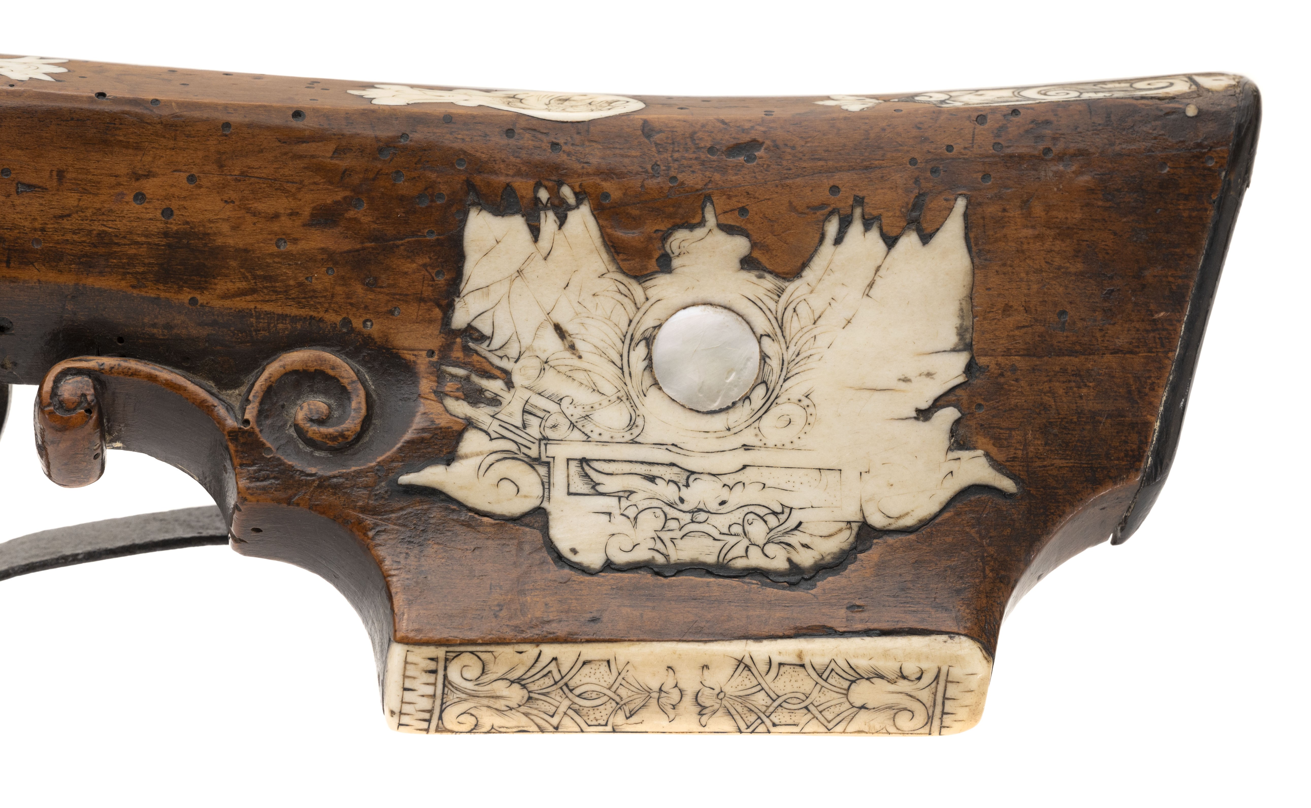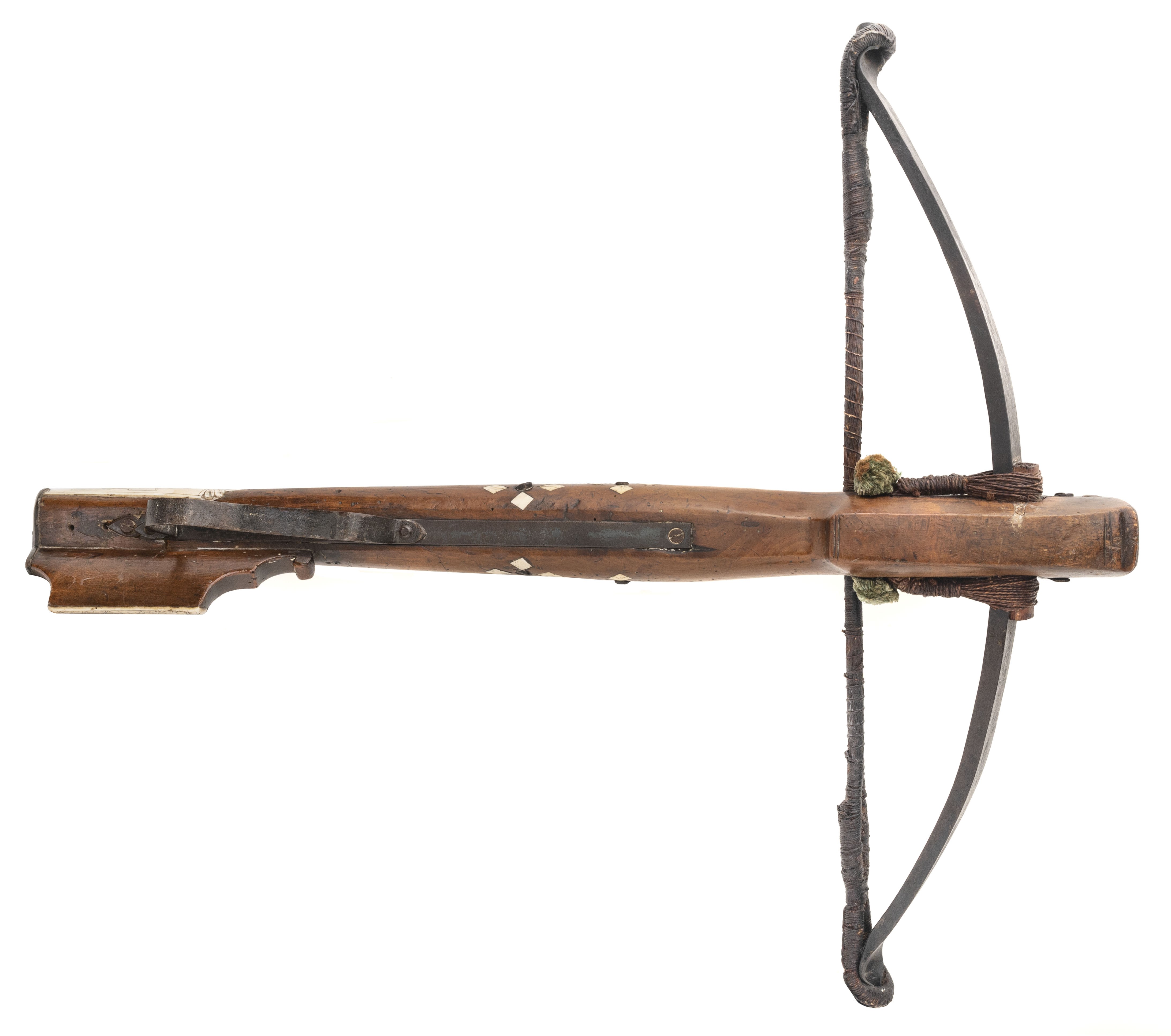 Circa 1690 – 1700. Very fine German crossbow with nicely scrimshawed bone inlays. The bow is 24” wide and 28” long.