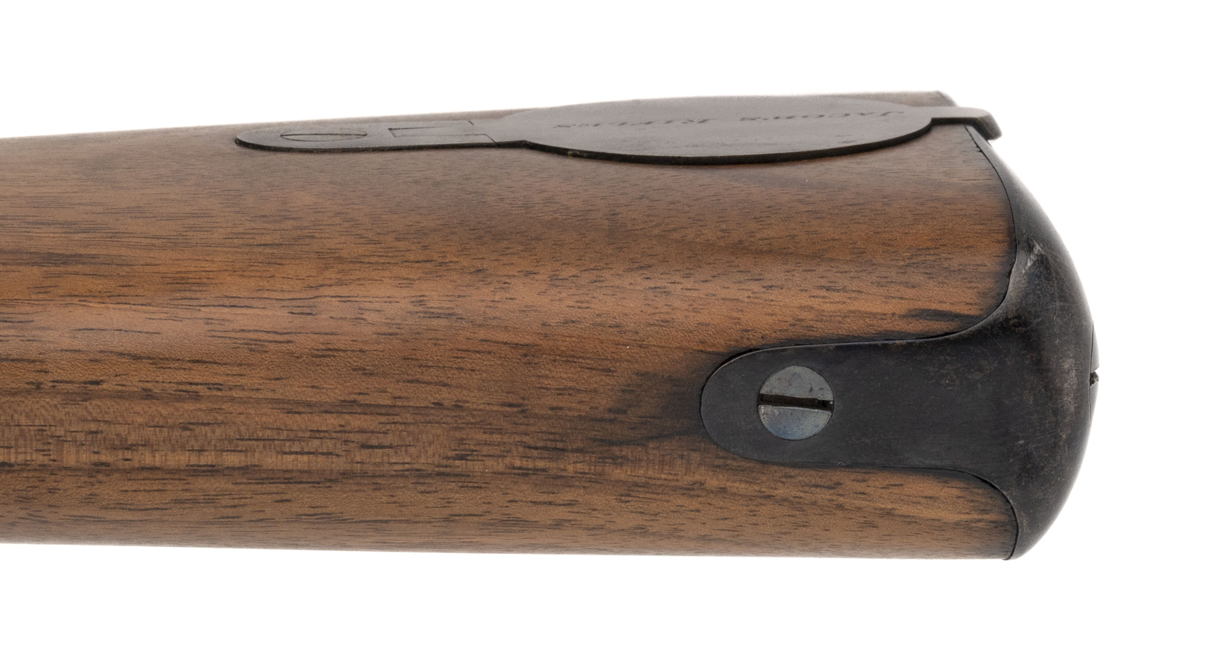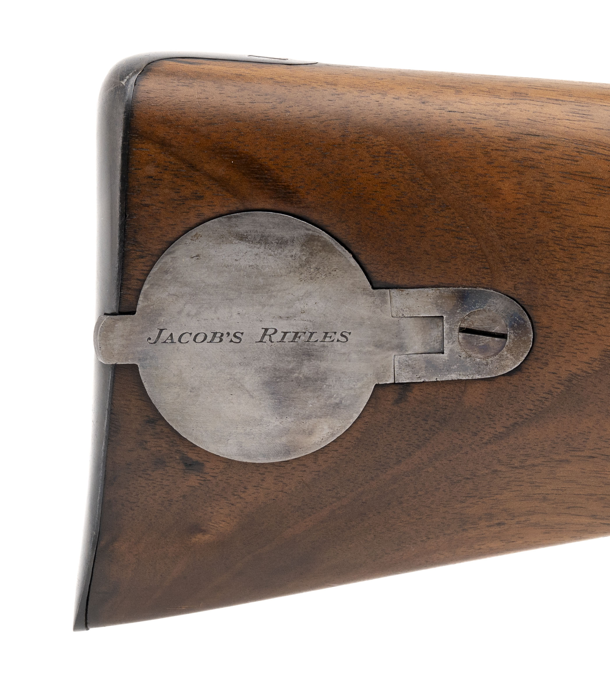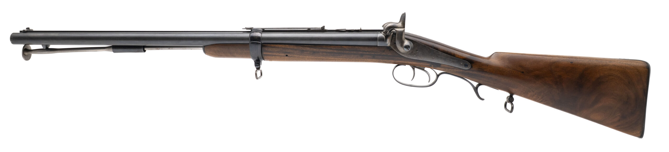 NSN. Made circa 1860. 52.5 caliber with 23.5” barrel. This is a rare Jacob’s Rifle was the invention of Brigadier General John Jacob of the Bombay Army of the East India Company. He saw the deficiencies of the Brunswick rifle and decided to come up with a better design. Among these features was it being a double rifle that took a sword bayonet with a 30” blade, 4 groove rifling and a 2,000 yard sight. This gun was made in 1860 as dated by the locks. The patch box has the signature Jacob’s rifle markings Both the metal and wood have been nicely refinished which is not uncommon among British guns of this era. As scarce as these guns are, the bayonet is much more scare and this gun has its bayonet!