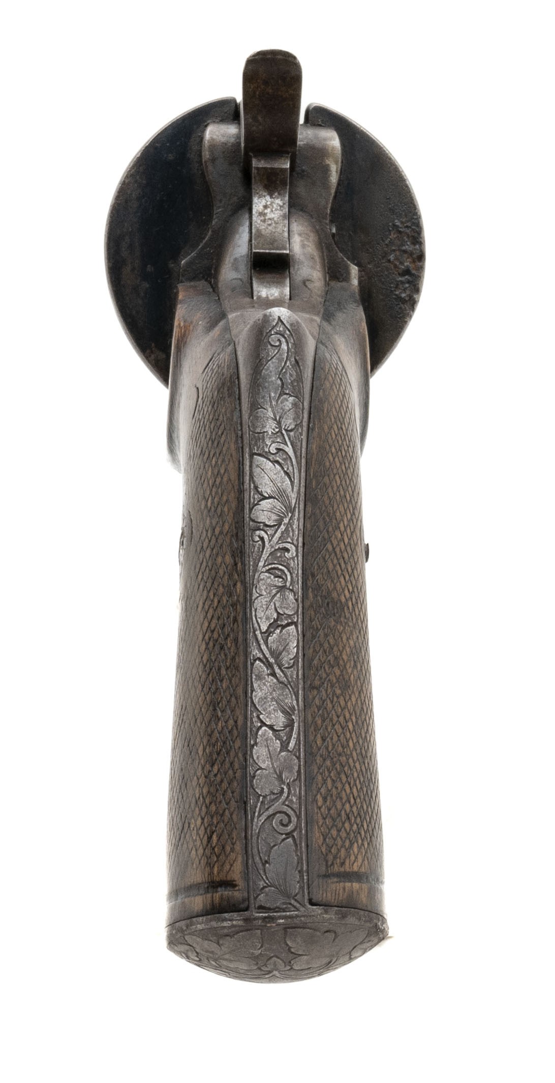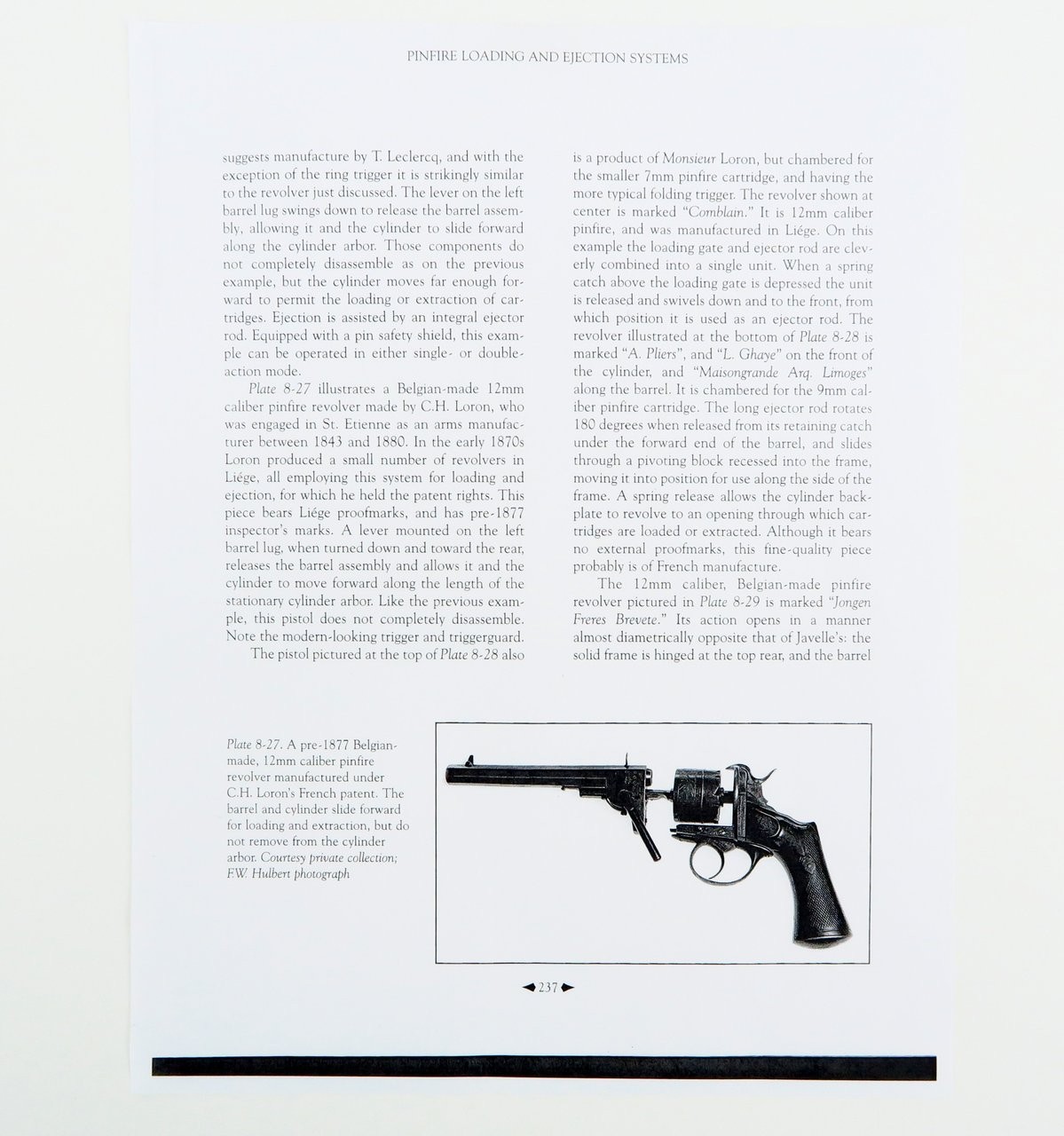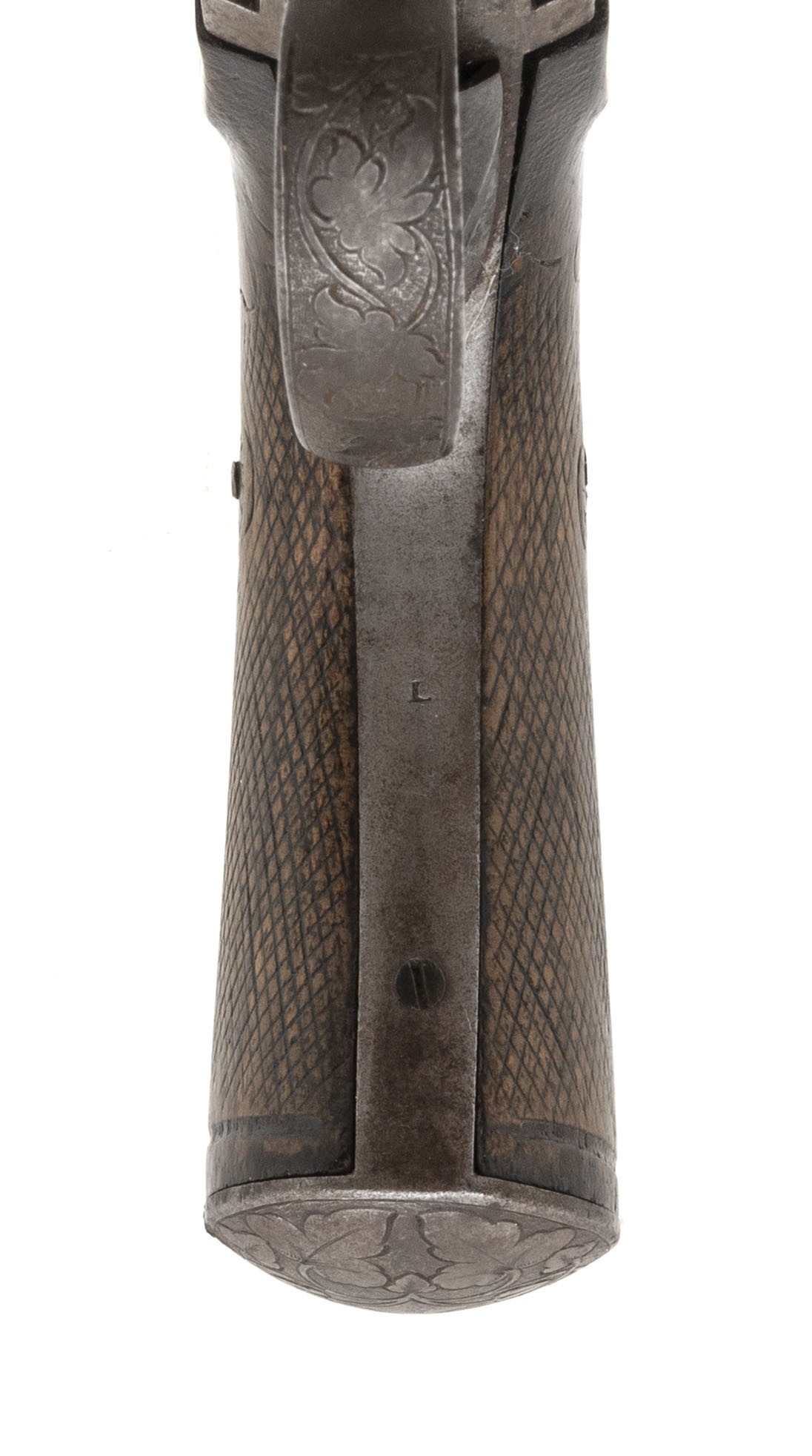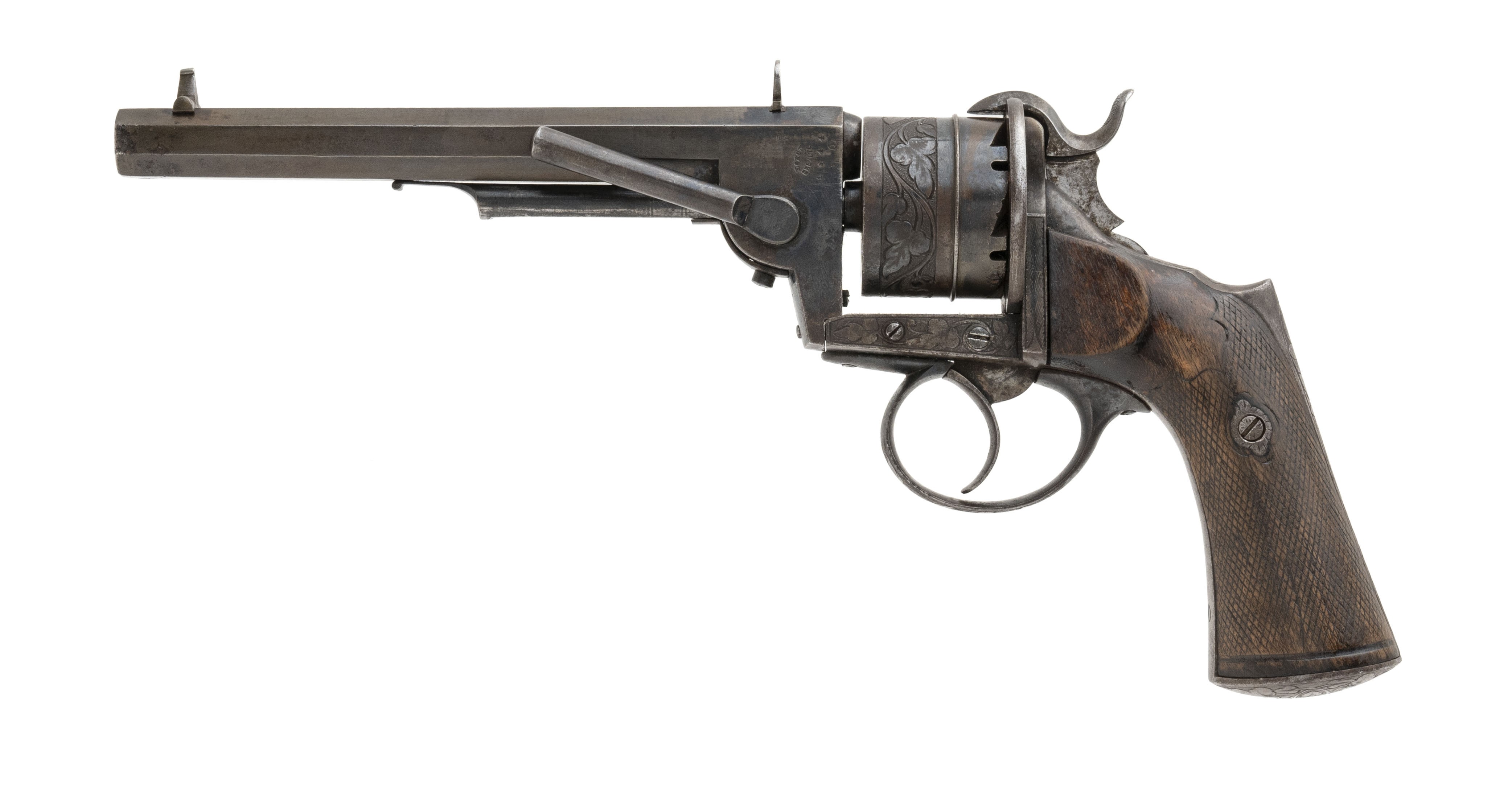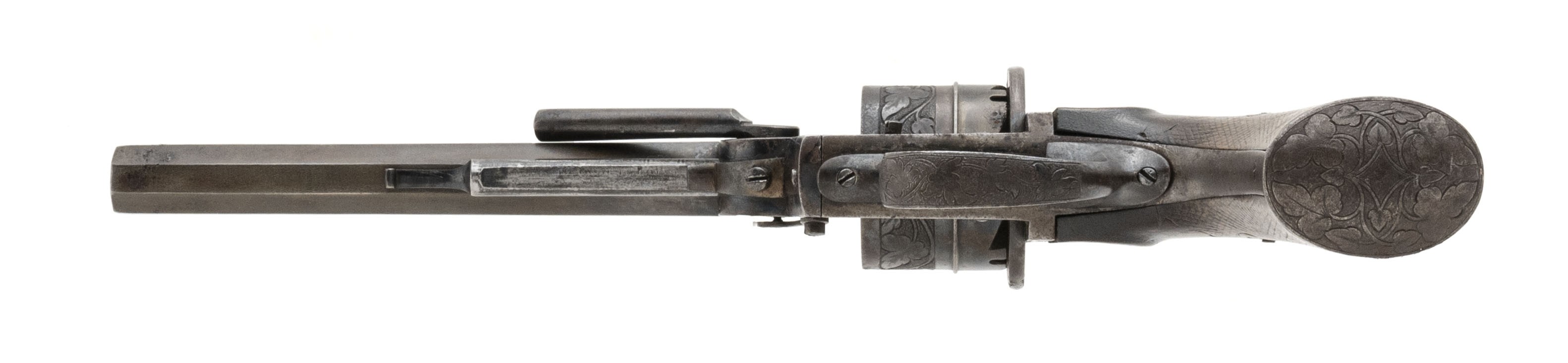 Scarce Pinfire Revolver by C. L. Loron. Very interesting system! The lever on the left hand side comes down to unlock the barrel from the frame. The barrel slides forward and the lever on the left hand side acts as the ejector when the cylinder slides forward. This is also how the gun is to be loaded. An example of this system is pictured and described on page 237 of System Lefacheaux by Chris Curtis. Gun is nice and sharp with some of the finish on the frame and the barrel has turned to a brownish patina. Very neat gun!