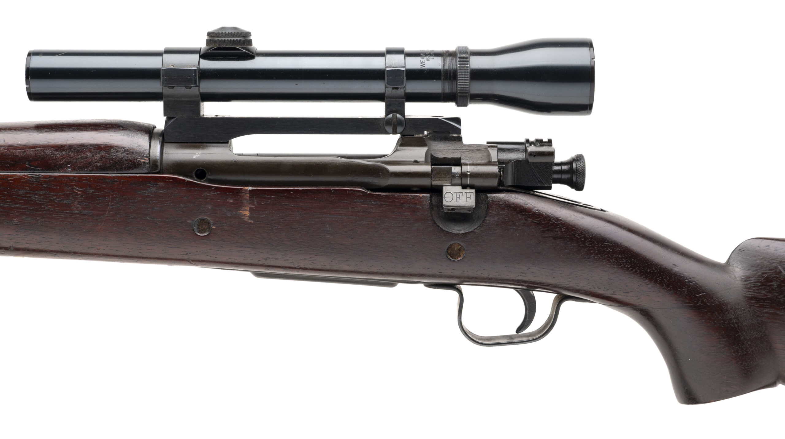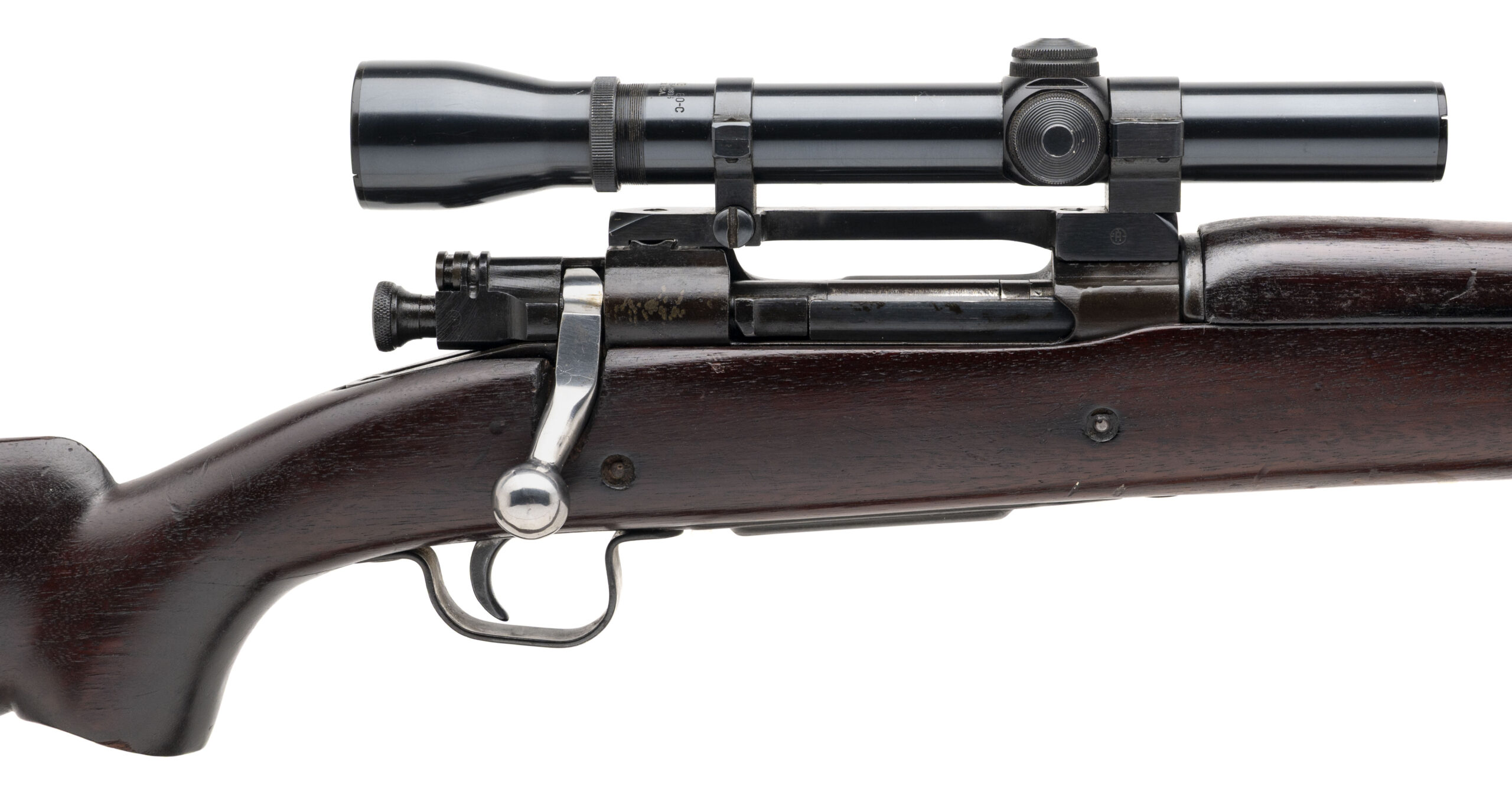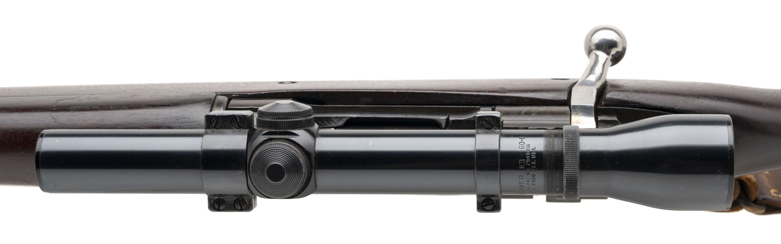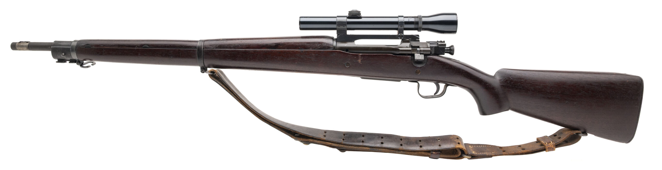 Serial Number 4101310. Made in 1944 with a 24-inch round barrel made by Remington in December 1943. The bore is bright with strong visible rifling. Although this is an M1903A3 rifle, it has been converted in such a way as to produce an M1903A4 sniper rifle clone using a Weaver K3 60C telescopic sight with tapered post reticle. The front sight has also been removed as a part of the conversion to the 1903A4 configuration & the bolt handle has been modified to clear the scope. The channel in the receiver that was cut to accommodate the modified bolt handle has been crudely colored with what appears to be cold blue. The WW2 production M1903A3 C-stock has been notch modified for the bolt handle as well. A stress crack is developing in the stock at the rear of the trigger guard, but that crack can be repaired. Overall condition is fair. Comes with a leather M1907 sling.