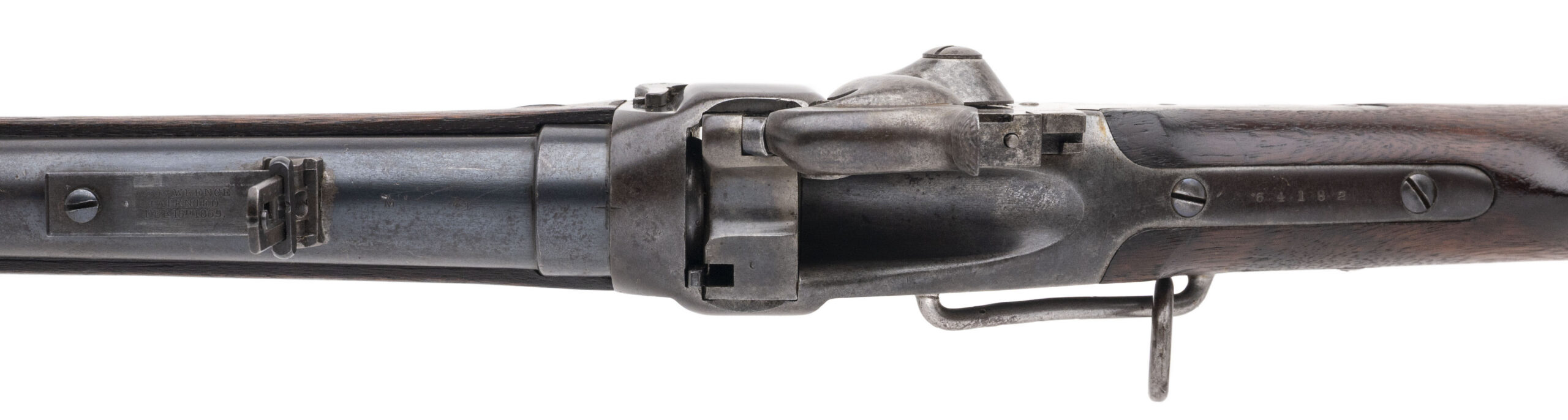 Serial number 64182. Made circa 1863-1865. 50-70 caliber with a 22” barrel. This gun is in very fine condition with 90% of the original blue. There is one spot of pitting on the left hand side of the barrel 4.5” from the muzzle. The frame is mostly a light tan colored patina with visible case colors in the protected areas. The wood is excellent. The cartouches still remains sharp. The action works perfectly and the bore is excellent. Very fine example of a Sharp carbine!