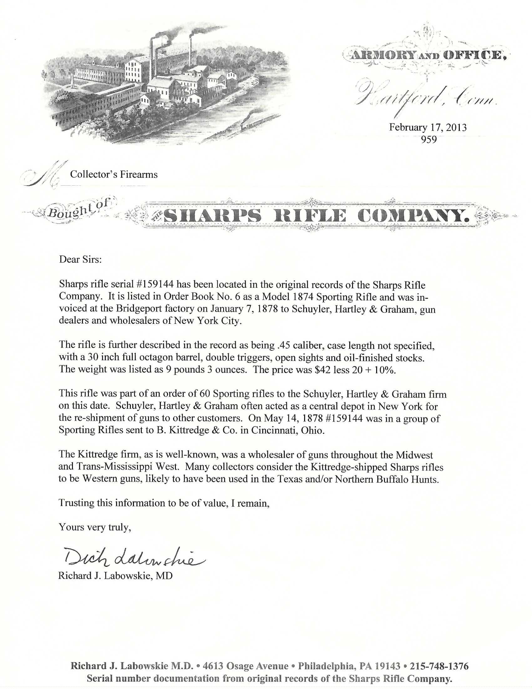 Serial number 159144. Made in 1878. 45-70 caliber with a 28.5” barrel. This gun has a light brown patina. The wood is very good. This gun has a double set trigger. This gun comes with a factory letter. The barrel has been shortened. This gun was sold to Schuyler, Hartley & Graham. It was then sent to B Kitteridge and company which supplied smaller stores on the Western frontier.