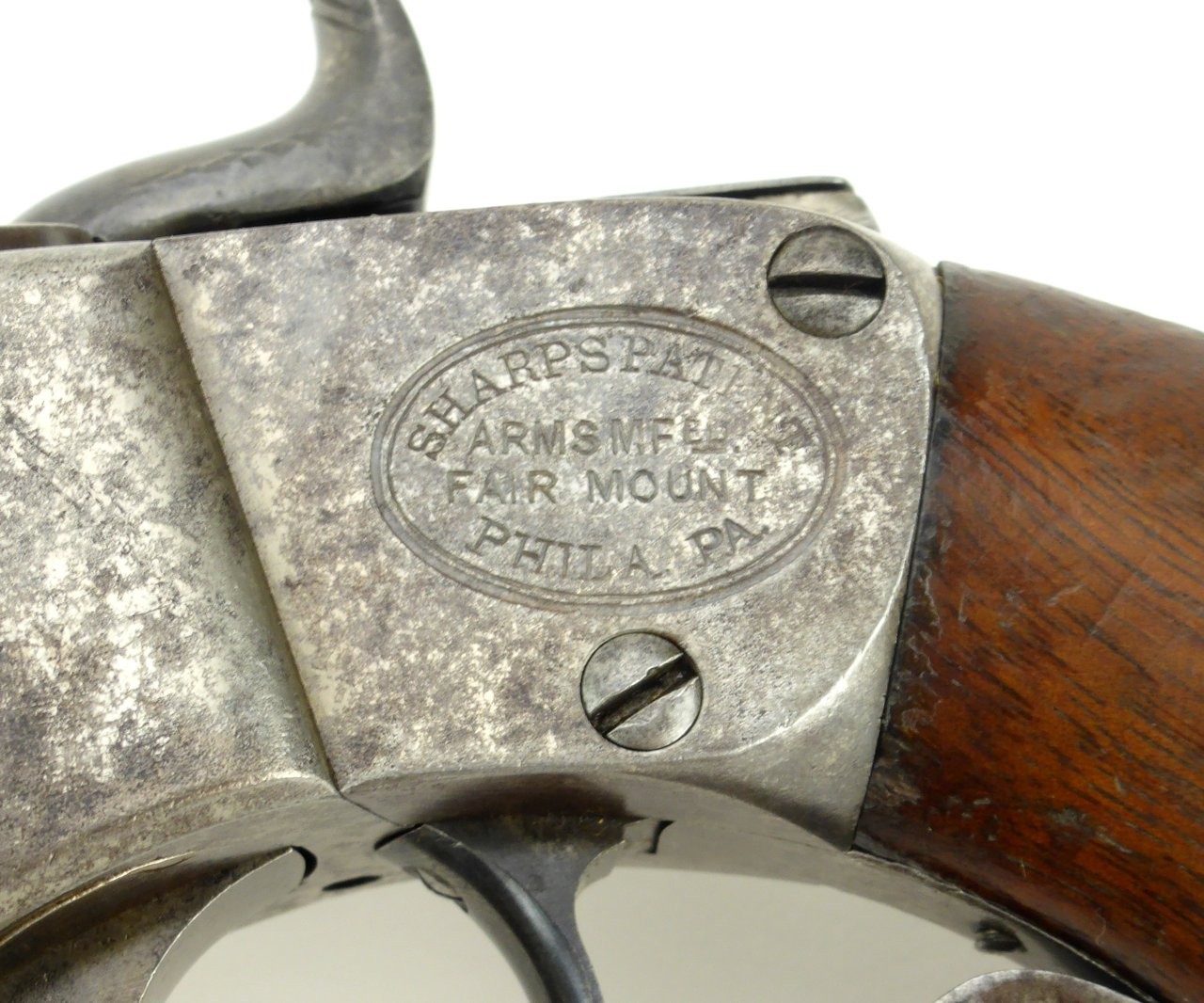 Sharps Breech loading percussion pistol. Very scarce gun! This gun has a nice smooth even patina on all of the metal services. Very sharp gun with excellent markings. This is serial number 235 and this gun is all matching. Grips are very good. Action works perfectly. Bore has strong rifling with some pitting in the grooves.