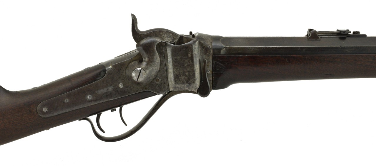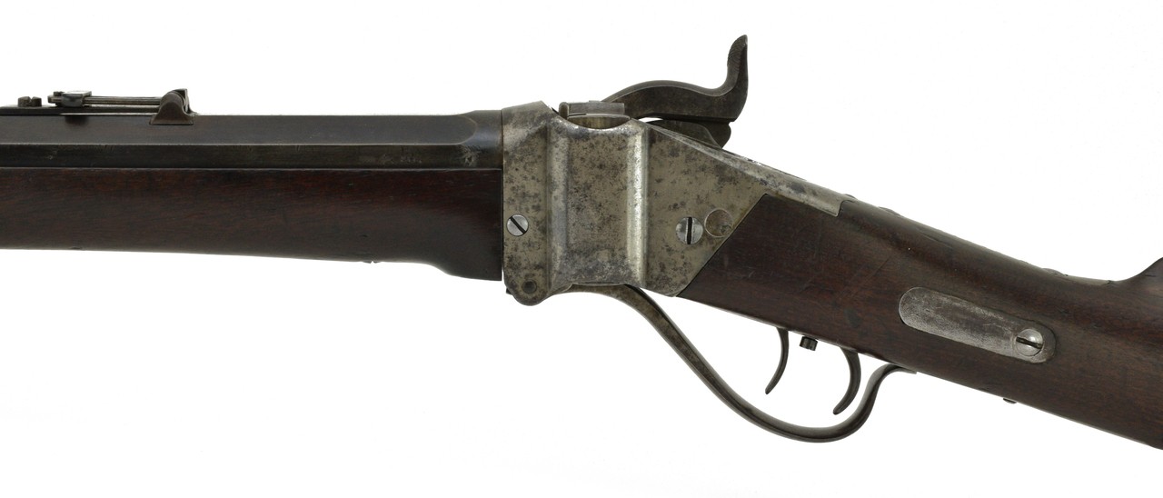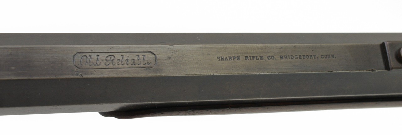 Sharps Conversion .45-70 caliber rifle. Sharps .45-70 caliber rifle. Post Civil War Conversion. Barrel length 30 inches. Weight is 10 lbs. Barrel has the old Reliable trademark on the barrel. Gun has an adjustable set trigger that works perfectly. Barrel also marked “Sharps Rifle Co. Bridgeport Conn.” Rear sight is a folding ladder with M.S. Lawrence patent mark. Barrel has good bore with strong rifling and light corrosion in the grooves. Barrel has good blue. This rifle is very good condition overall. The only blemish is a pit area on the bottom flat of the barrel near the muzzle. Very nice buffalo hunters Sharps. Note: The barrel has a matching serial number to the frame.