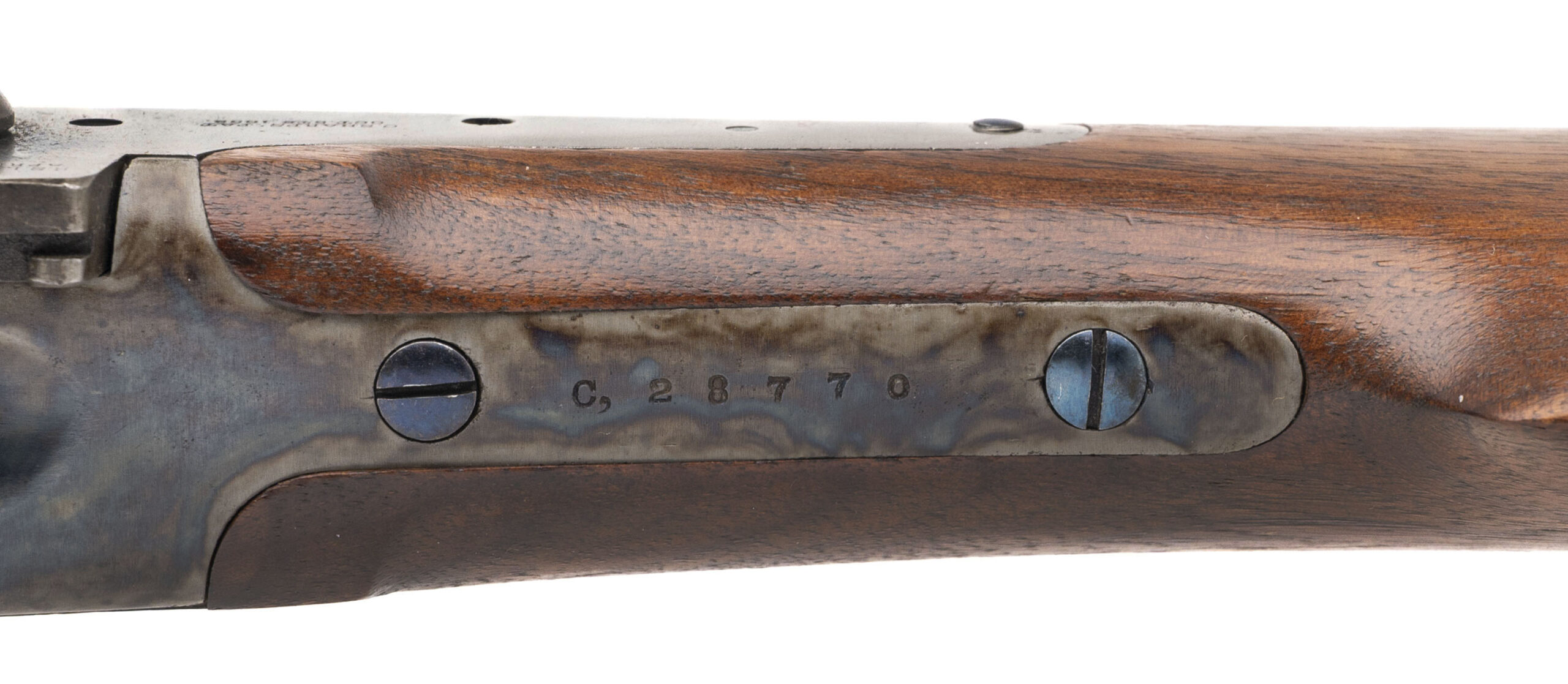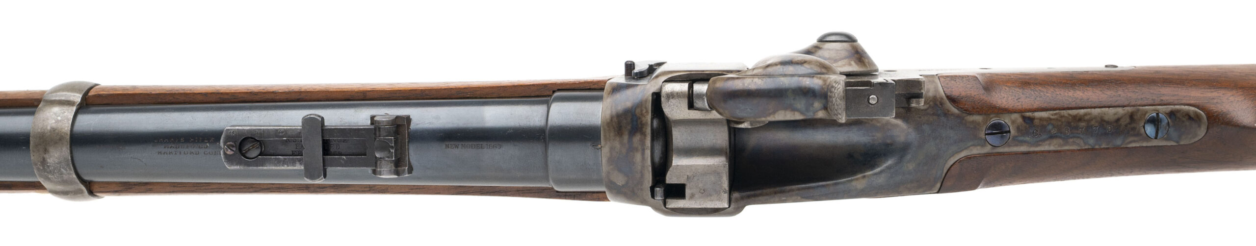 Serial number C28770. Made circa 1863-1865. 50-70 caliber with a 30” barrel. This a cartridge conversion converted in 1867. Approximately 1086 of these rifles were converted to cartridge. This gun is in excellent condition with virtually all of the factory finish. The wood is excellent with nice sharp cartouches. This is a top notch example of a Sharps Model 1863 Military Rifle Cartridge Conversion!