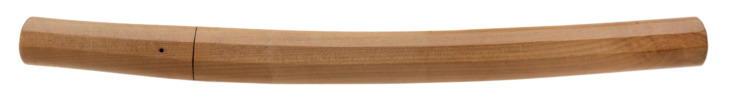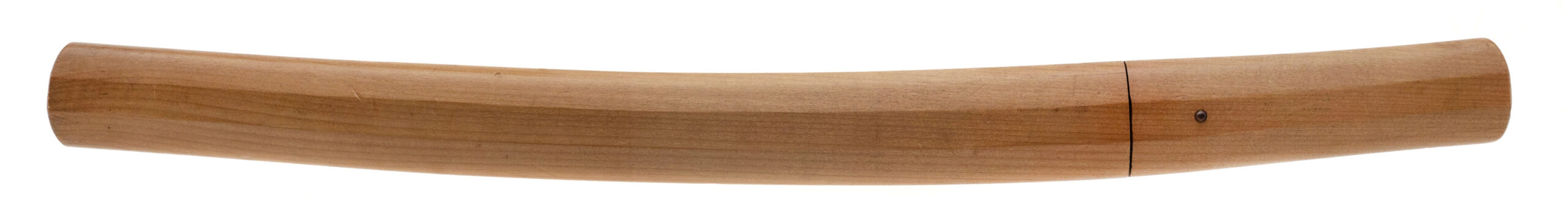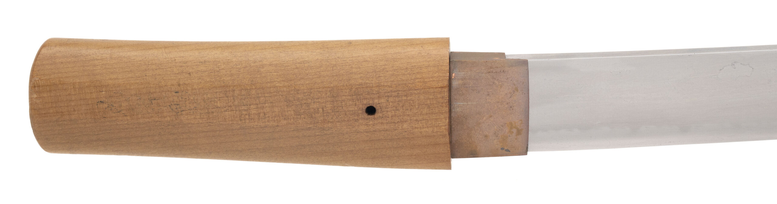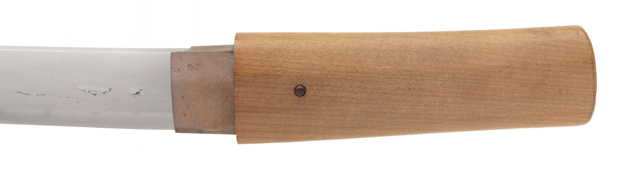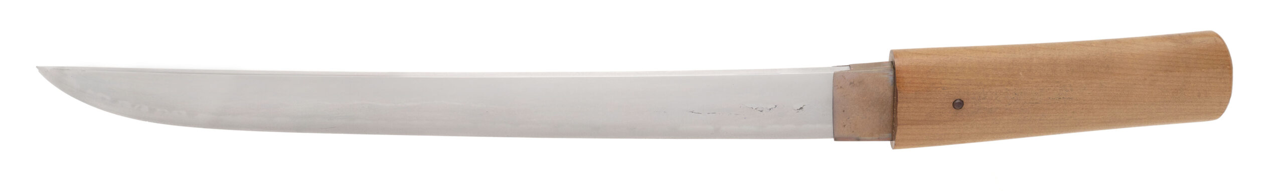 Signed 渡邊則千代作 (Watanabe Norichiyo saku) Nagasa: 36.4 cm (14 5/16”) Nakago: one mekugi-ana, patinated, signed Sugata: straight to shallow-curved ko-wakizashi with standard kissaki Era: Edo period, Shintō era (17th–18th century) Mounts: simple copper habaki, shirasaya section This ko-wakizashi is signed by the otherwise little-recorded smith Watanabe Norichiyo, whose name does not appear in the standard modern indices, suggesting either a provincial maker or a rare signature variant. The blade has a straight to very shallow-curved form typical of mid-Shintō work, with a suguha to shallow notare hamon visible in the current hybrid polish. The nakago shows appropriate age patina and well-cut mei. Condition: The blade remains in solid polish with the hamon visible, though there are scattered kitae-ware and a small chip at the kissaki;.