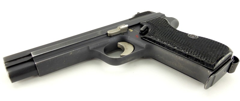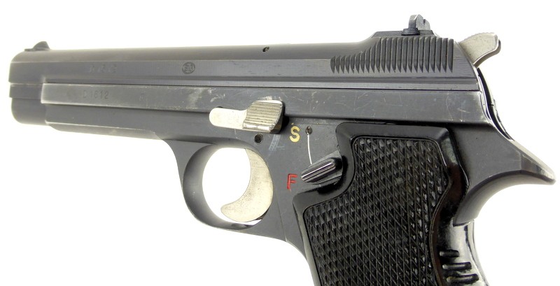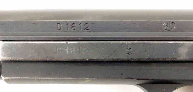 Sig P210-4 9 mm Luger caliber pistol. Scarce 4" model designed for German border guards with "D" serial number range and special loaded chamber indicator. Excellent condition with service holster.