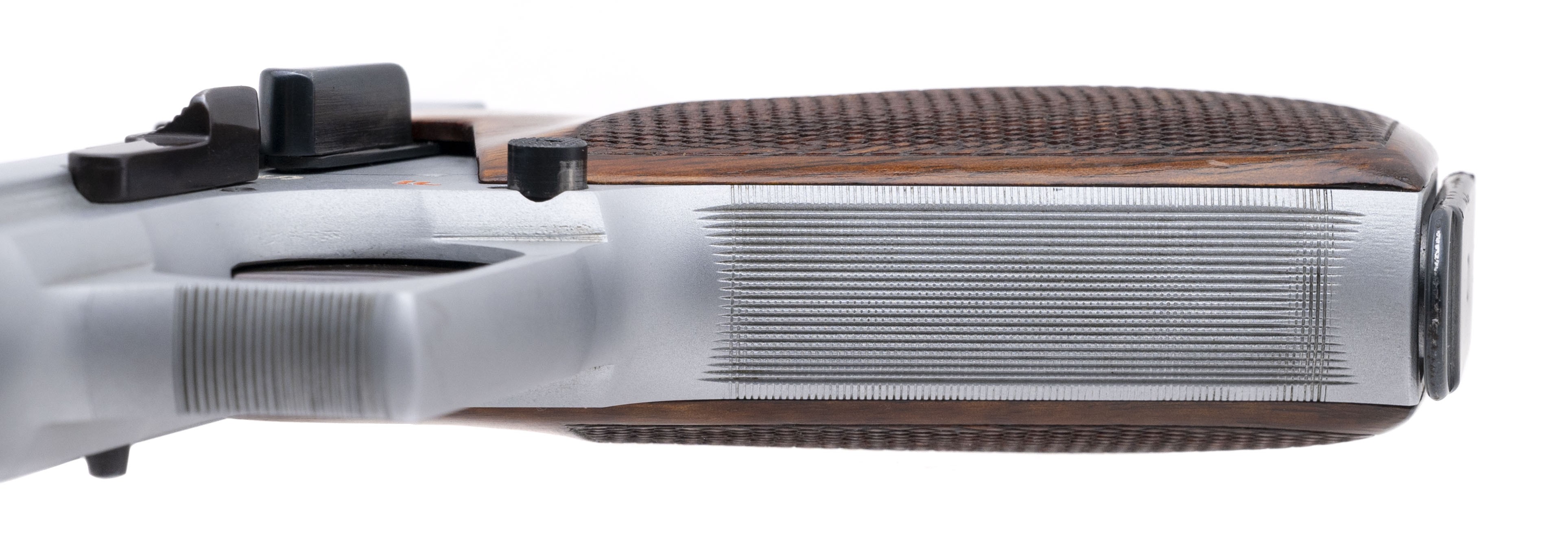 SN: P300704. 1980’s vintage 9mm with a 4.7” barrel. Bore is excellent. Custom combat conversion of a Swiss made SIG P210. Has 2-tone finish, push button mag release, extended safety lever, squared off trigger guard, checkered grip frame and custom walnut grips. Excellent condition with box, papers, tools and 2 extra mags modified to work with the mag release. A neat custom job. (CONSIGNMENT)