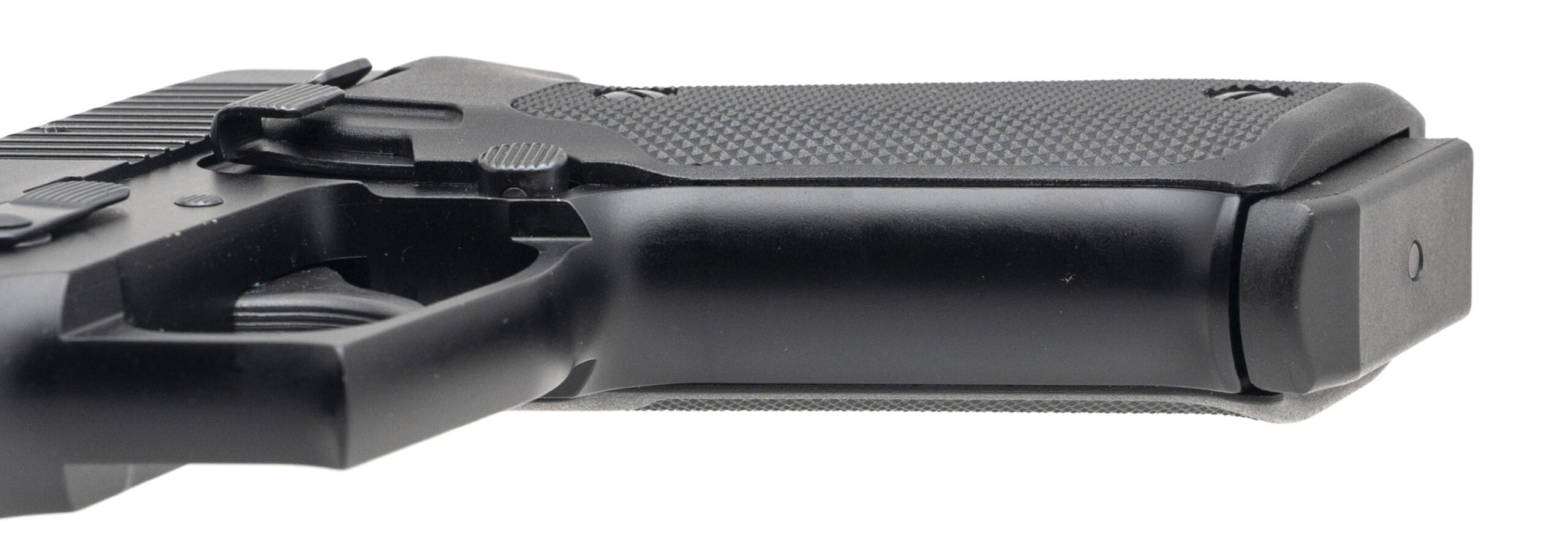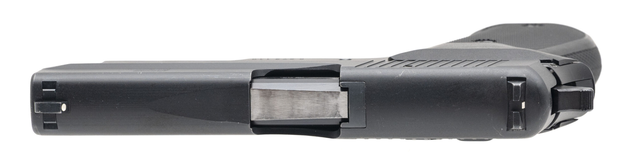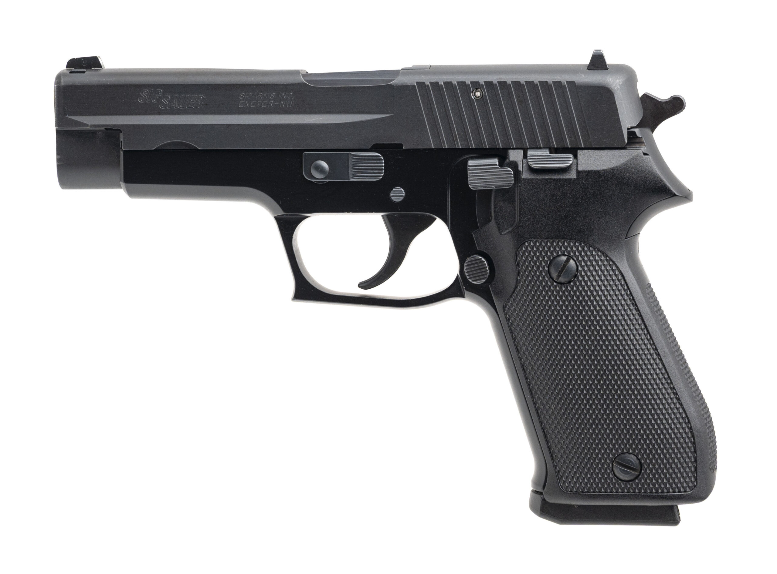 SN: G272110. Double-action/single-action handgun made by Sig Sauer c. 1995. 4¼" barrel chambered for .45 Auto. Good condition overall with handling marks and edge wear throughout the grey nitride slide and black anodized frame finishes. Bore is in great condition with clear rifling at both the muzzle and chamber throat. Comes with two spare magazines.