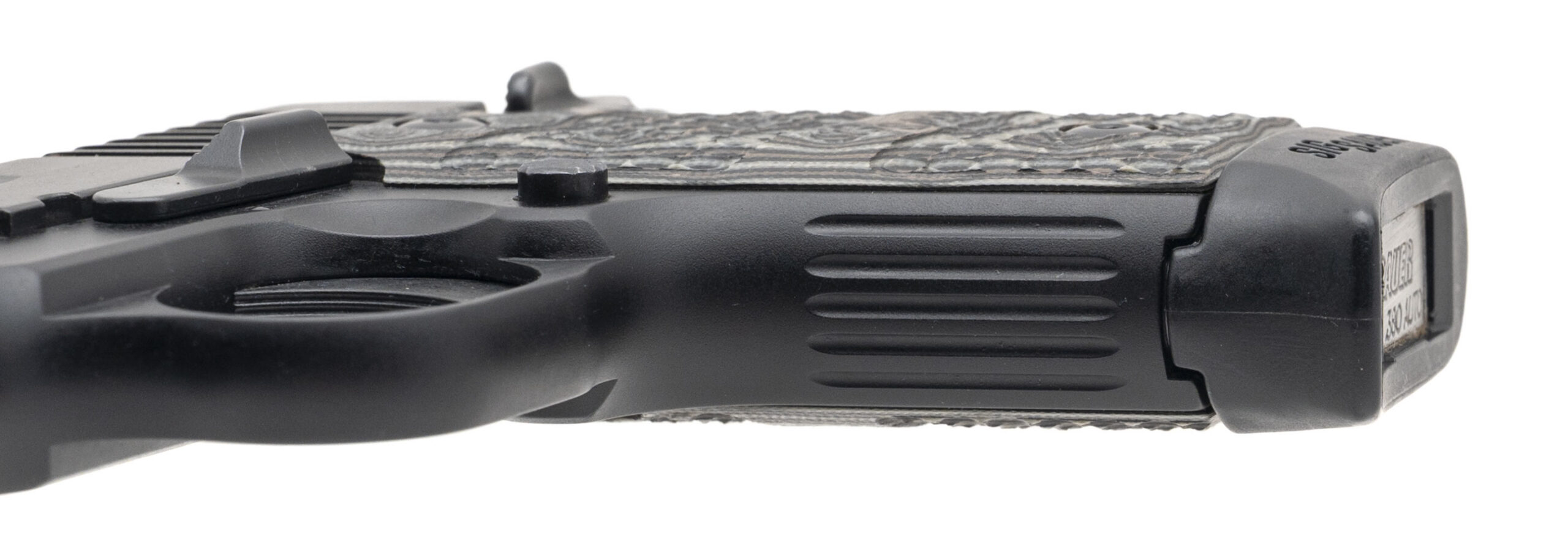 SN: 27B110456. Modern production. Subcompact hammer-fired pistol made by Sig. 2¾" barrel chambered for .380 Auto. Very good condition with some holster wear in the black anodized frame and black cerakote slide finishes. Stippled G10 grips and mainspring housing are excellent. Comes with original box, one 7-round magazine and a holster.