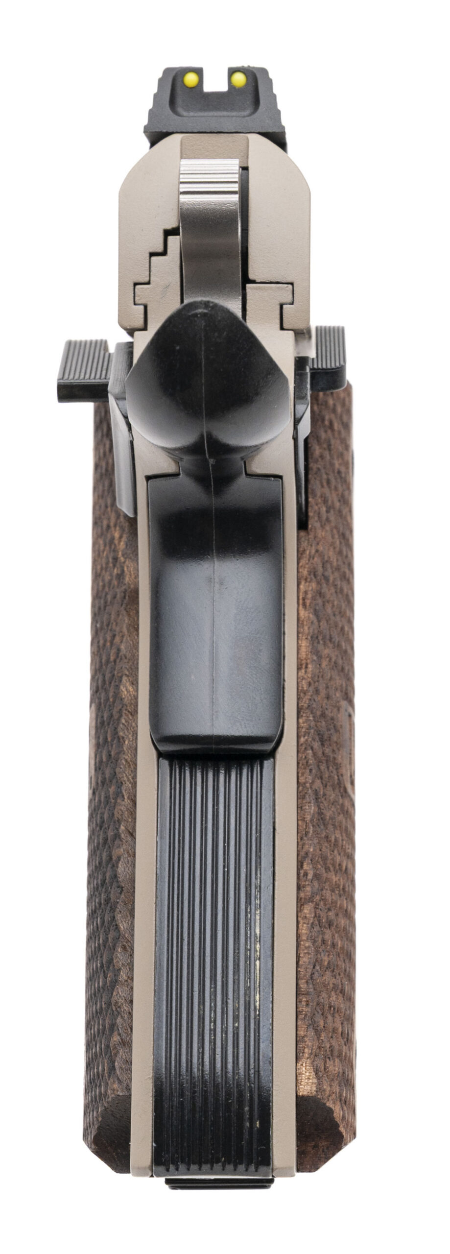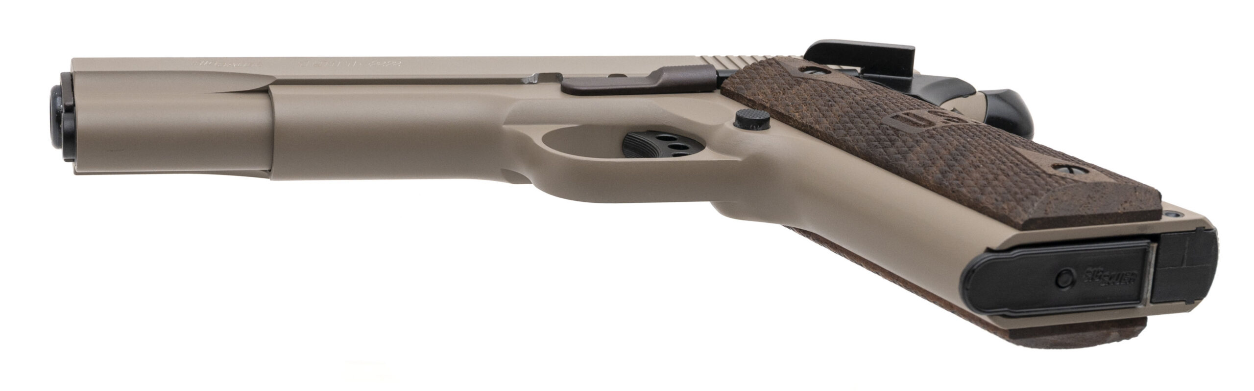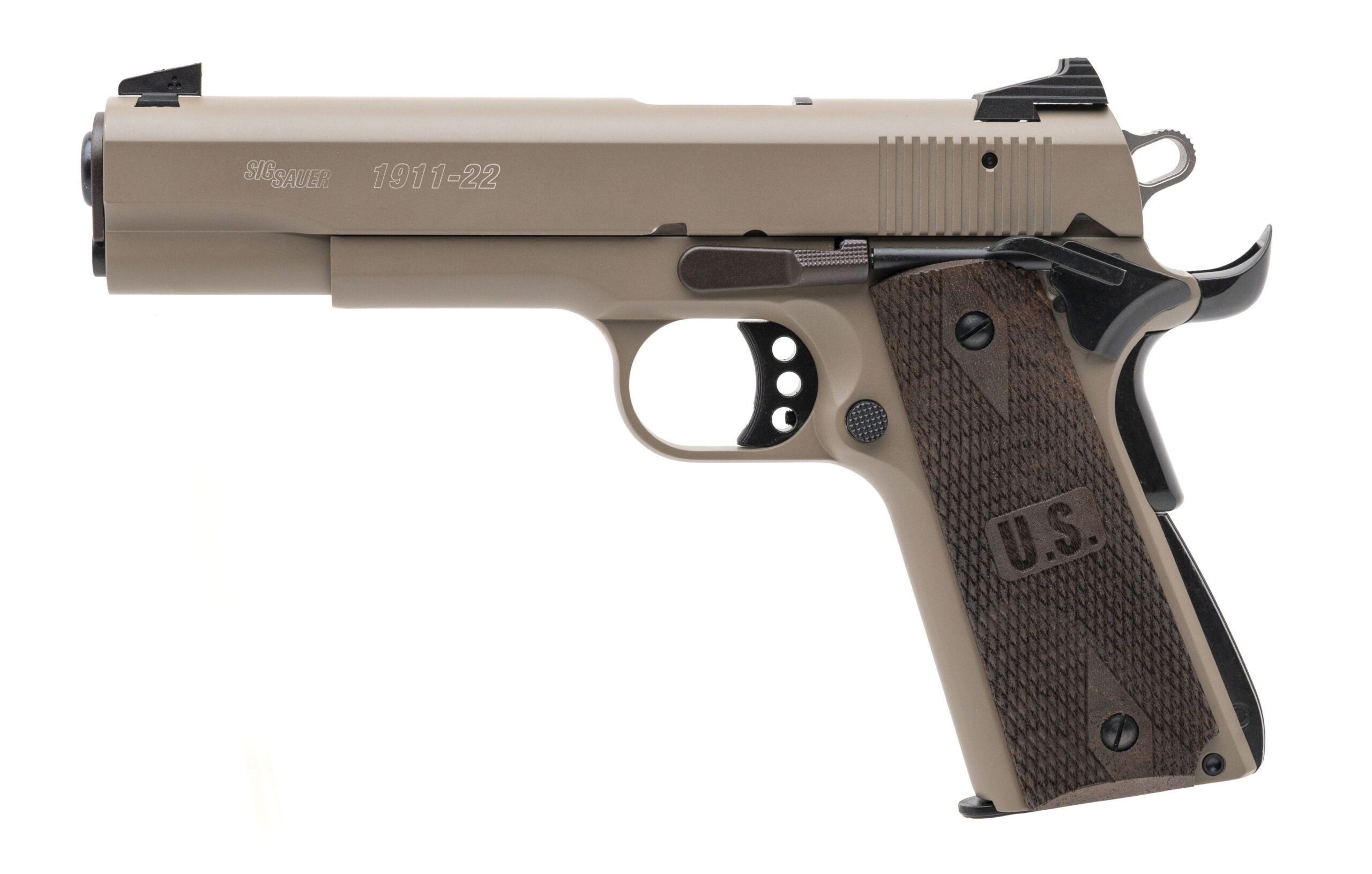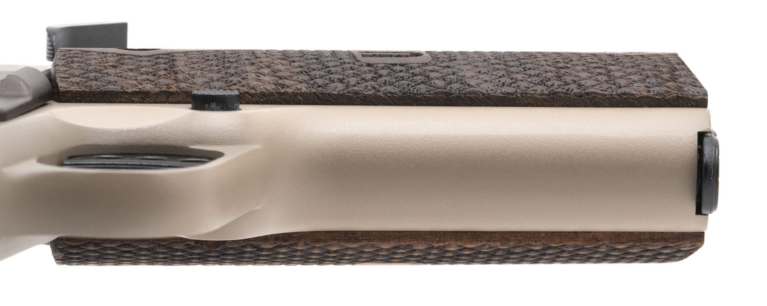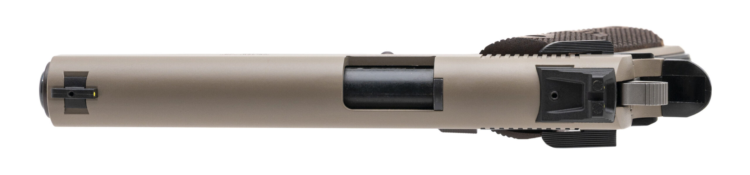 SN: F286438. Modern production, .22LR with a 5" barrel. Bore is very good. Single-action only alloy frame 1911 style rimfire pistol with 3 dot sights, ambidextrous manual thumb-safety, FDE finish, and checkered rosewood grips. Overall condition is excellent. Includes original case.