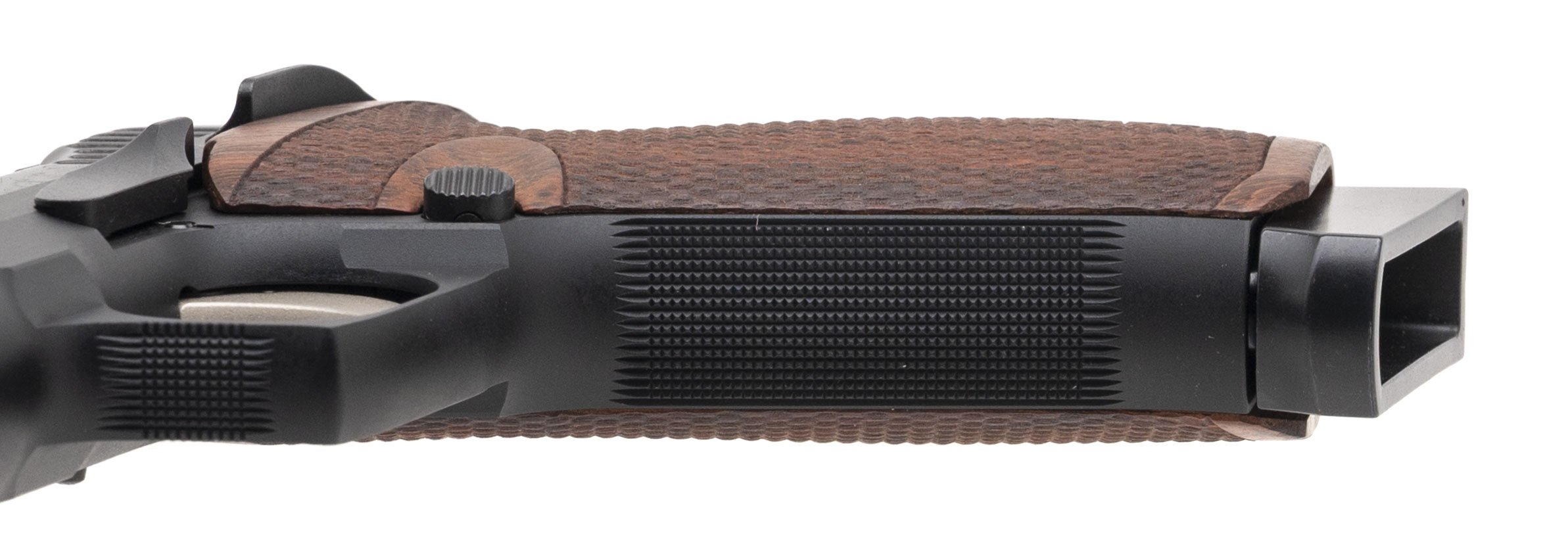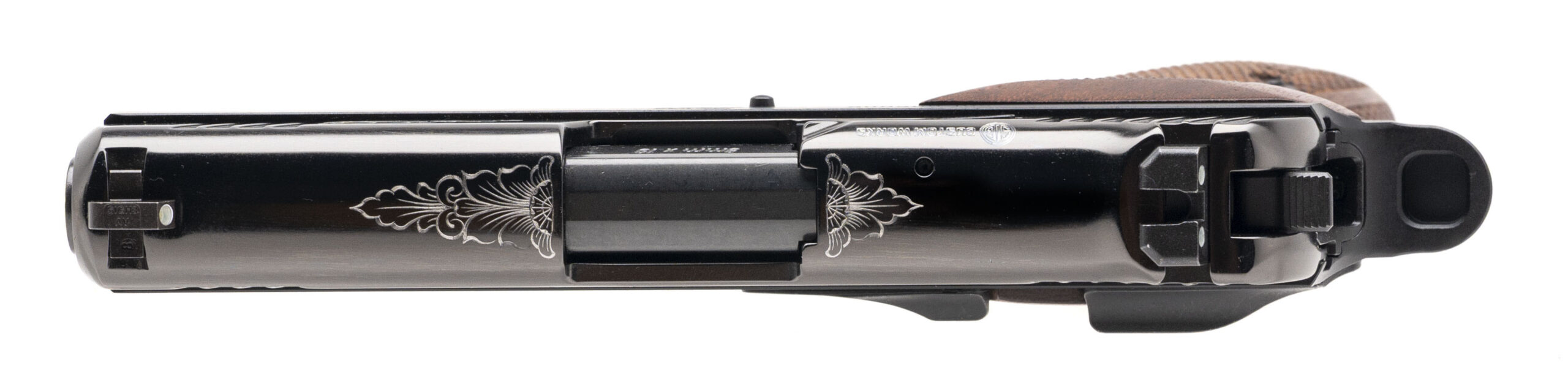 SN: 59E005006. modern production, 9mm with an 4.1" barrel. Beautiful Custom Works Edition carry pistol with a high polished blue finish w/engraved scrollwork, Caribbean Rosewood grips, e-nickel coated trigger, and Siglite night sights. Excellent condition with case and Custom Works collectors coin.