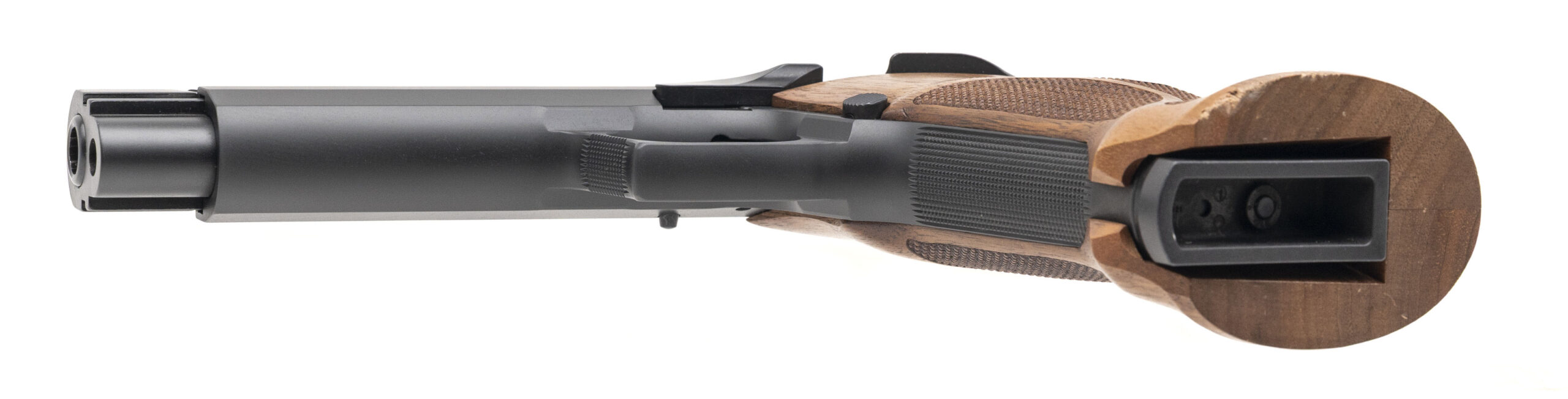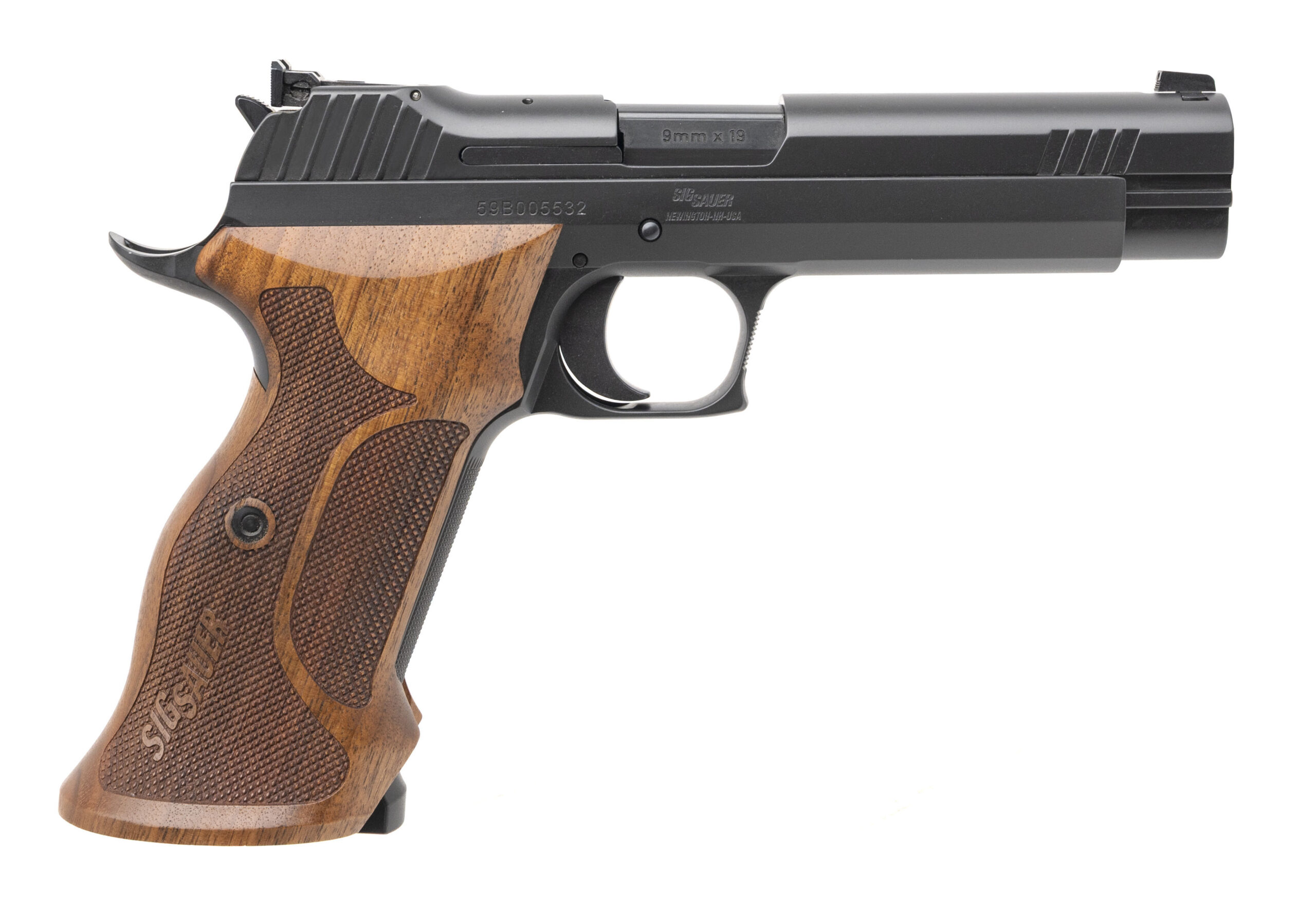 SN: 59B005532. Modern production, 9mm with a 5" barrel. Bore is excellent. Full size steel frame single-action only target pistol with a fiber-optic front sight, adjustable rear sight, manual thumb-safety, target grade trigger & checkered wood grips, and nitron finish. Finish shows light marks, most notably towards the left side of the muzzle. Overall condition is very good. Includes an additional magazine, and original case.