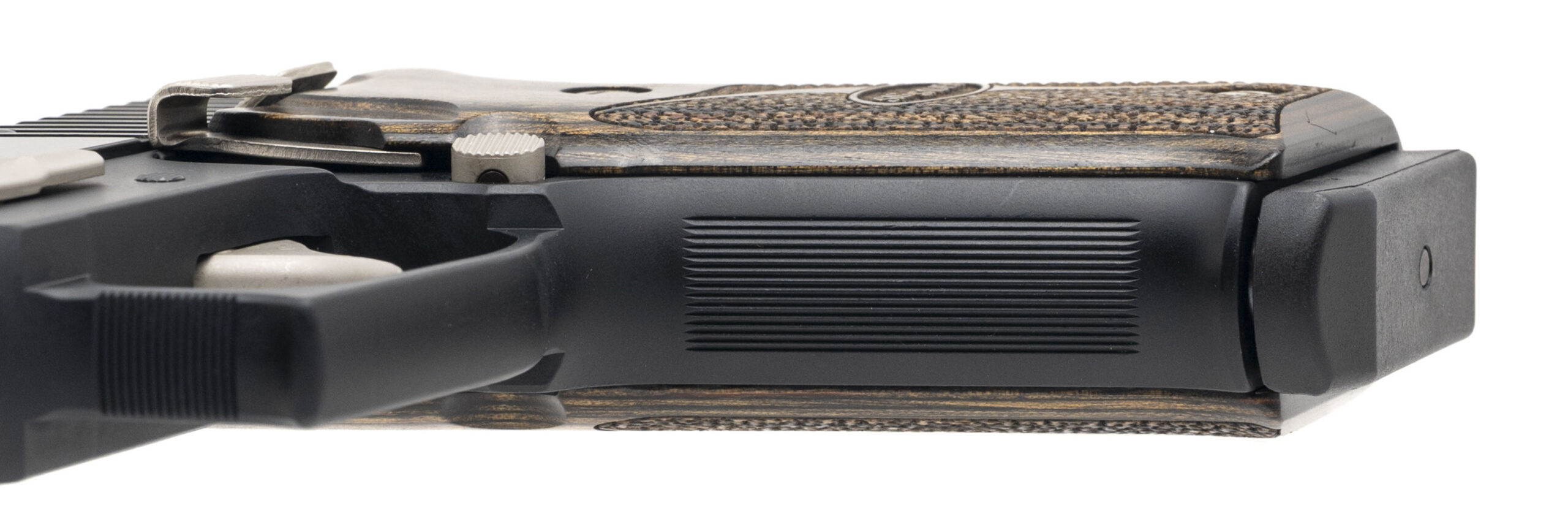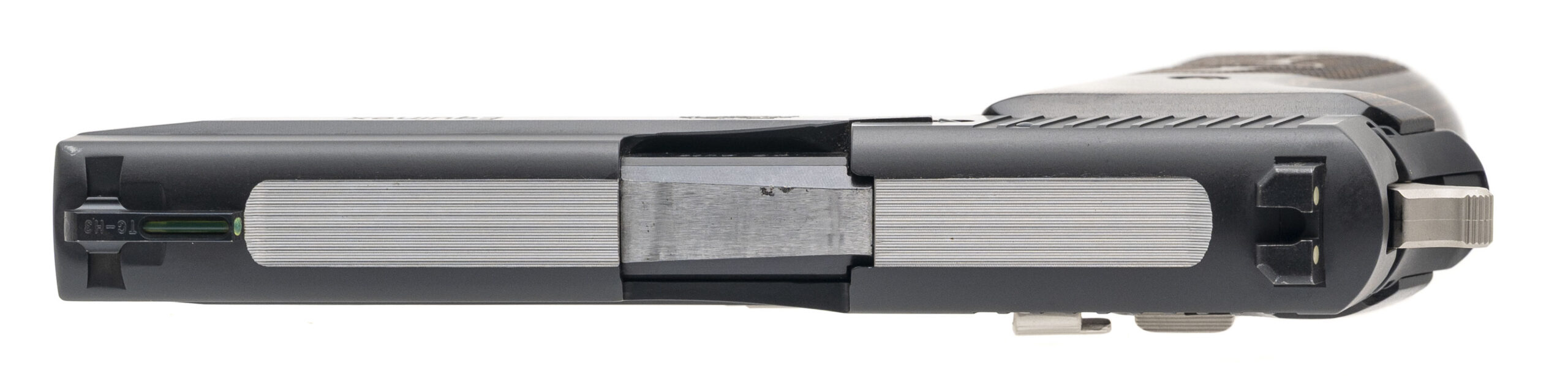 SN: 37A005220. Modern production, .45 ACP with a 4.5" barrel. Bore is very good. Custom shop double-action alloy frame pistol with a tritium fiber-optic front sight, tritium rear sight, manual decocker, matte black finish w/silver & high polish accents, and textured wood grips. Finish shows light marks. Overall condition is very good.