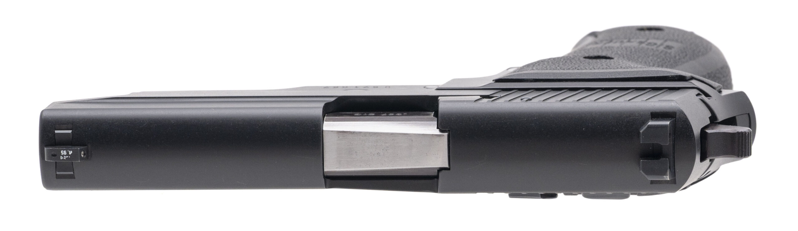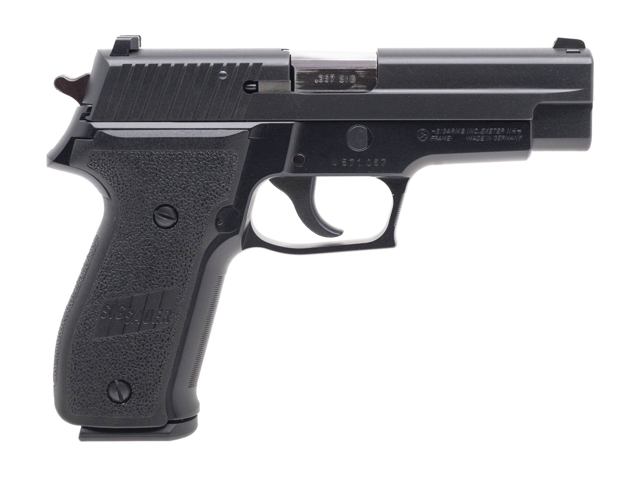 SN: U571067 German made full size double action semi-auto aluminum frame pistol with 3 dot night sights and a 4.25" barrel chambered in 357 Sig. Overall in very good condition. Comes with original case and extra barrel chambered in 40 S&W.