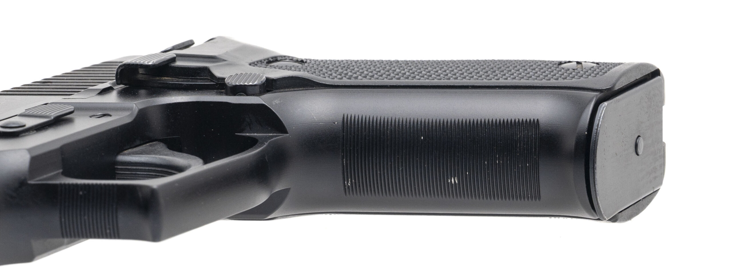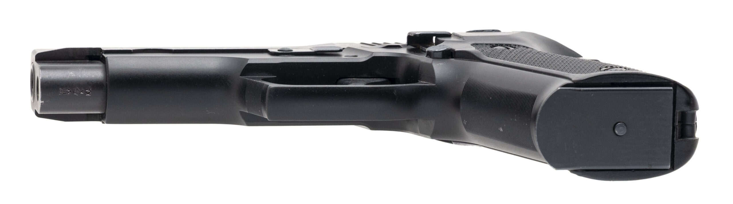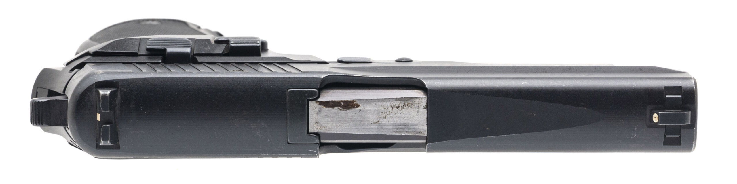 SN: U414242. Made in 1990, 9mm with a 4.25" barrel. Bore is excellent. Full size West German made double-action alloy frame pistol with a white dot front sight, manual decocker, matte black finish, and checkered polymer grips. Finish shows light marks & minor edgewear throughout. Overall condition is very good.