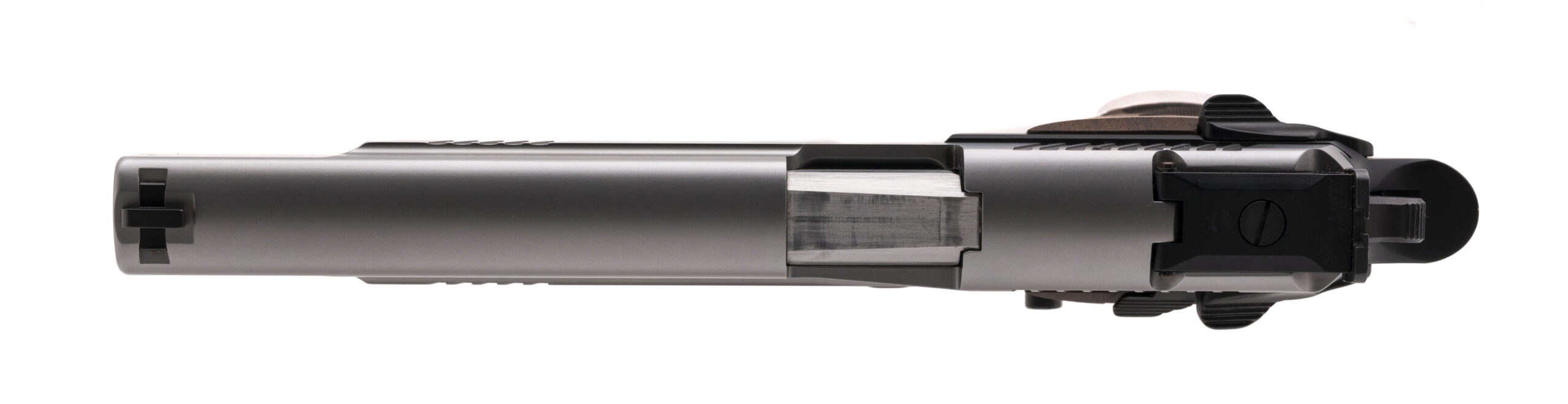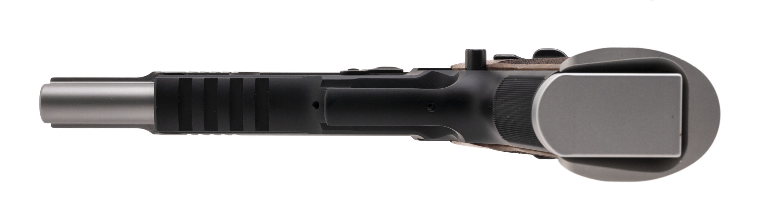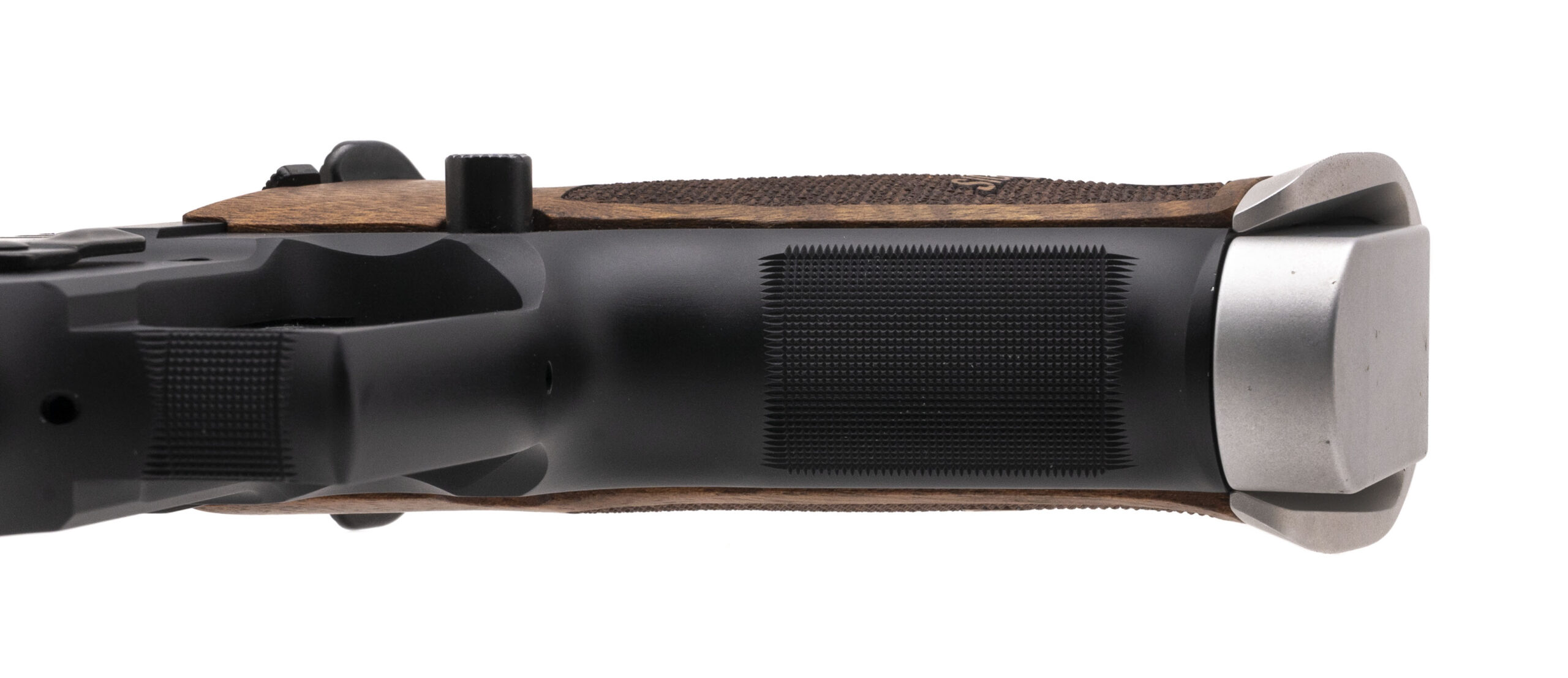 SN: U889979. Modern production 9mm with a 6" barrel. Scarce German made long barrel target pistol with alloy frame and 2-tone finish. Excellent condition with box, manual and extra mag.