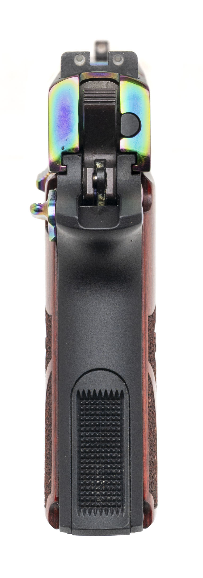 SN: 27B230209. Modern production, 2.7" barrel. Bore is bright with strong rifling. Alloy frame single action conceal carry pistol with night sights, Rainbow Titanium finish, and wood grips. Excellent condition overall. Comes with case, holster, and extra magazine.