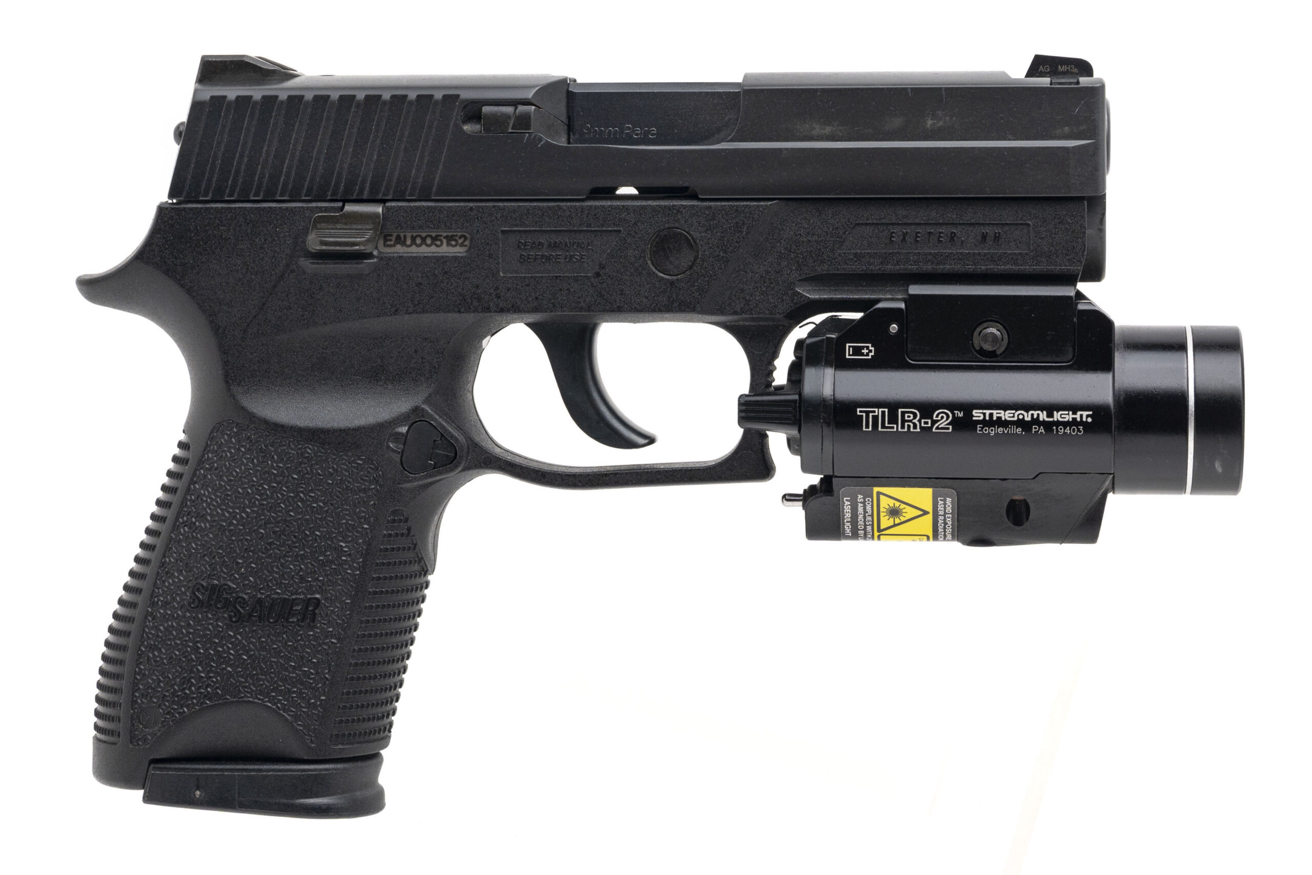 SN: EAU005152. Modern production, 9mm with a 3.9" barrel. Bore is very good. Compact double action only hammer fired pistol with a Streamlight TLR-2 red laser & light combo flashlight and night sights. Very good condition overall.