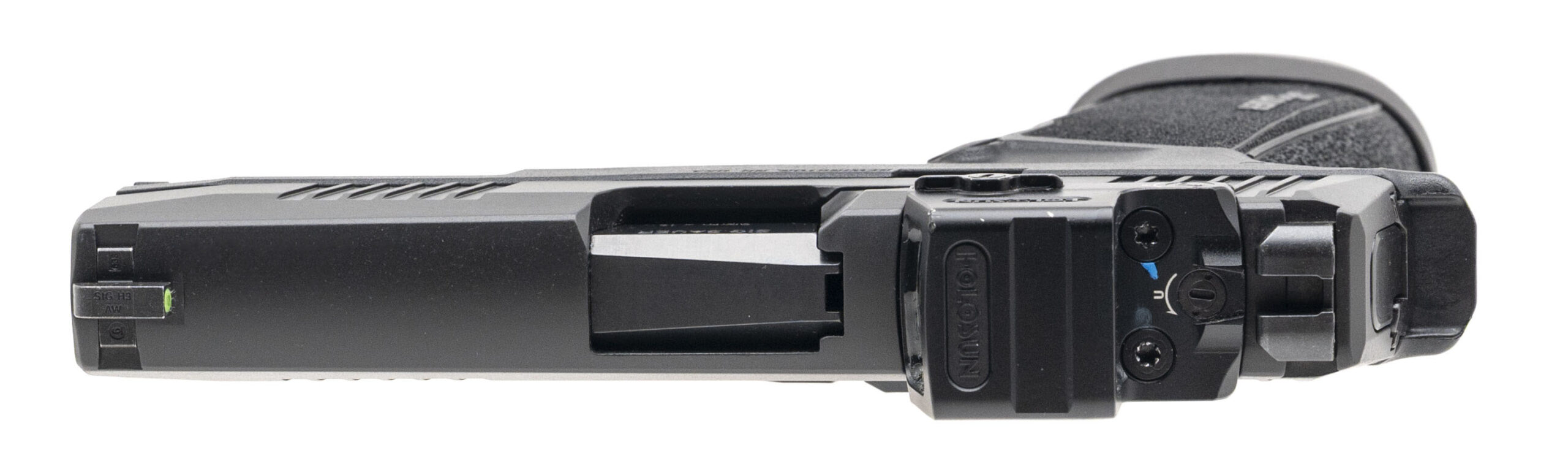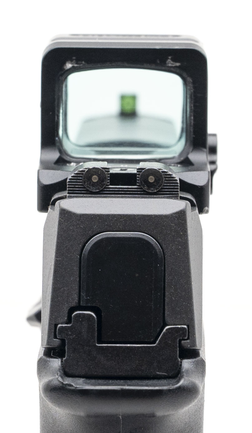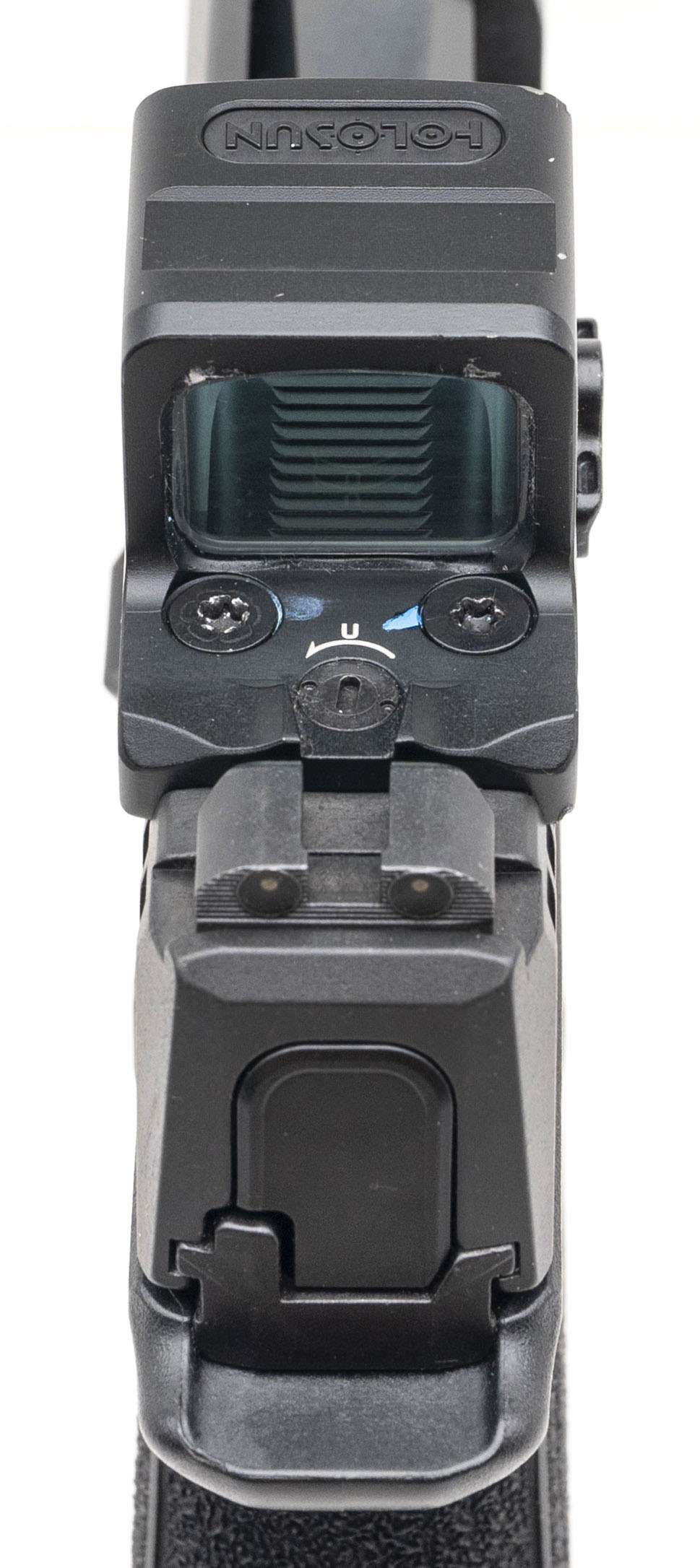 SN: 66G234578. Modern production, 9mm with a 3.7" barrel. Bore is very good. Compact striker-fired pistol with a Holosun EPS Carry red dot sight, M*Carbo flat trigger, X-ray 3 day/night sights, accessory rail, matte black finish, and black polymer frame. Finish shows minor handling marks. Includes an additional magazine, G-Code OWB holster, and original case. Overall condition is near excellent.