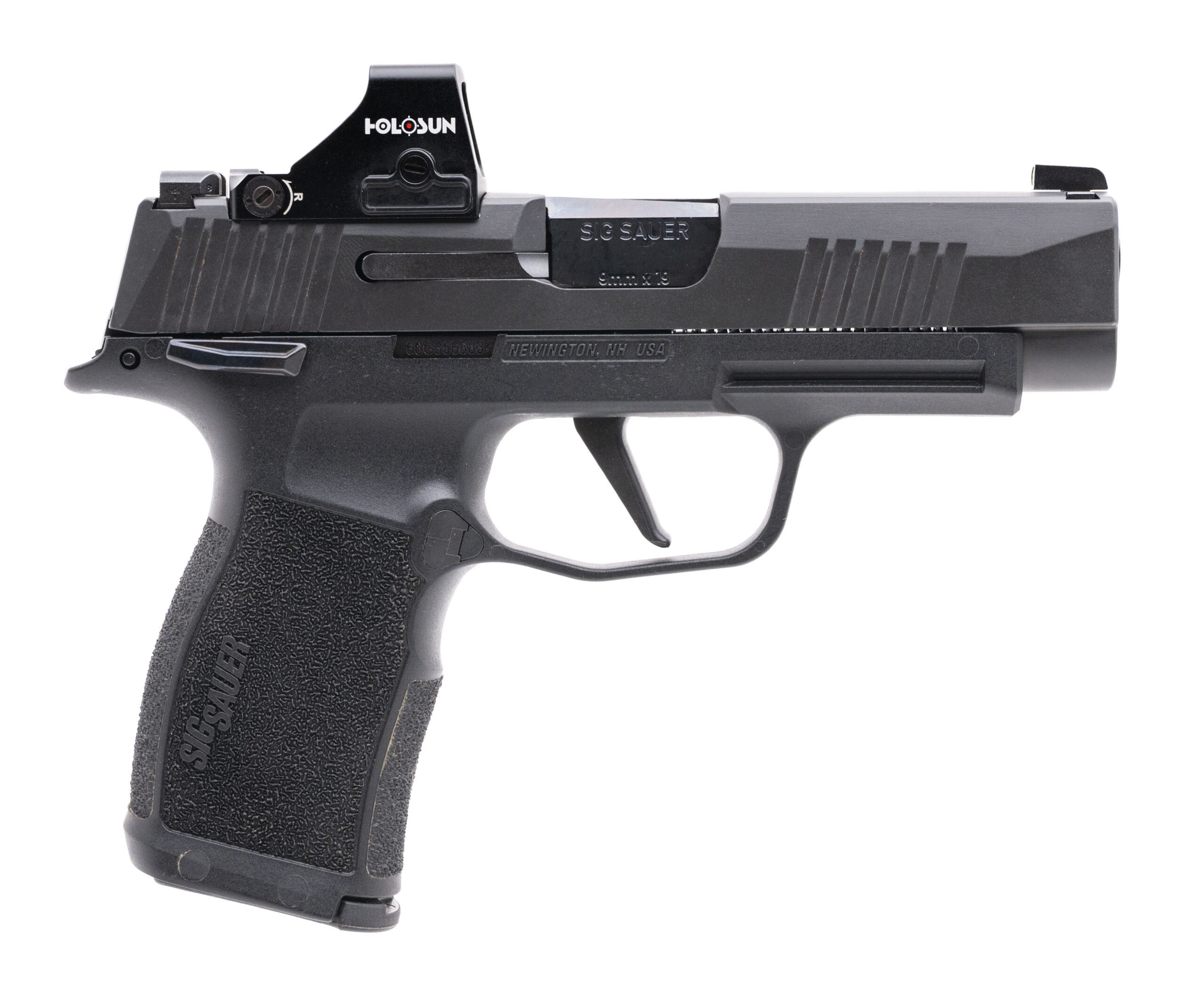 SN: 66G356883. Modern production, 9mm with a 3.7" barrel. Bore is very good. Compact striker fired pistol with a Holosun 407K red dot optic, night sights, and manual safety. Very good condition overall with case, holster, and an extra magazine.