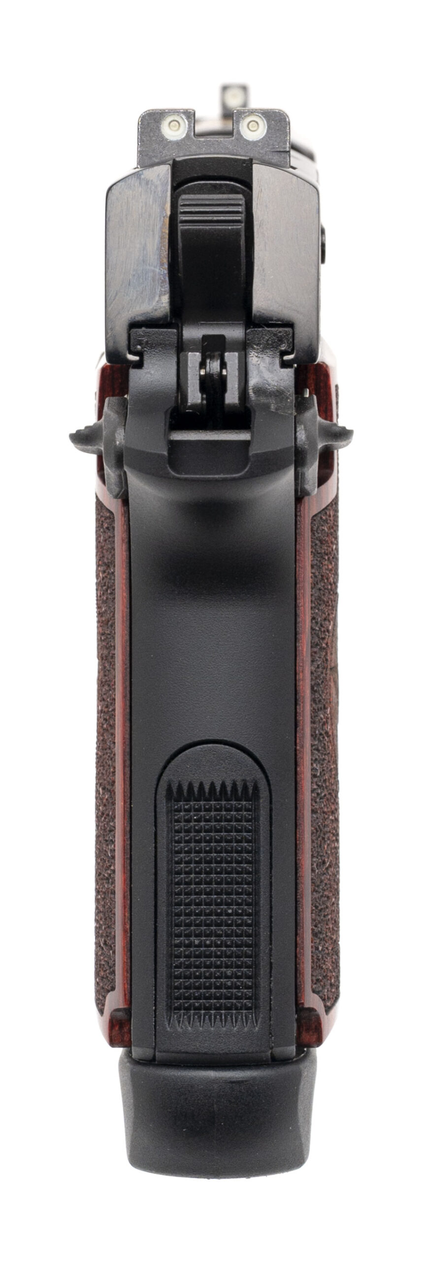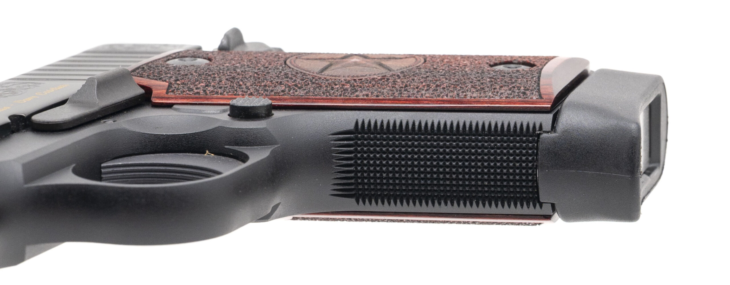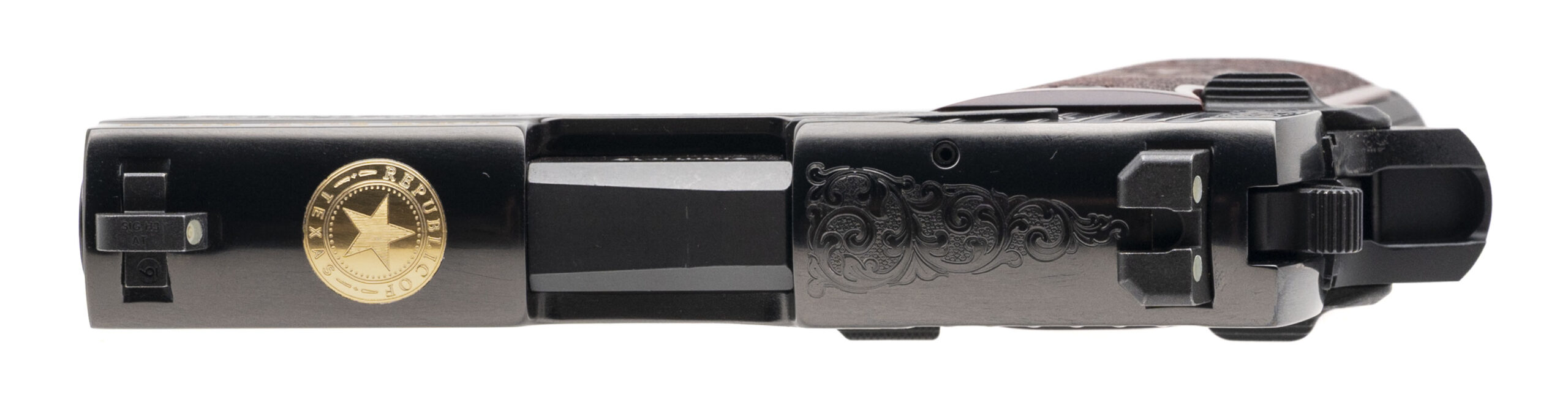 SN: 52E091256. Modern production, 9mm with a 3" barrel. Bore is excellent. Commemorative single-action only pistol with night sights, ambidextrous manual thumb-safety, engraved polished blued finish w/gold accents, and stippled medallion wood grips. Overall condition is excellent.