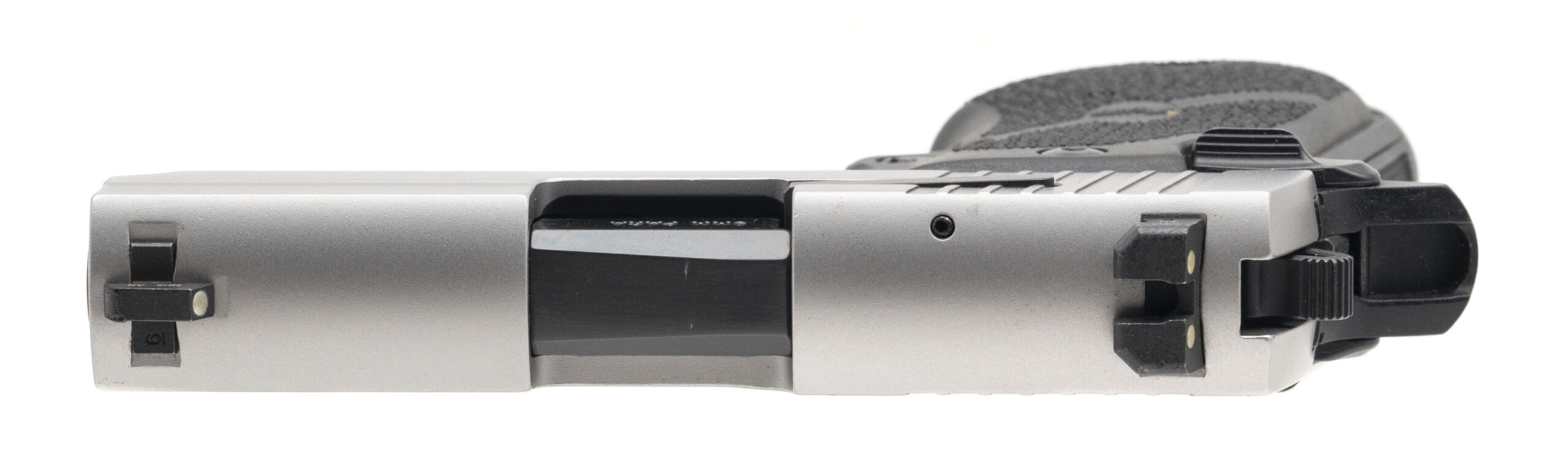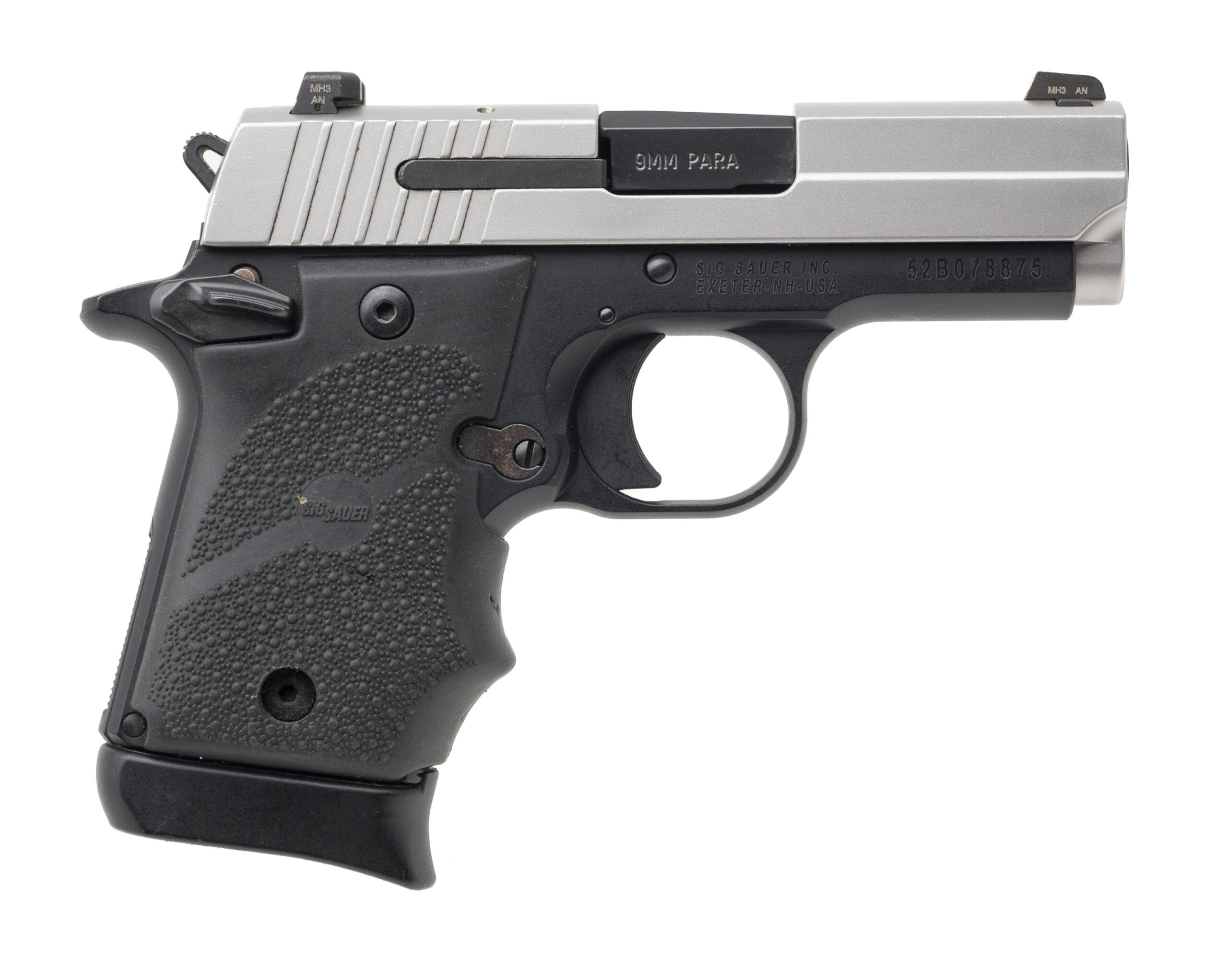 SN: 52B078875. Modern production, 9mm with a 3" barrel. Bore is bright with strong rifling. Two-tone alloy frame carry pistol with night sights, rubber grips, and ambidextrous safety controls. Overall condition is near excellent.