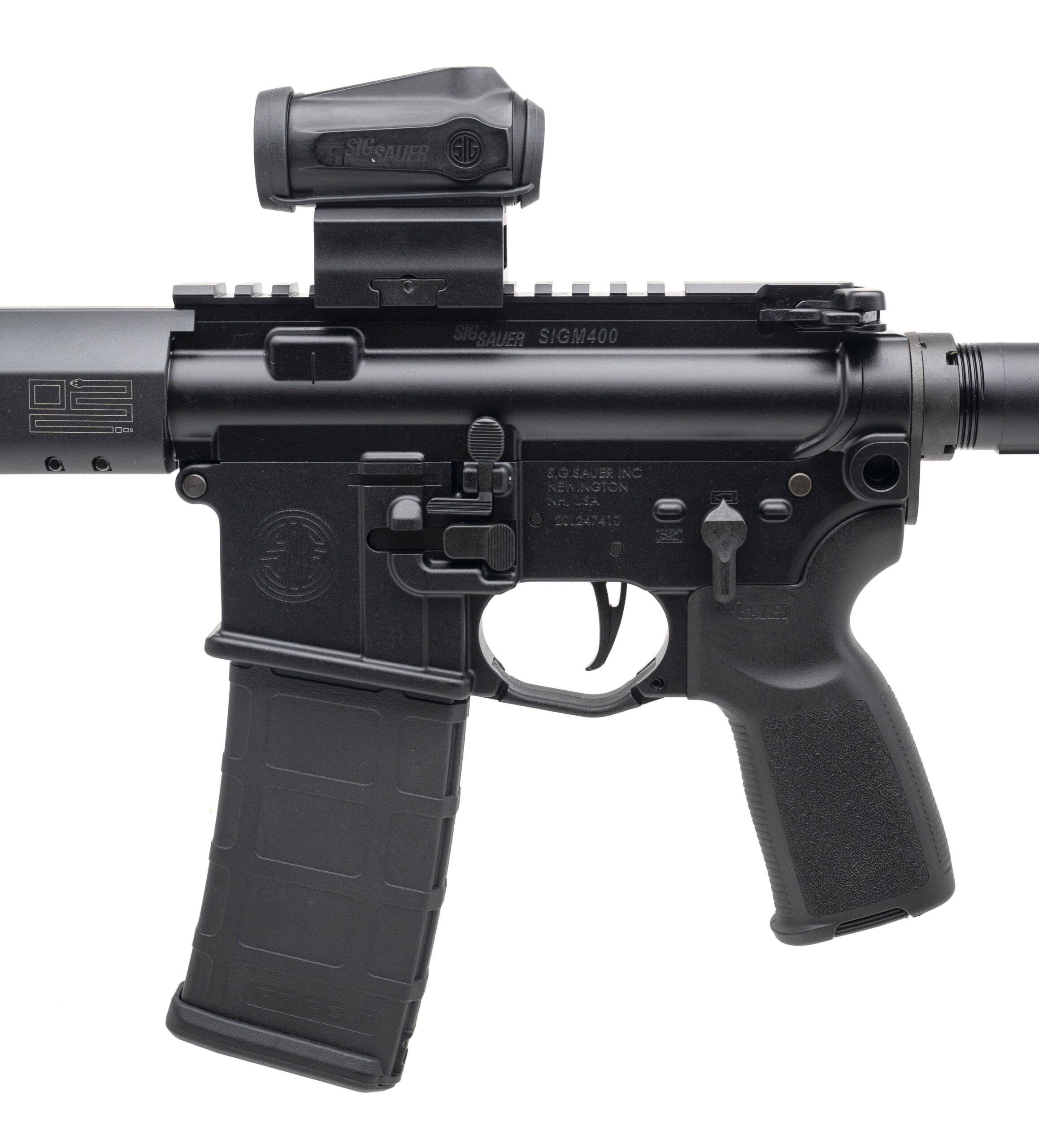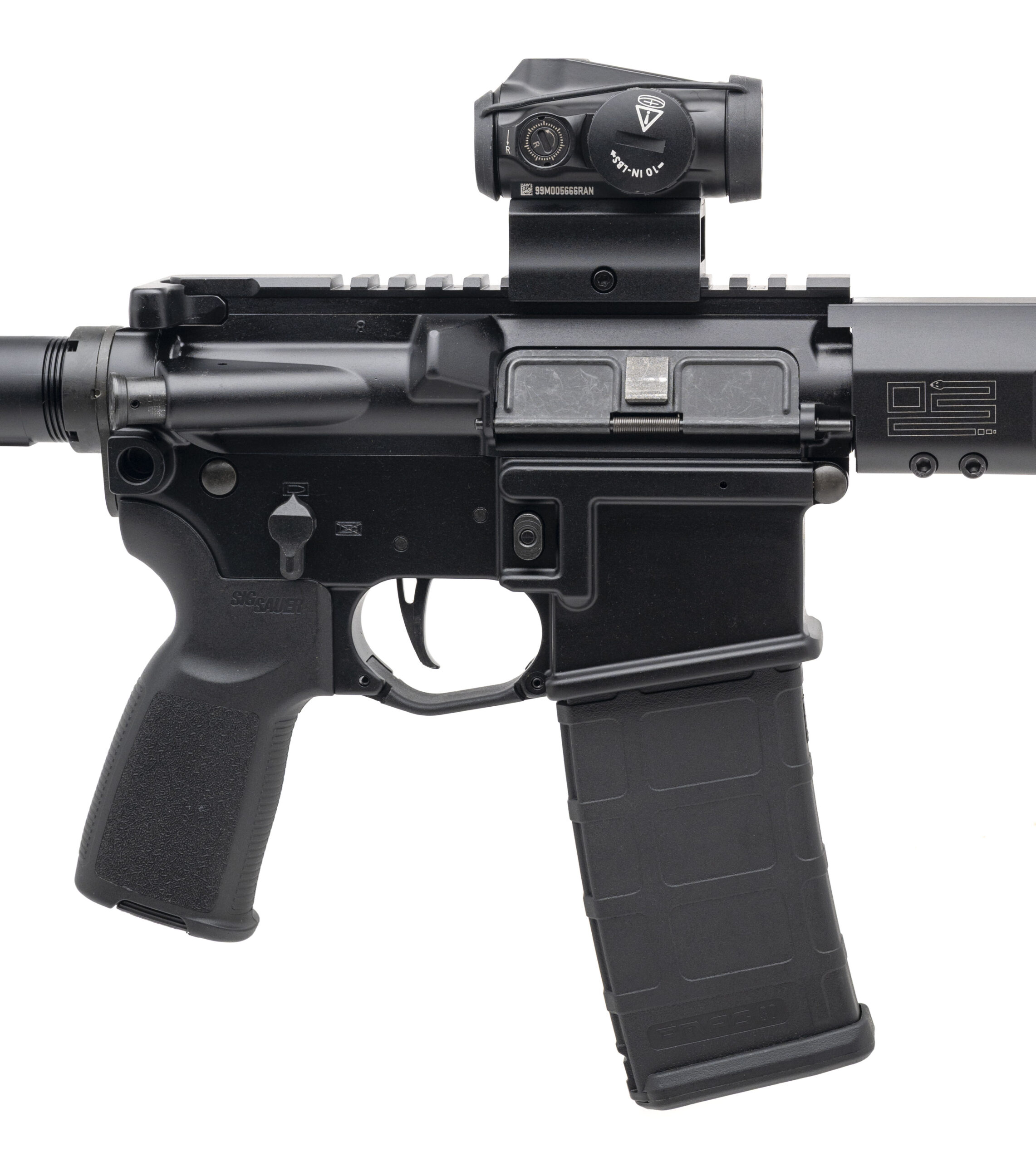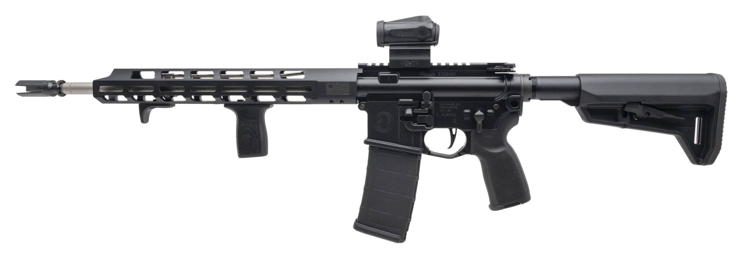 SN: 20L247410. Modern production, 5.56 with a 16" barrel. Bore is bright with strong rifling. Semi-auto tactical rifle with Sig Romeo-MSR red dot optic, Sig vertical grip kit, and a flat-faced trigger. Excellent condition overall.